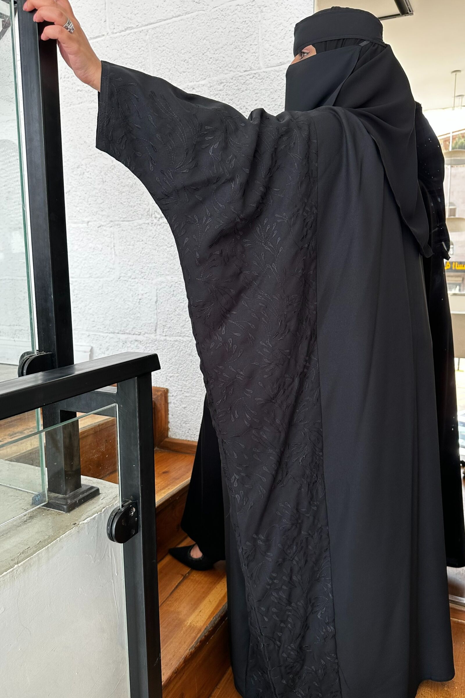 عبايه كتان نص بشت مندمج لها نطريز من جوانب
