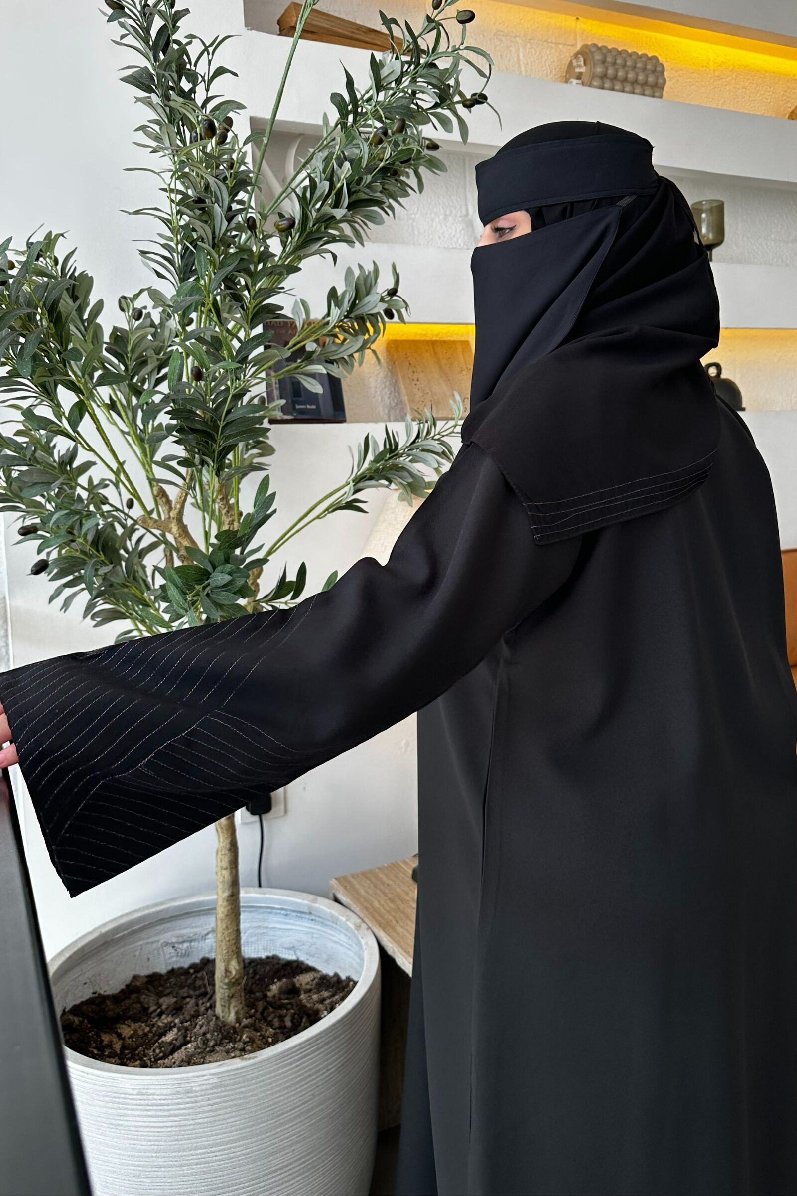 عبايه كويتي محدد أسود كلوش كم مطاط بتكسير