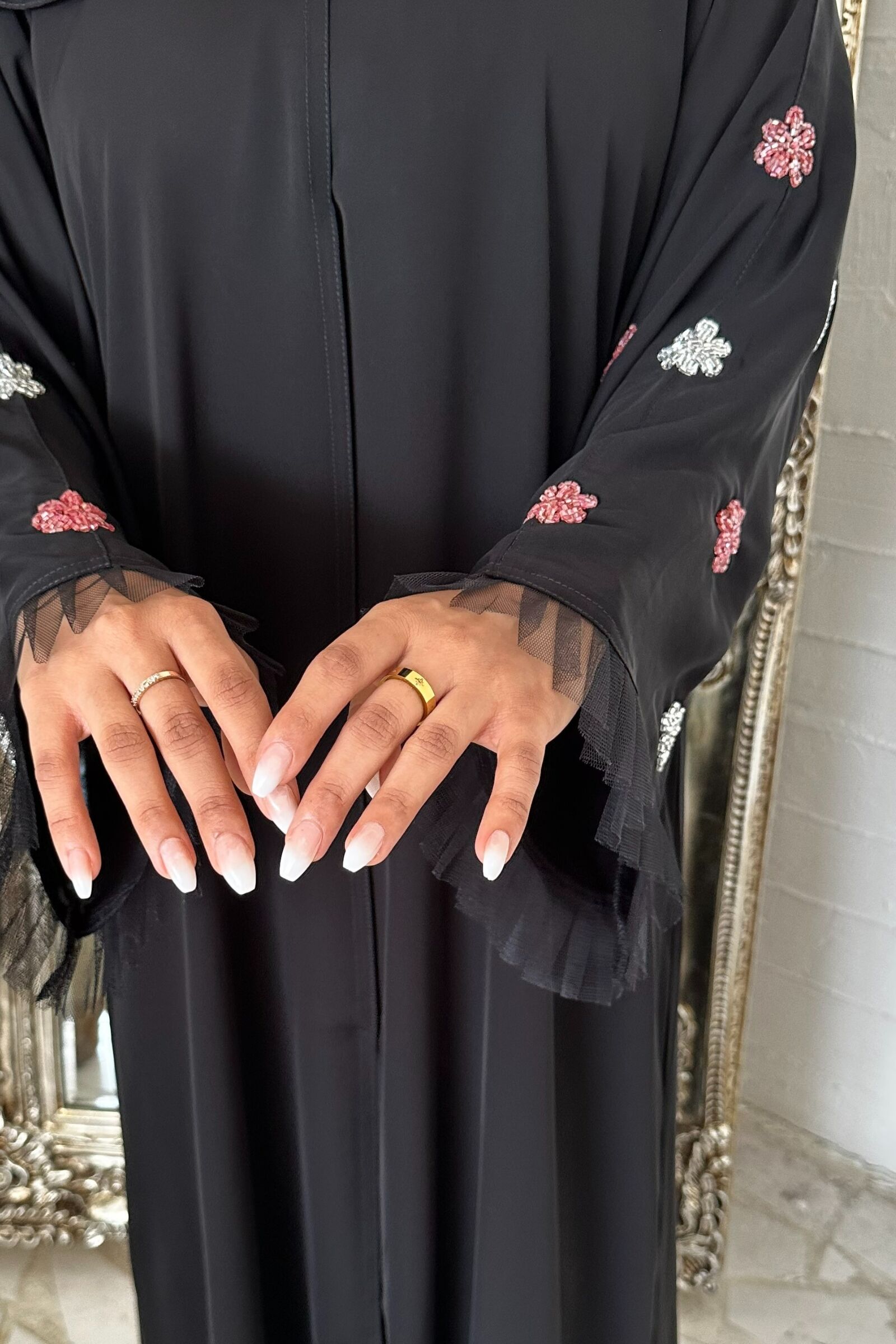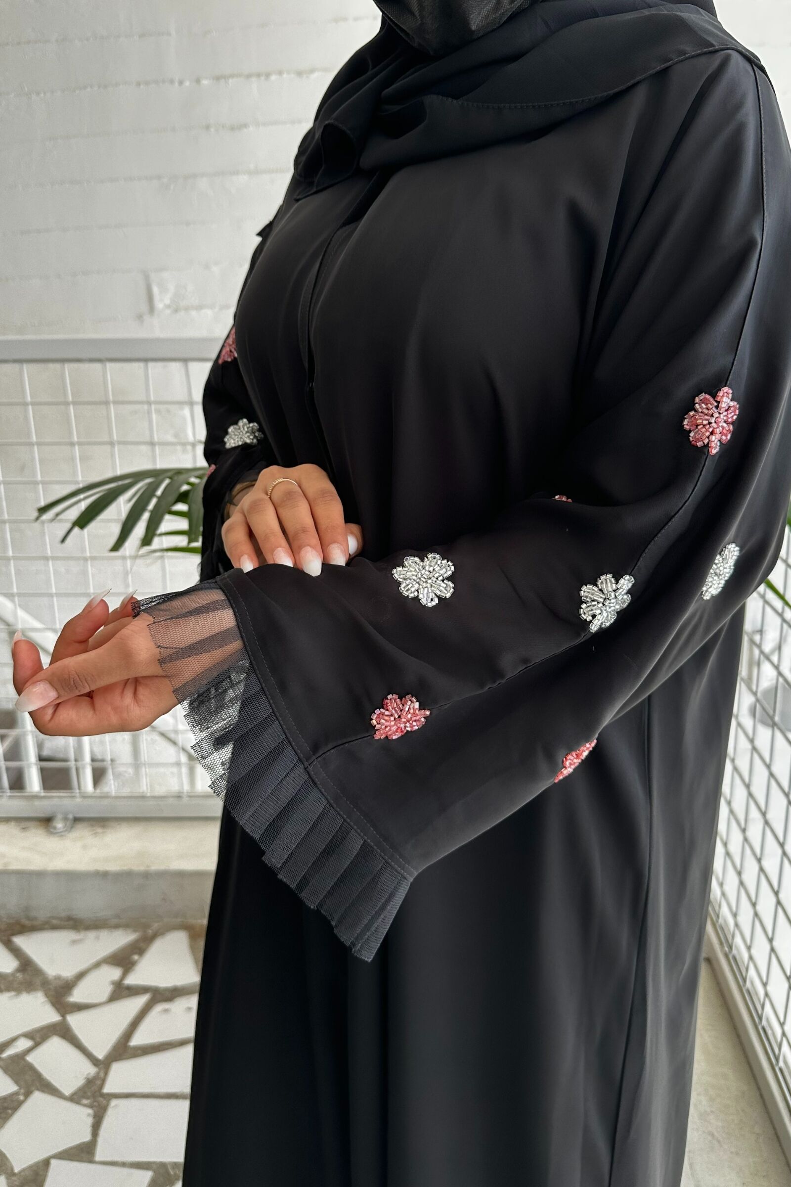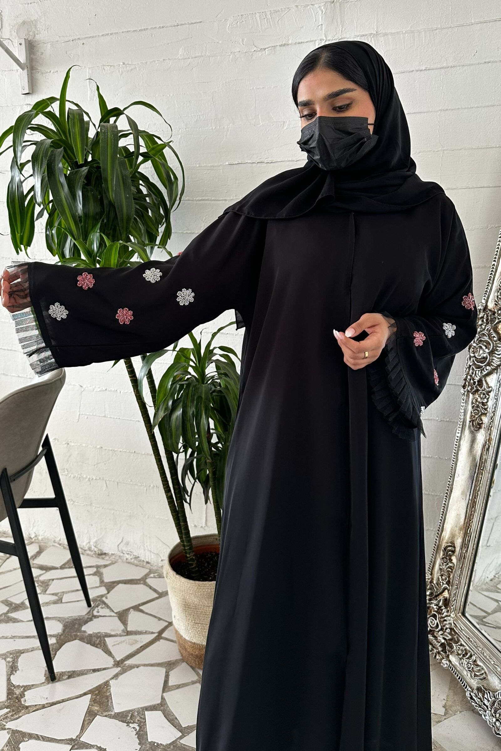 تألقي بإطلالة راقية وأنيقة مع عباية مميزة بشك ناعم على الأكمام. تضفي الأكمام المزينة بشك ناعم على شكل ورود بلون وردي لمسة من الأنوثة والجمال على التصميم العام للعباية. يوفر القماش المستخدم في هذه العباية الراحة والنعومة للمرتدية، مما يجعلها خيارًا مثاليًا لارتدائها في المناسبات الخاصة والاجتماعية.