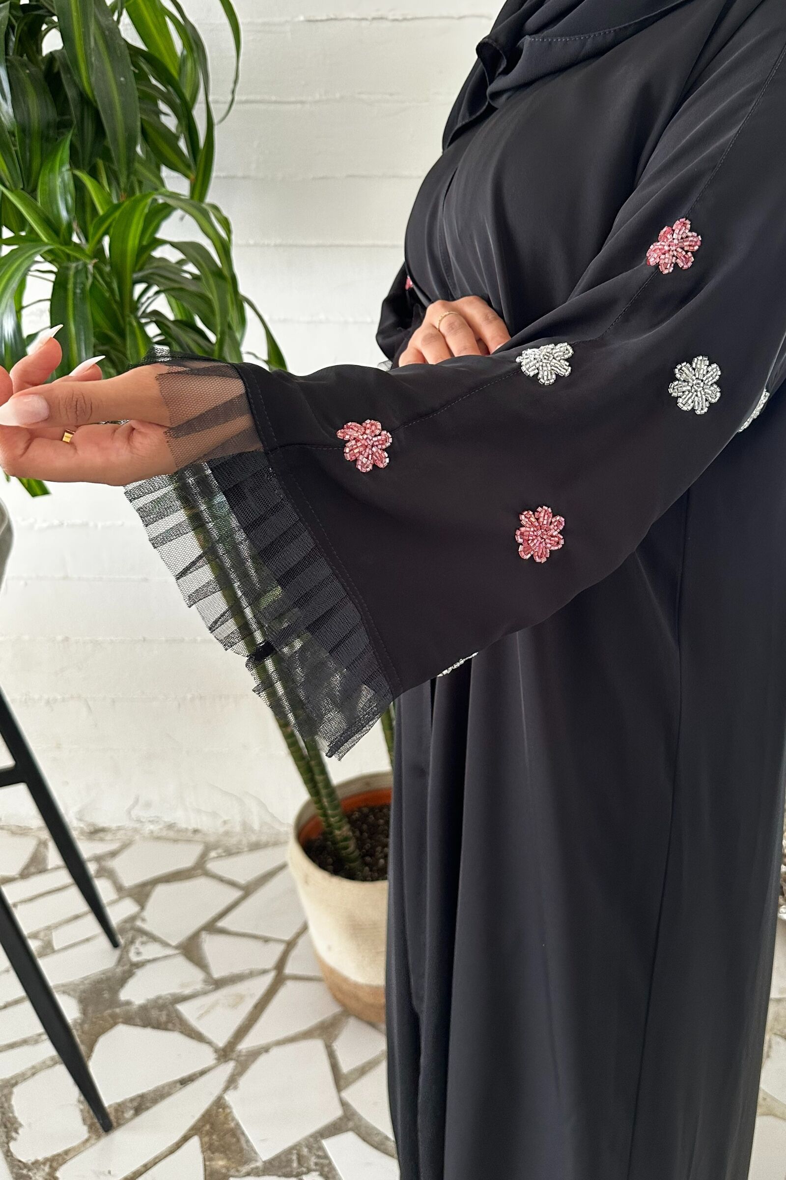 عبايه نواعم بشك على اكمام على شكل ورود بلون وردي