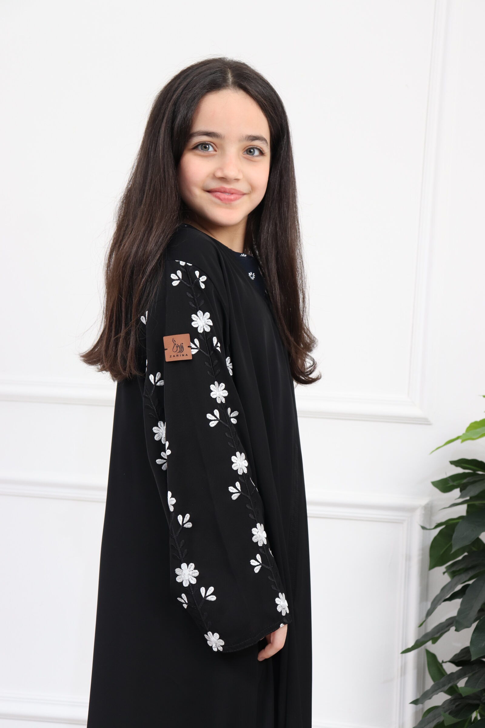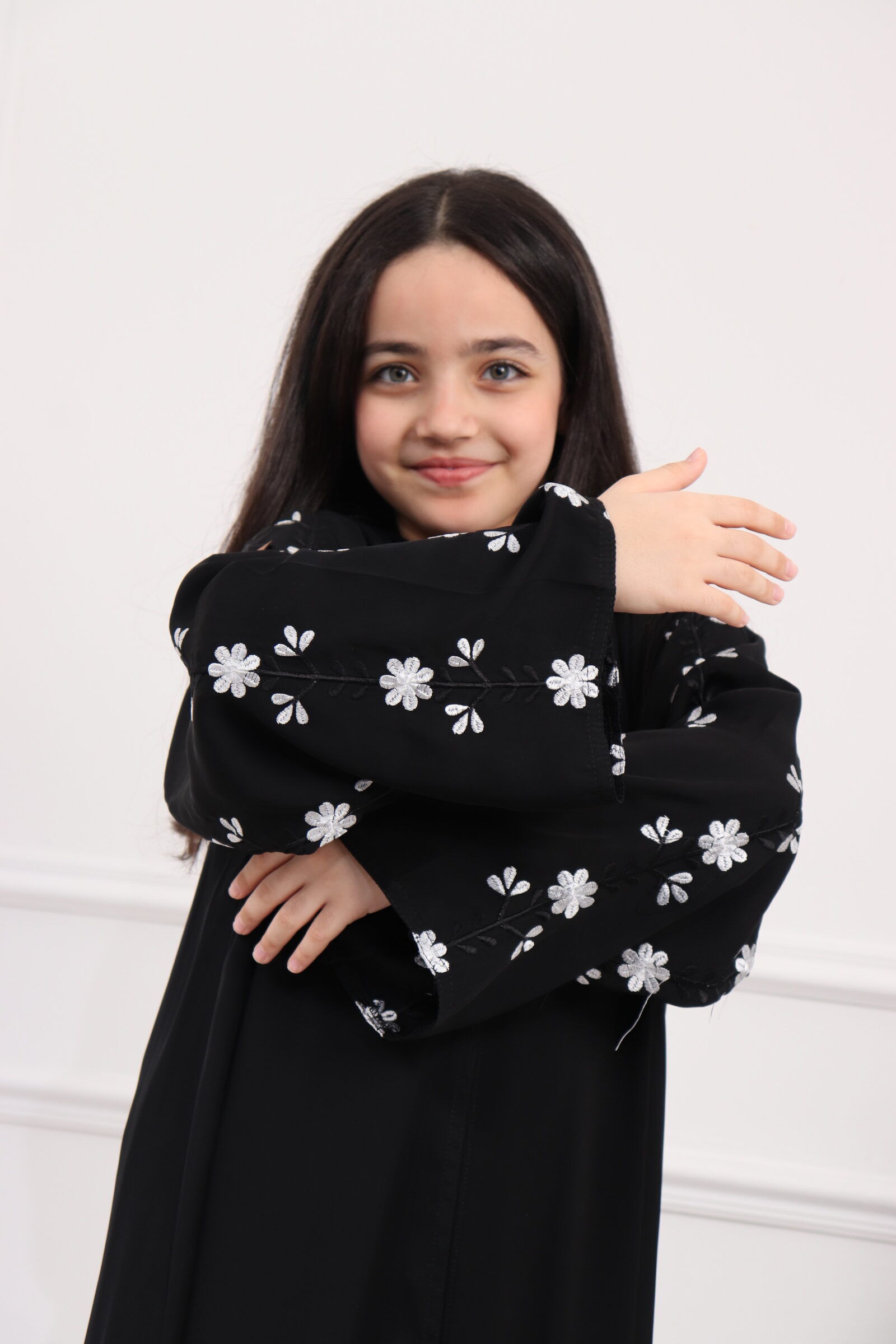 عباية بناتي بتطريز على الأكمام بورود أبيض وأسود