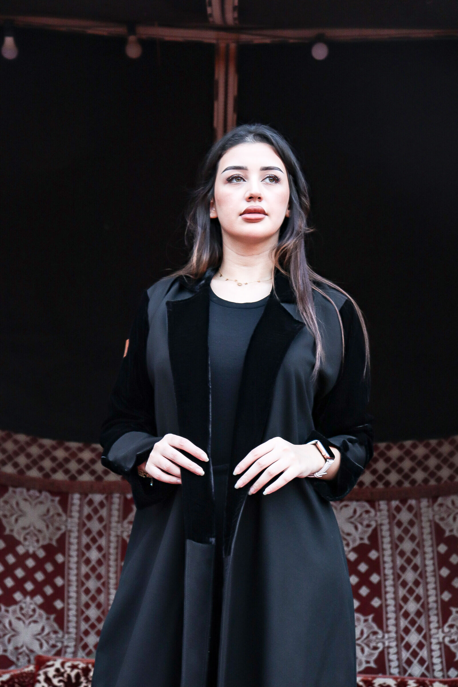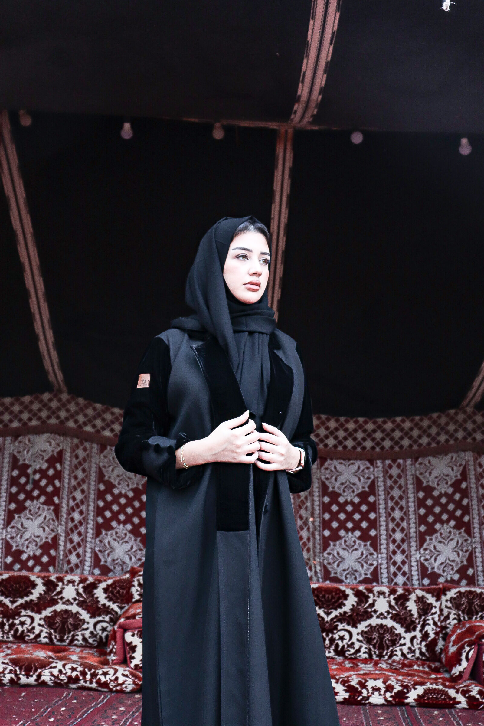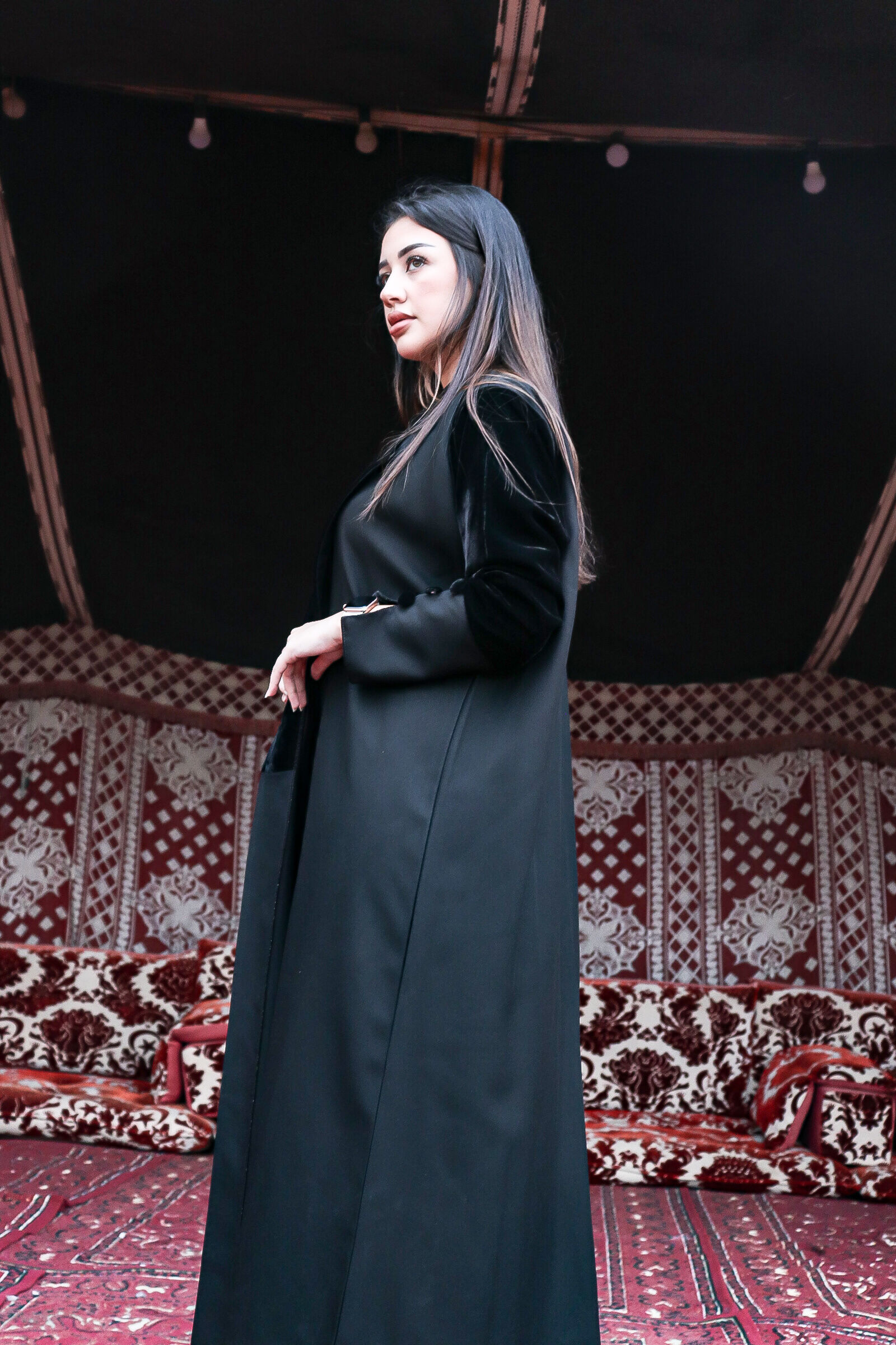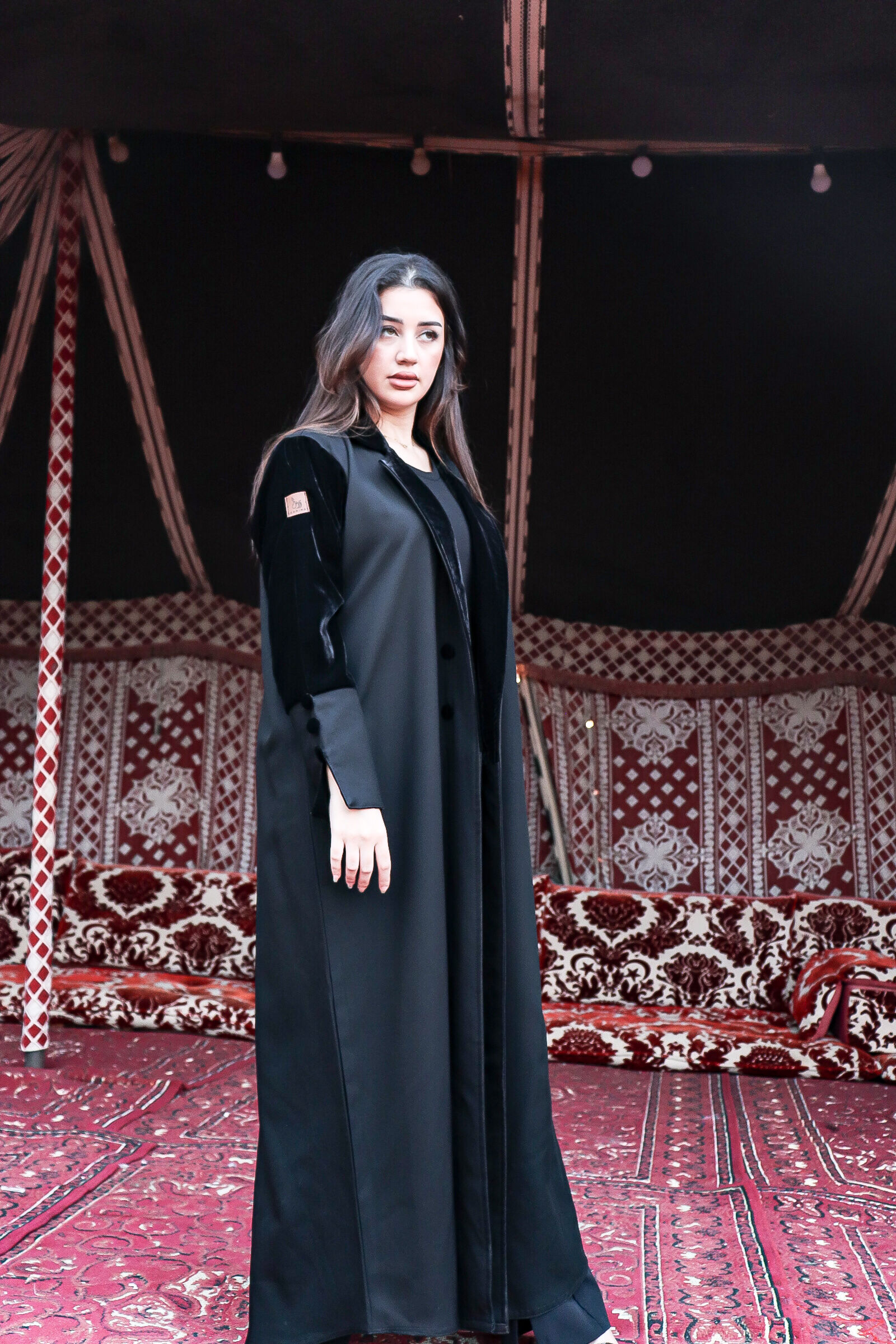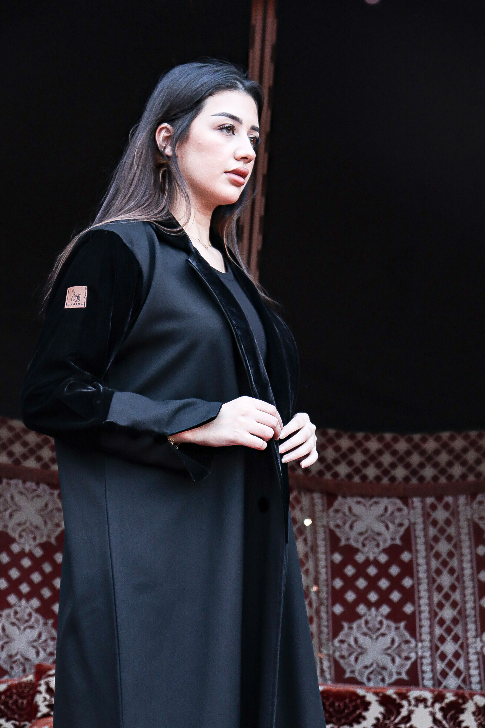 عباية سوداء شتوية بقصة ربع كلوش، تأتي العباية مزيج مابين قماش المخمل وكتان الفاخر، بكسرة مميزة من قماش المخمل