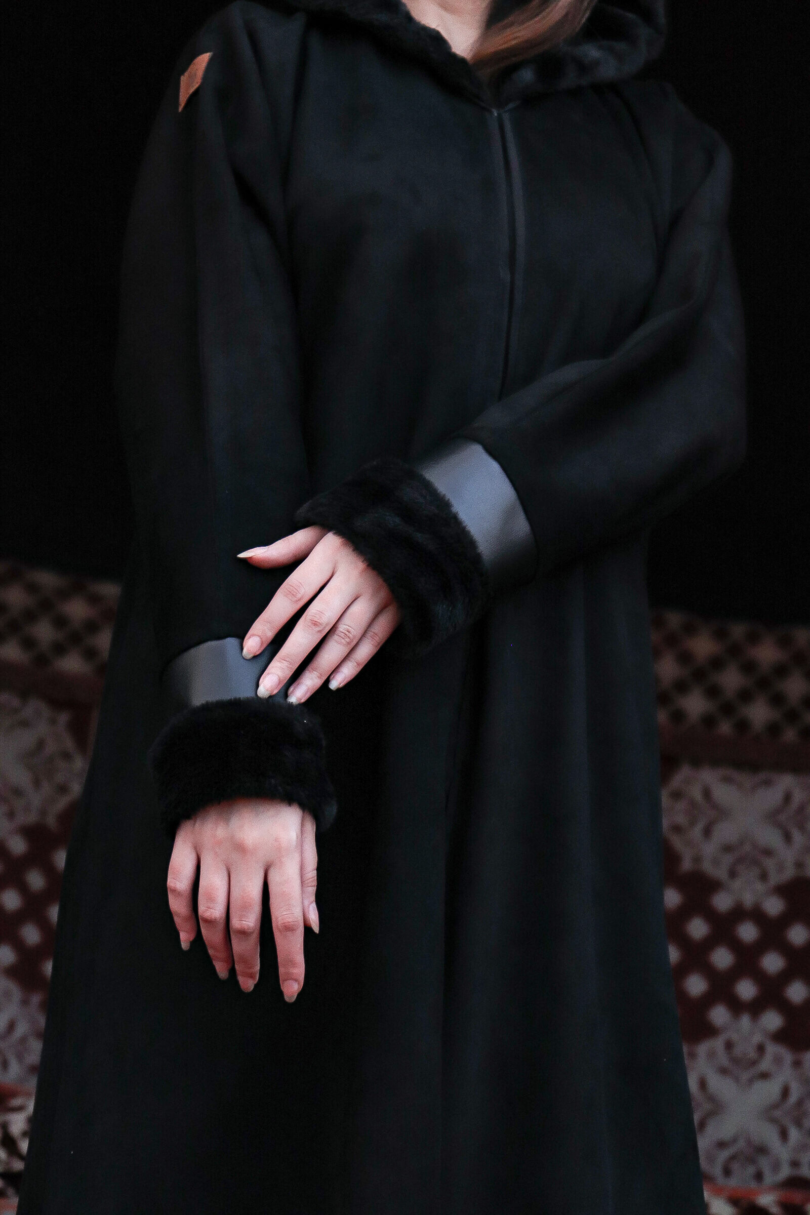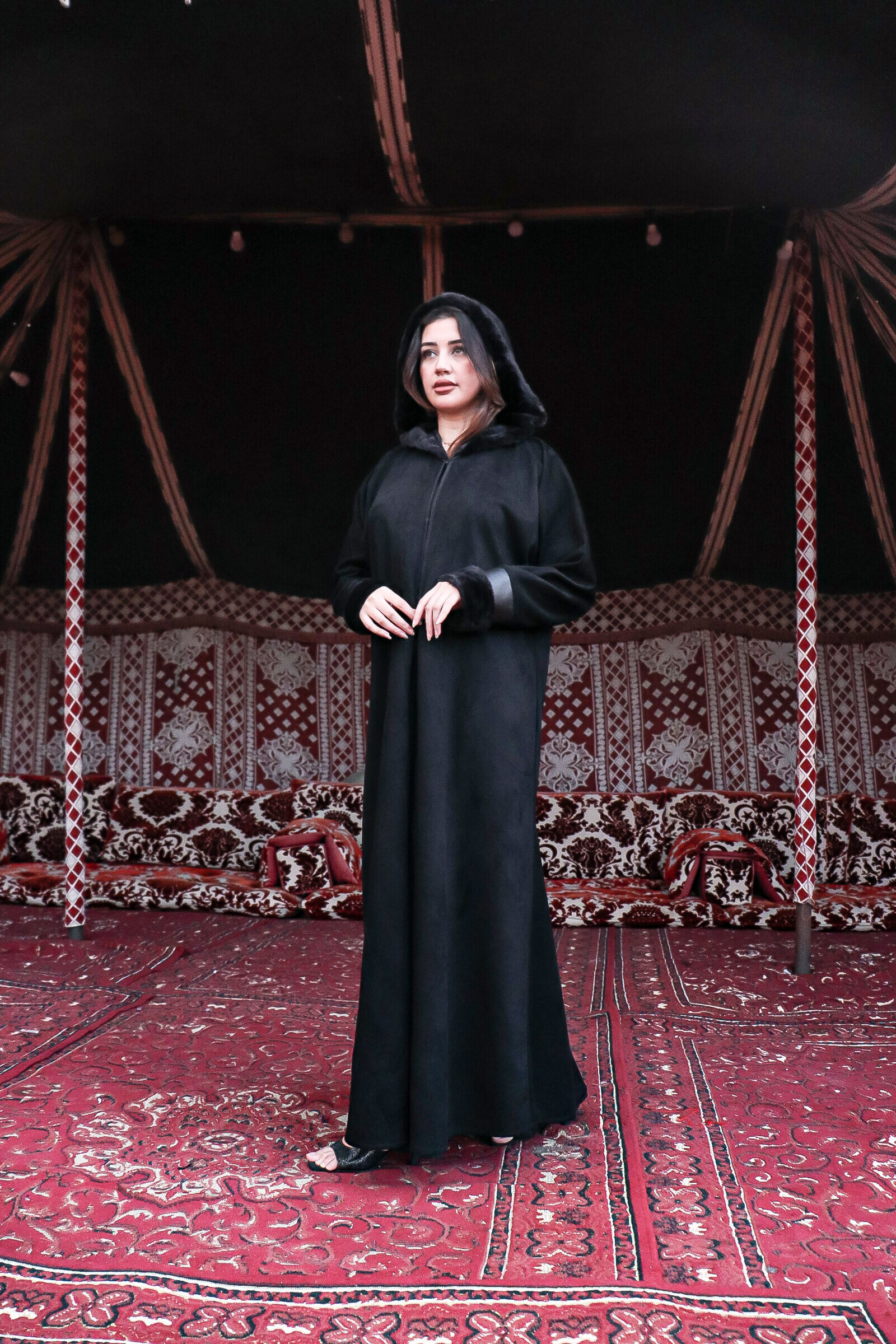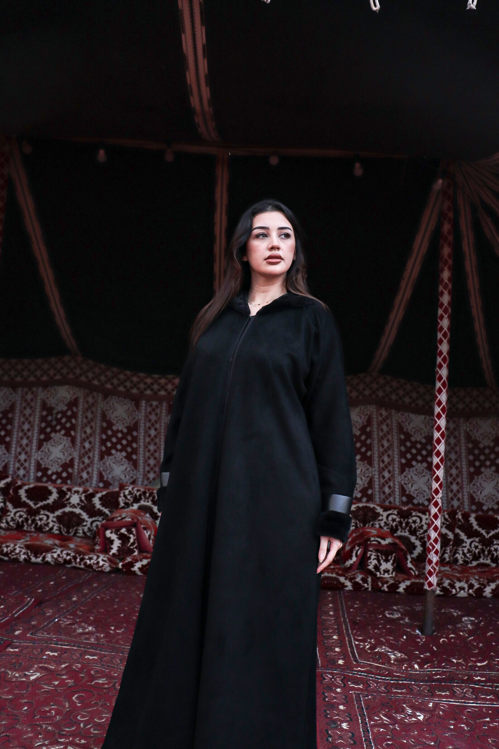 عباية بطبقة داخلية مع ربطة جانبية بكم جلد مفتوحة