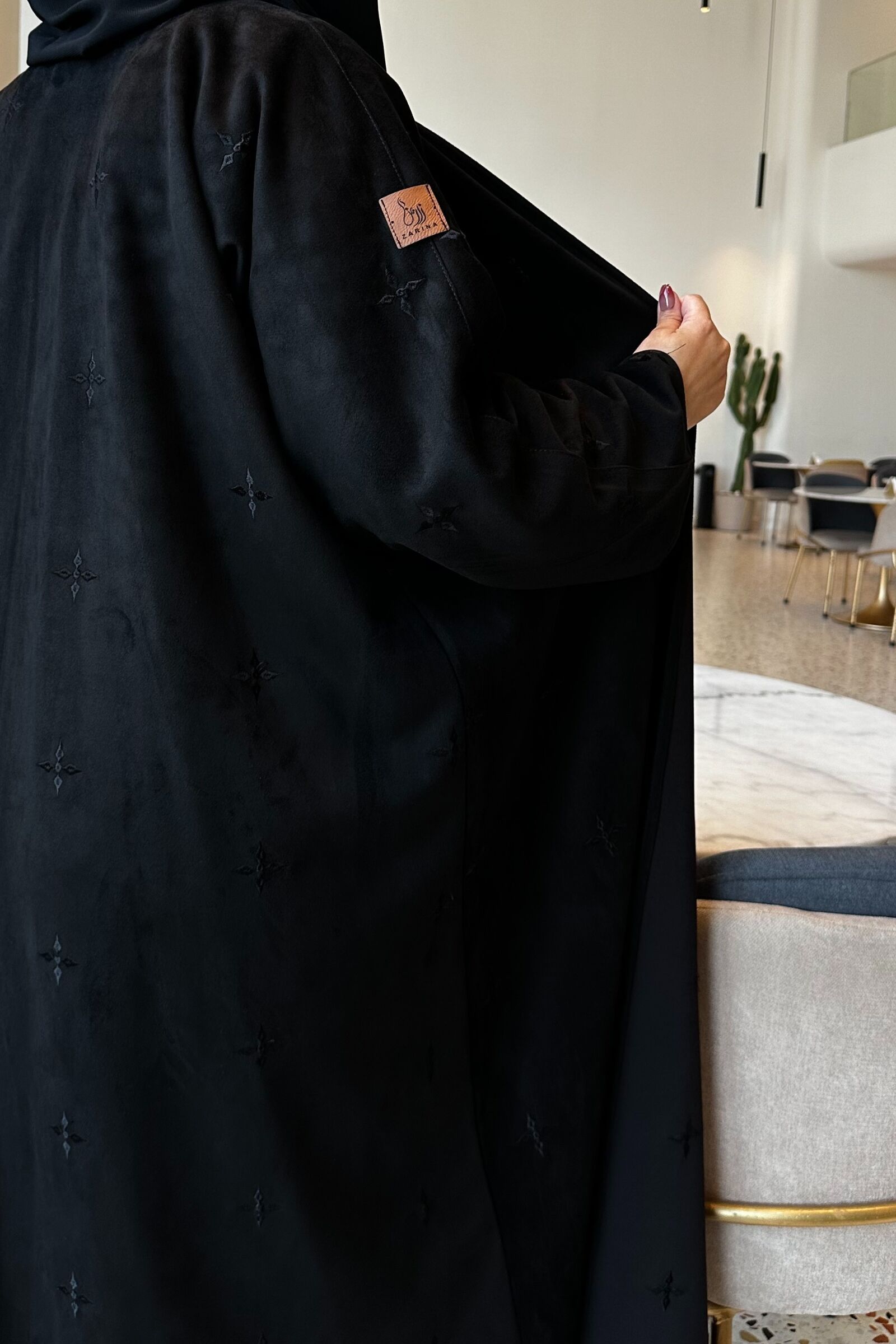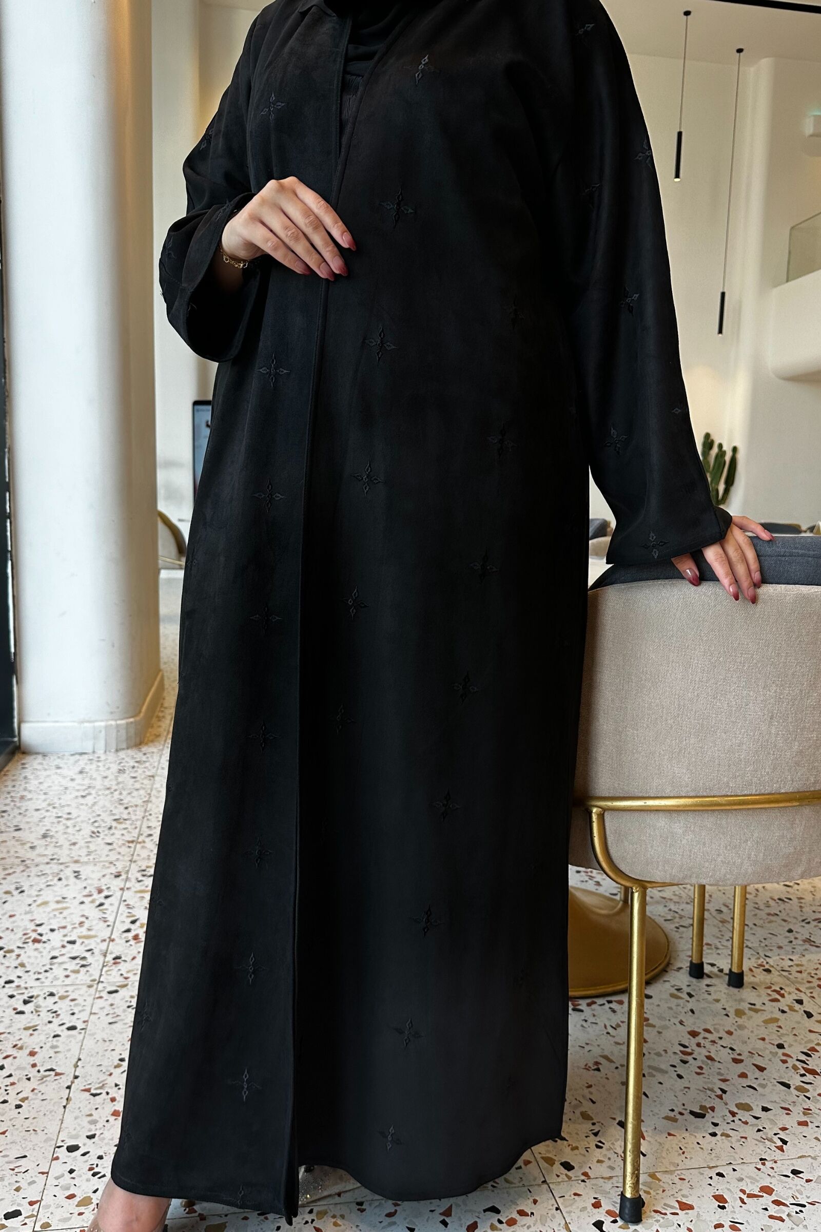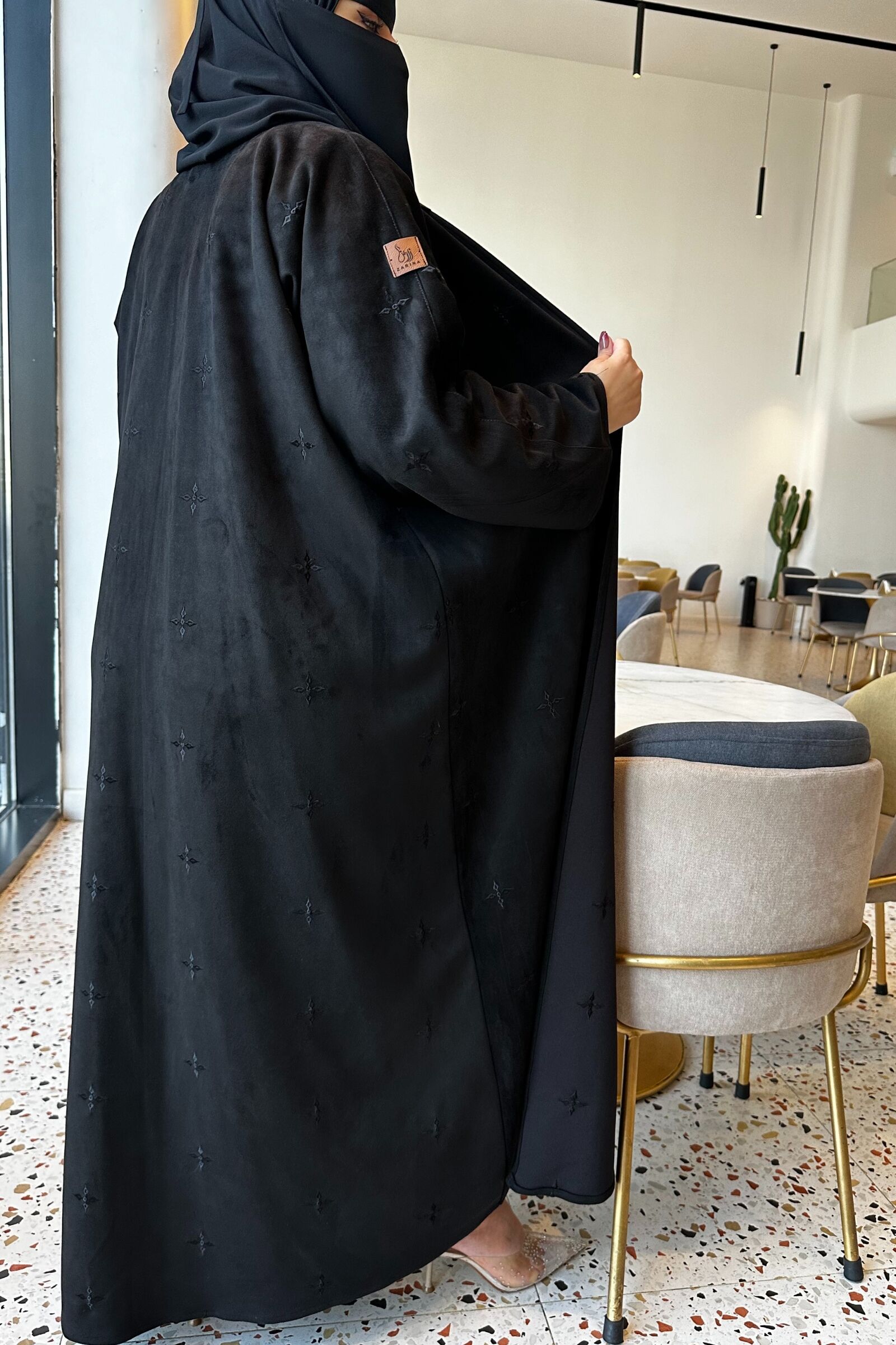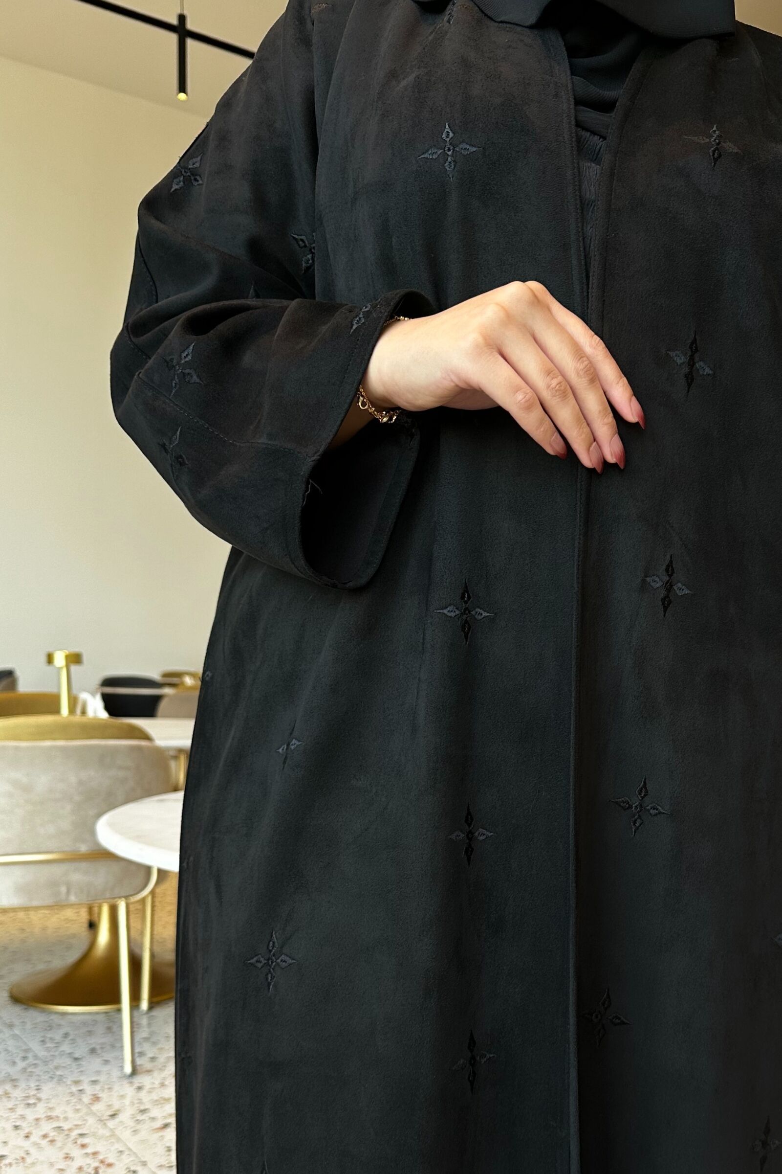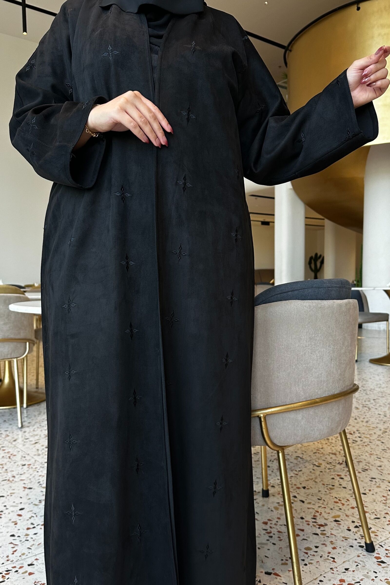 عباية مخمل بياقه كلوش بتطريز شك ابيض على اكمام