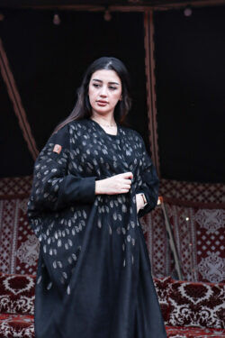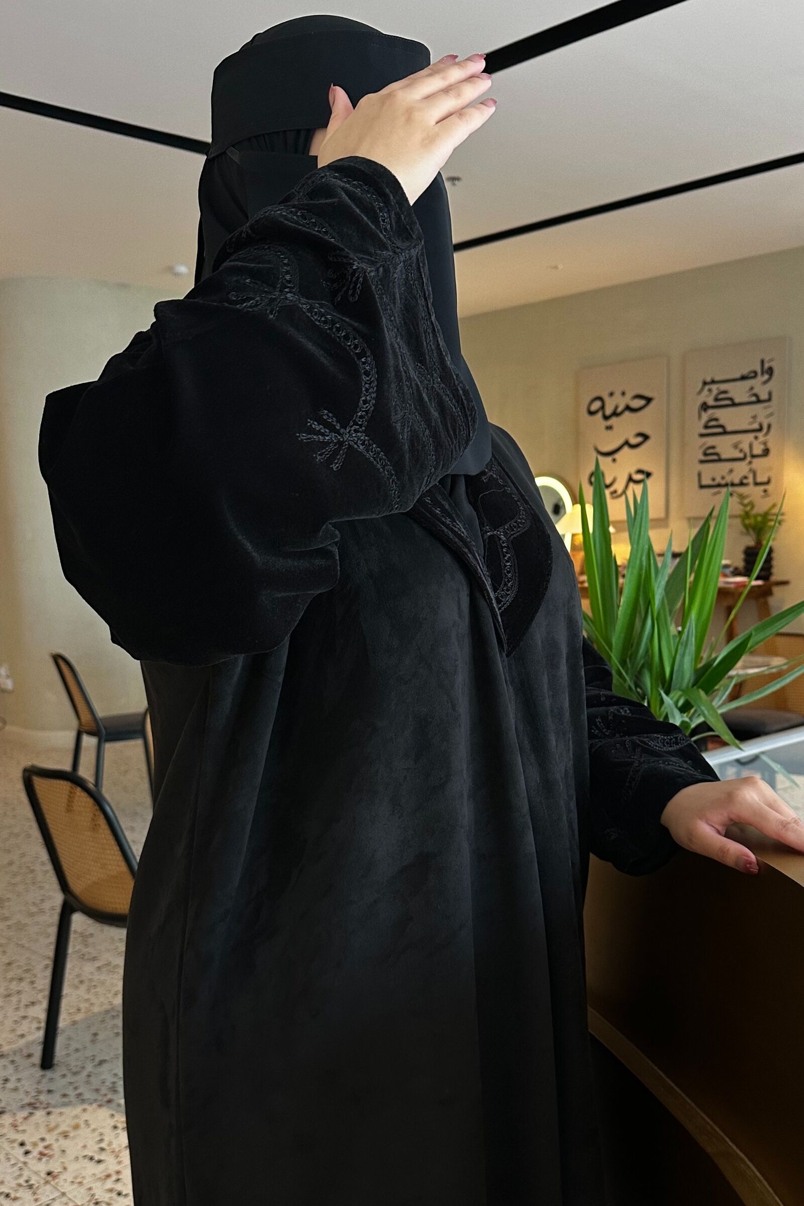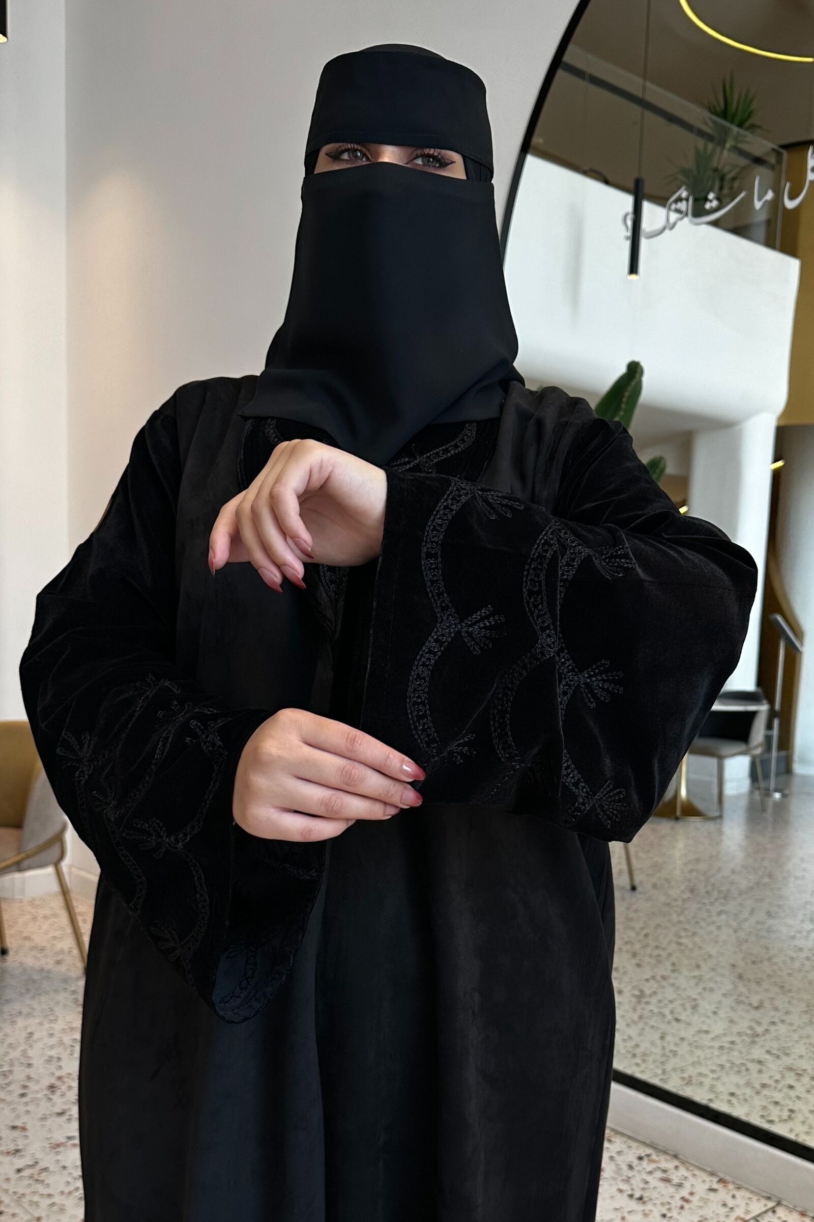 تم تزيينها بتداخل المخمل و الشامواه و الاكمام من قماش المخمل الاسود الراقي الذي سيزيد من جمالية ظهوركِ . لا تتردي و أضيفيها الآن إلى دولاب العبايات و كوني الكشخة أينما ذهبتِ !