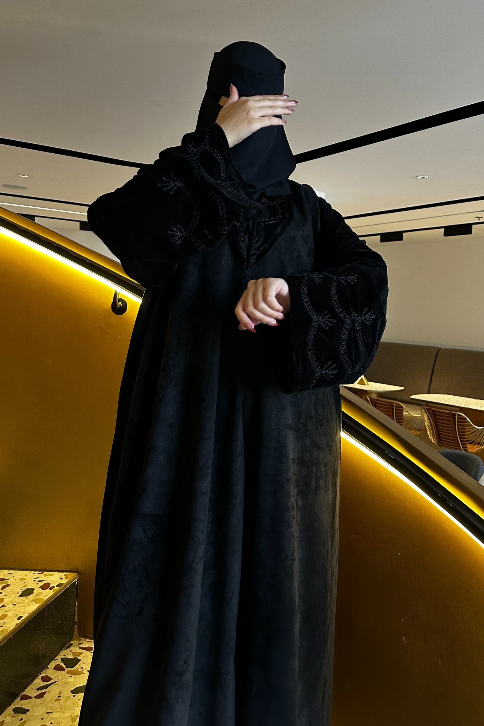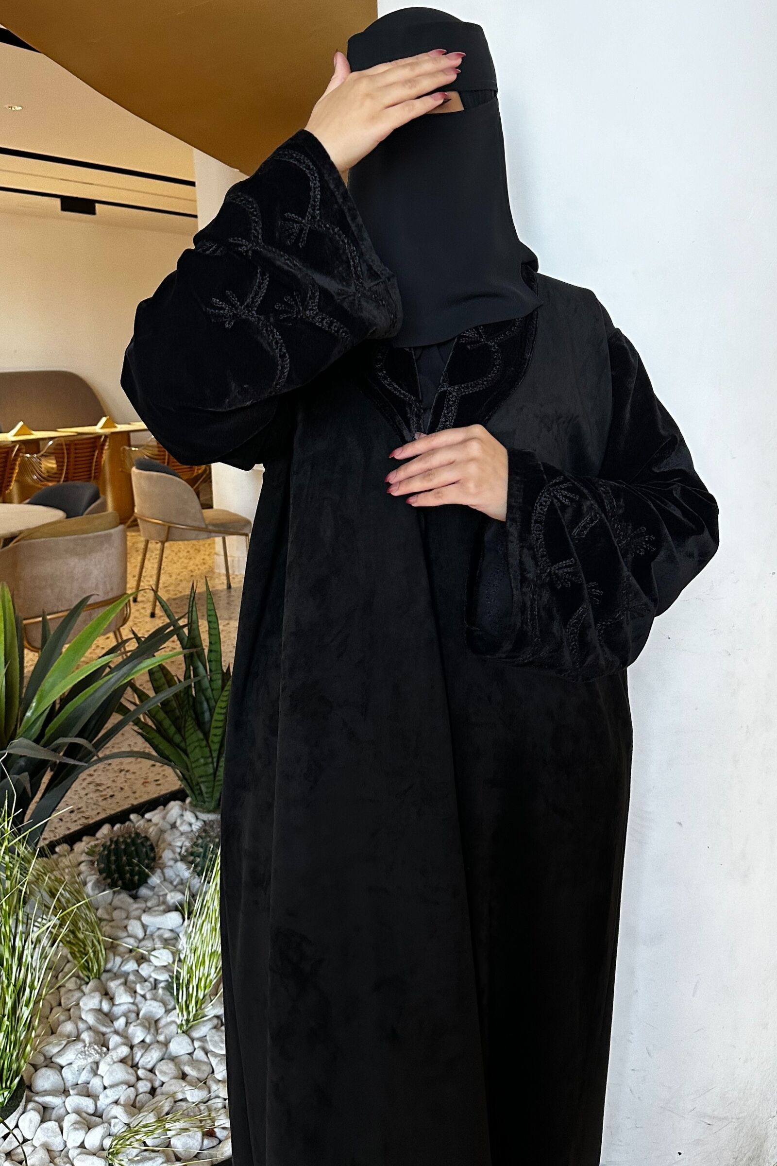 عباية مخمل بتطريز شك ابيض على اكتاف