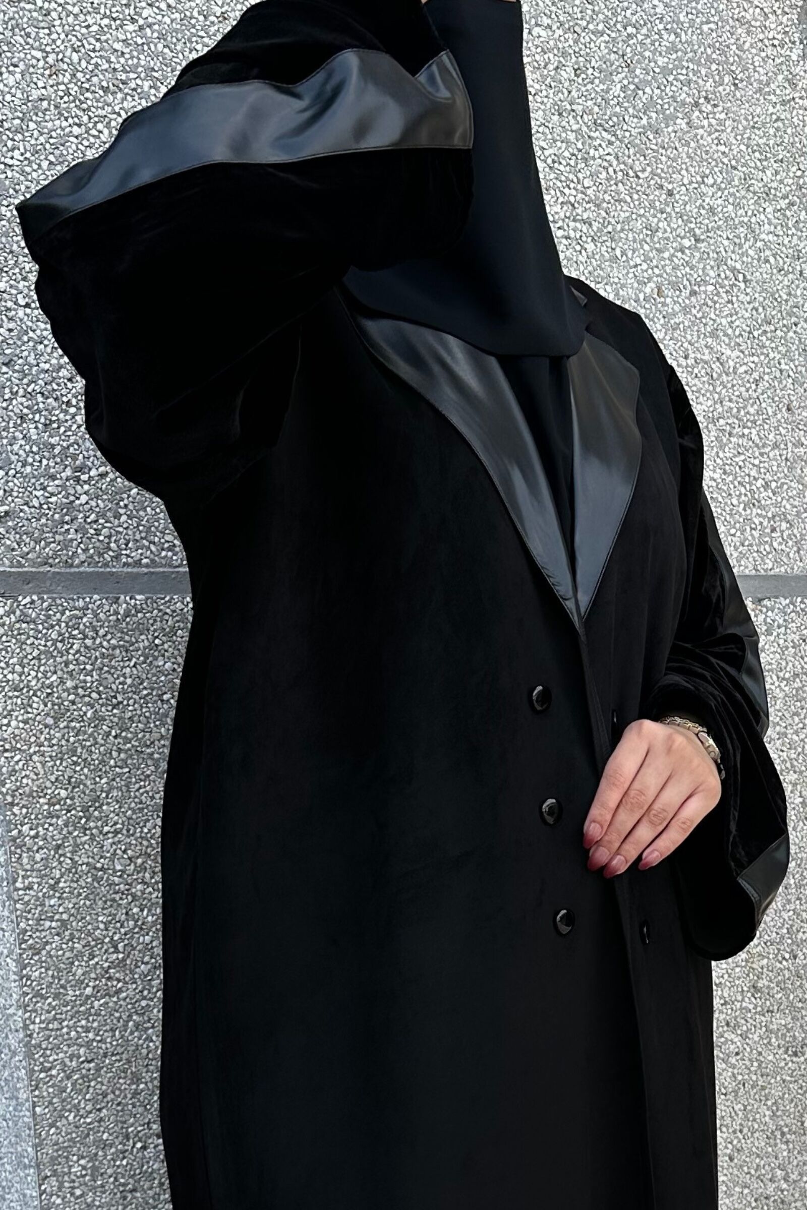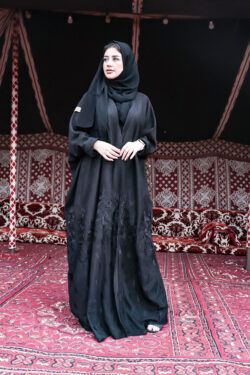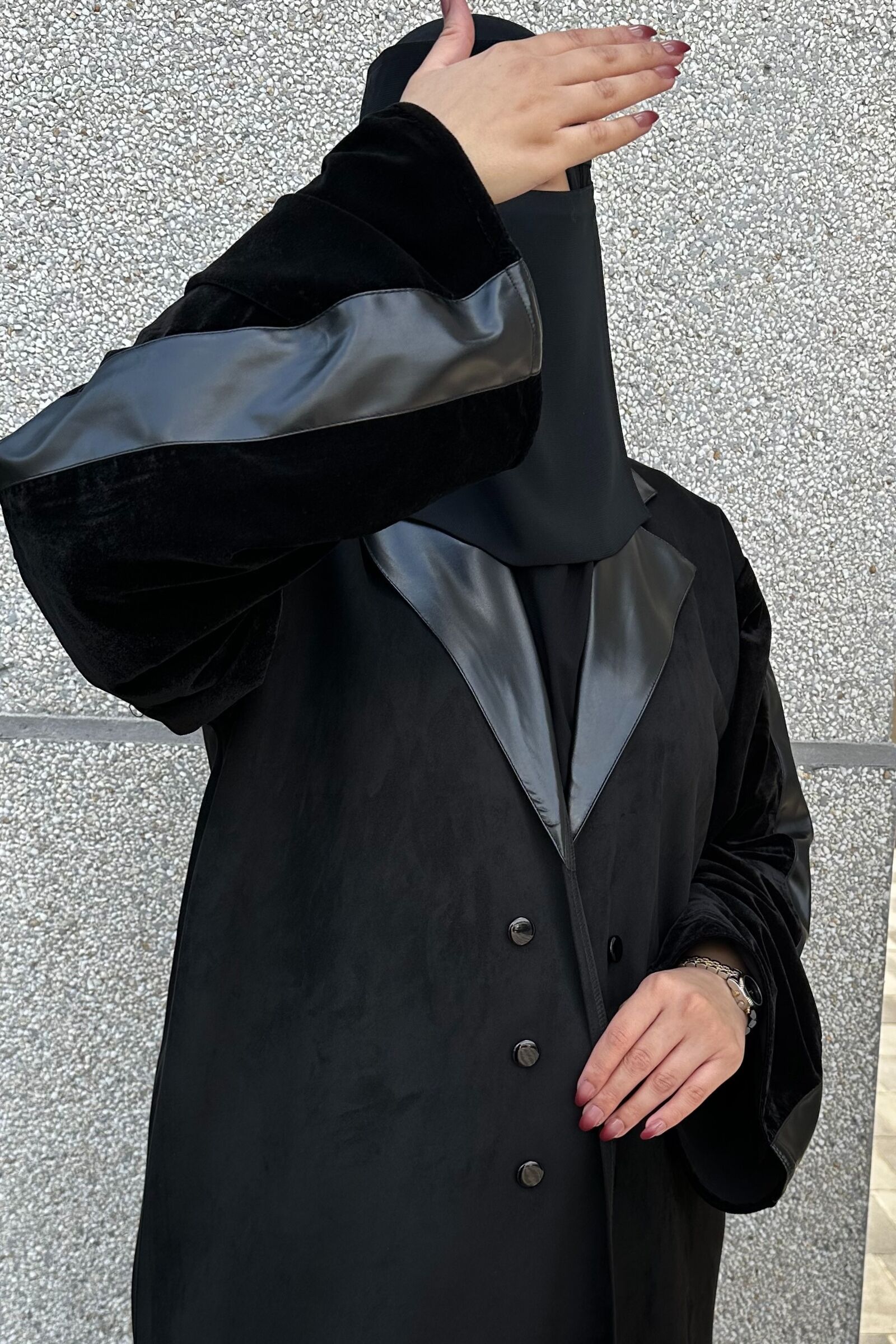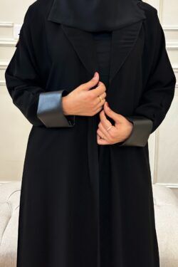 تم تزيينها بتداخل المخمل و الشامواه و الاكمام من قماش المخمل الاسود ومحدده بجلد على اكتاف ولياقه راقي الذي سيزيد من جمالية ظهوركِ . لا تتردي و أضيفيها الآن إلى دولاب العبايات و كوني الكشخة أينما ذهبتِ !