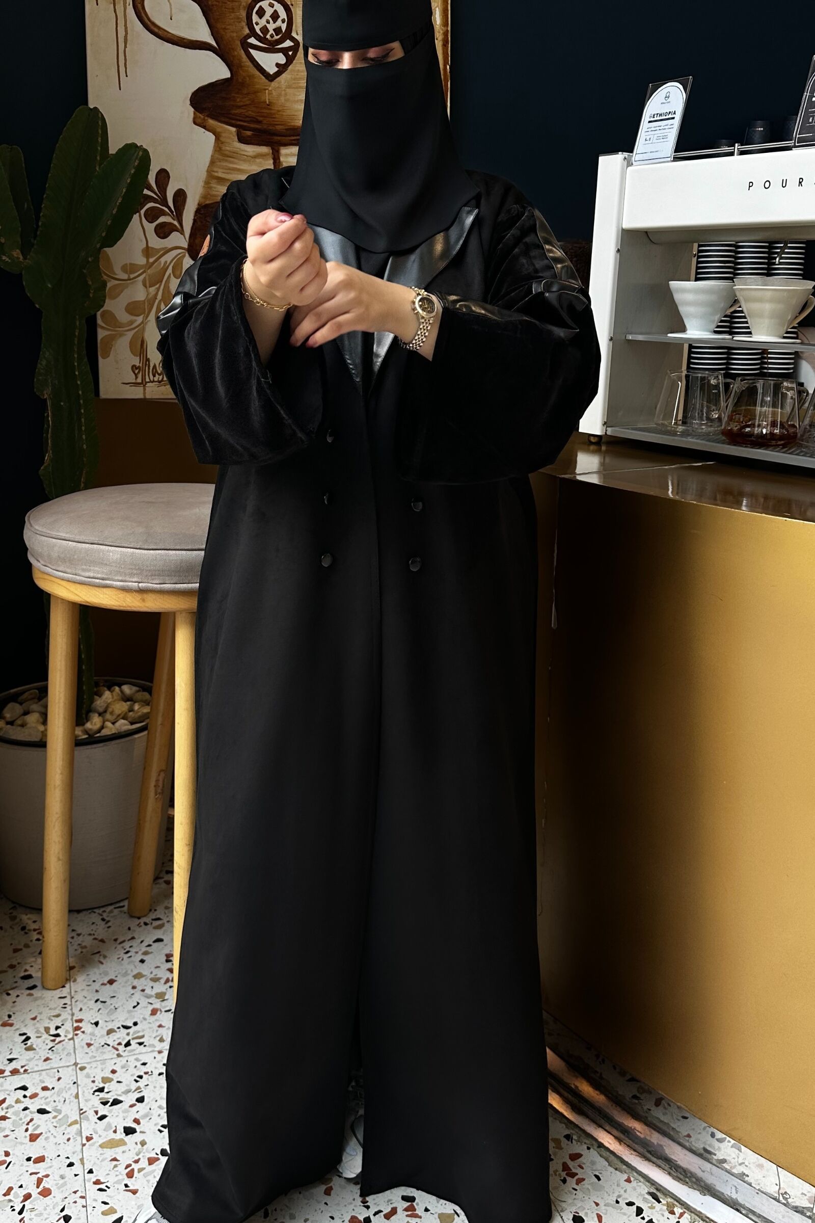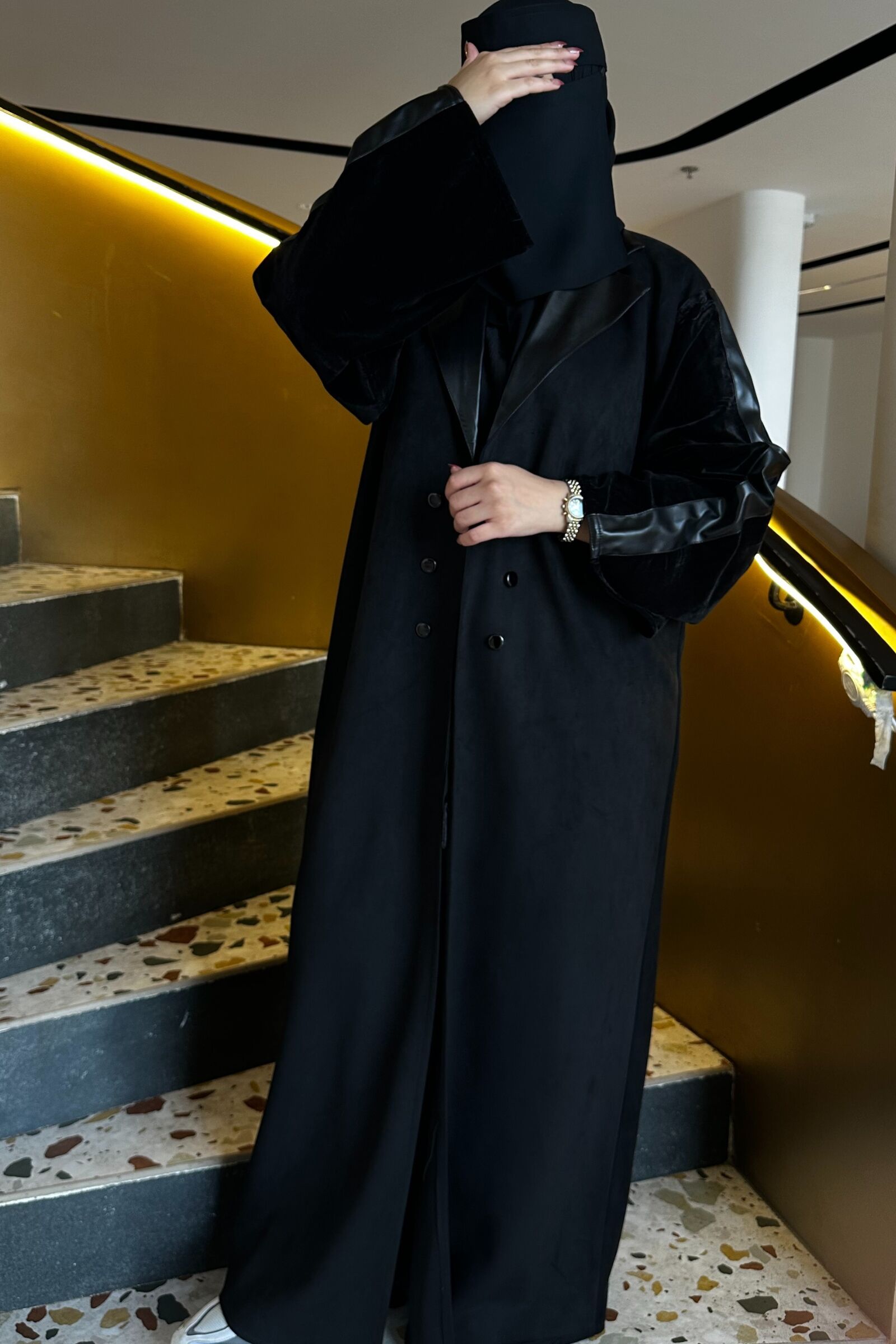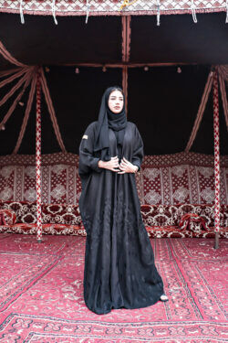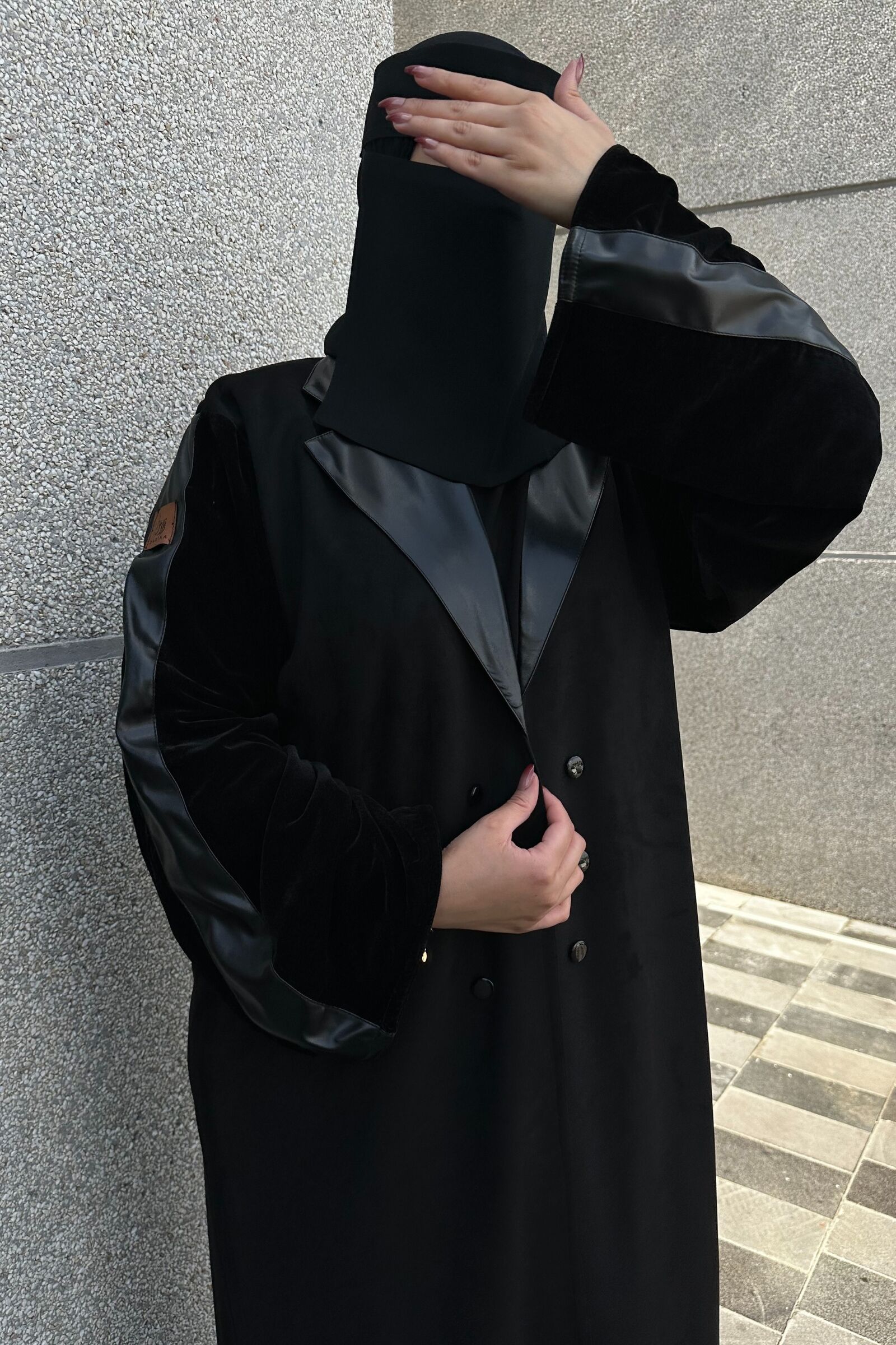 تم تزيينها بتداخل المخمل و الشامواه و الاكمام من قماش المخمل الاسود ومحدده بجلد على اكتاف ولياقه راقي الذي سيزيد من جمالية ظهوركِ . لا تتردي و أضيفيها الآن إلى دولاب العبايات و كوني الكشخة أينما ذهبتِ !