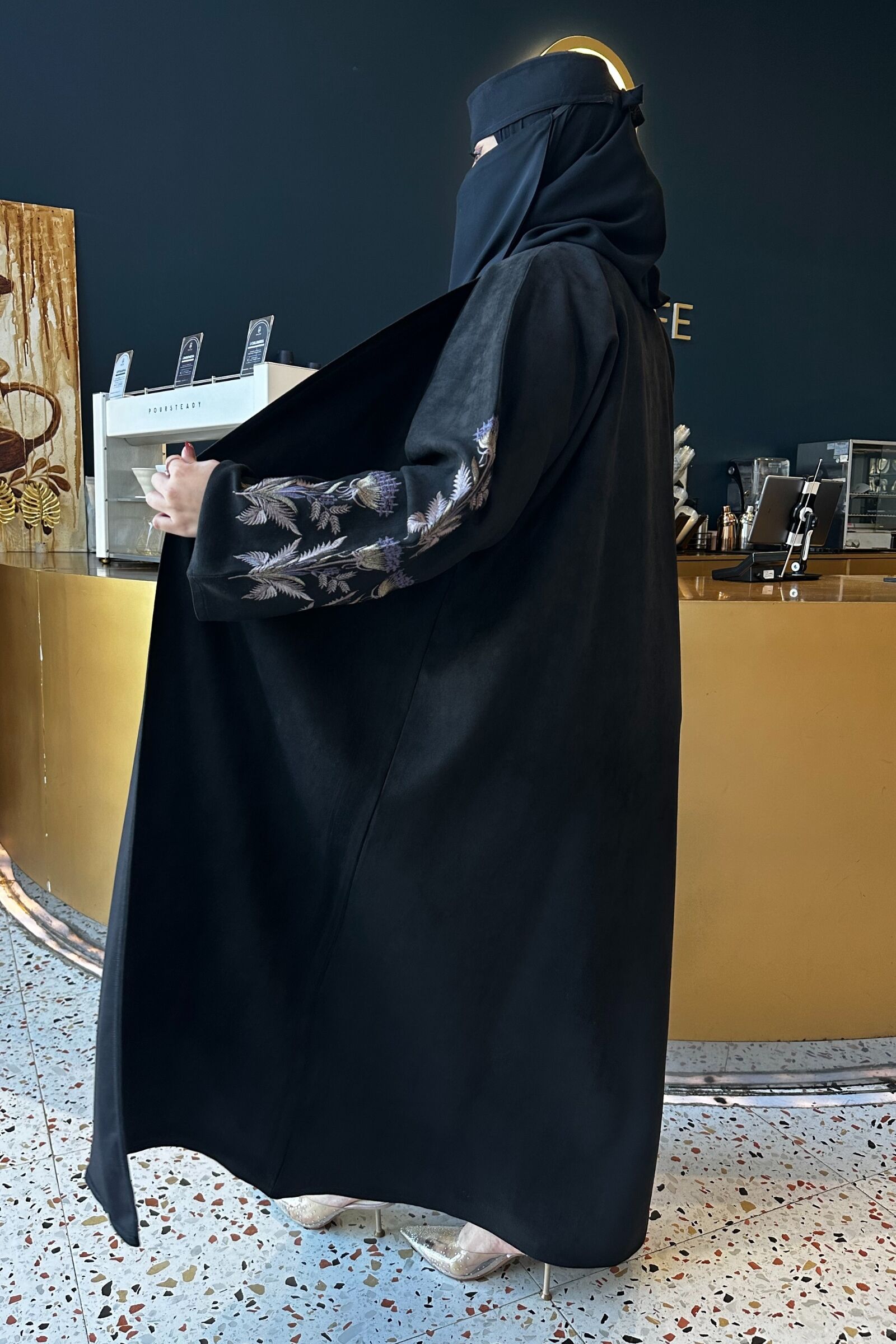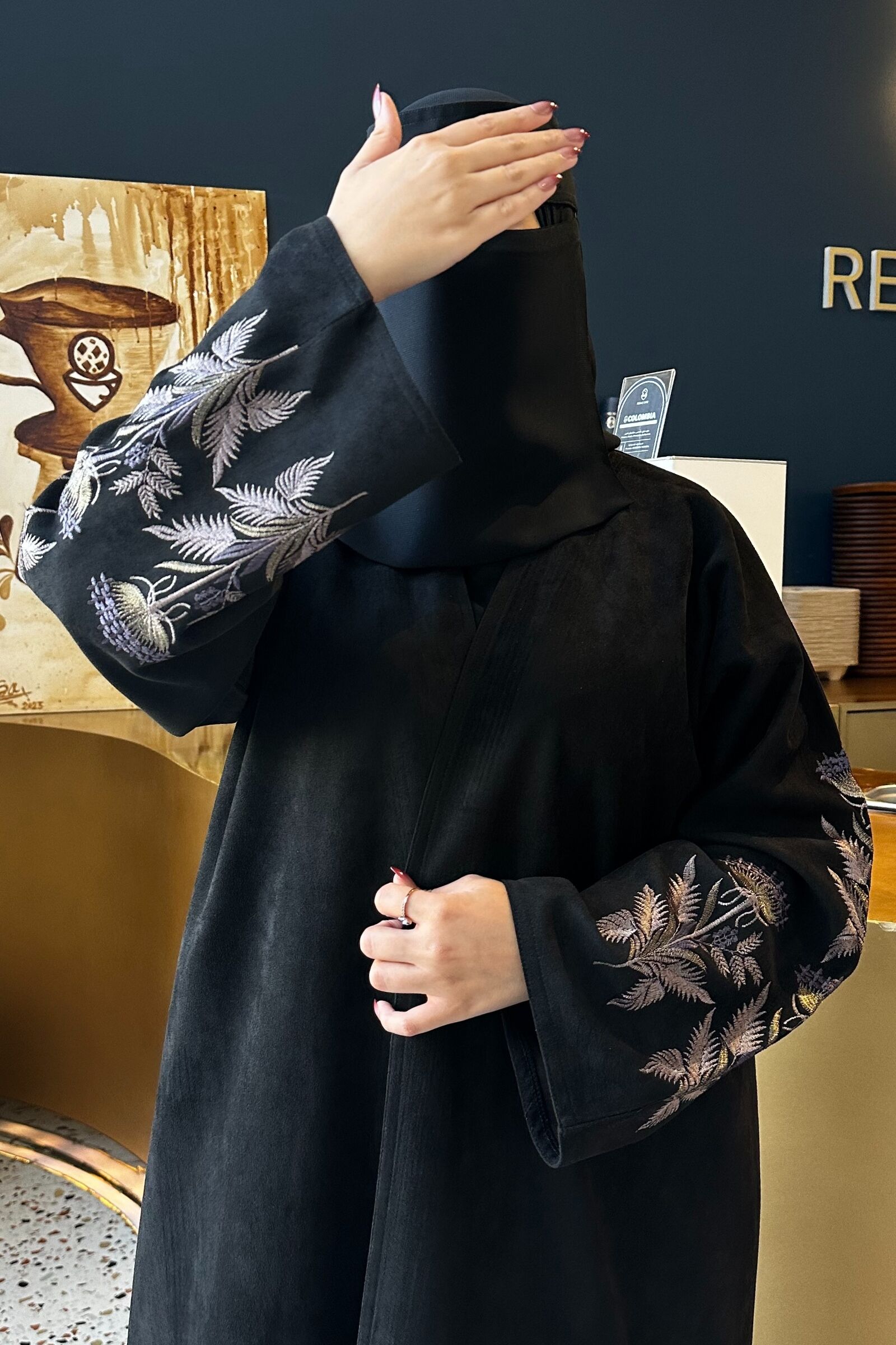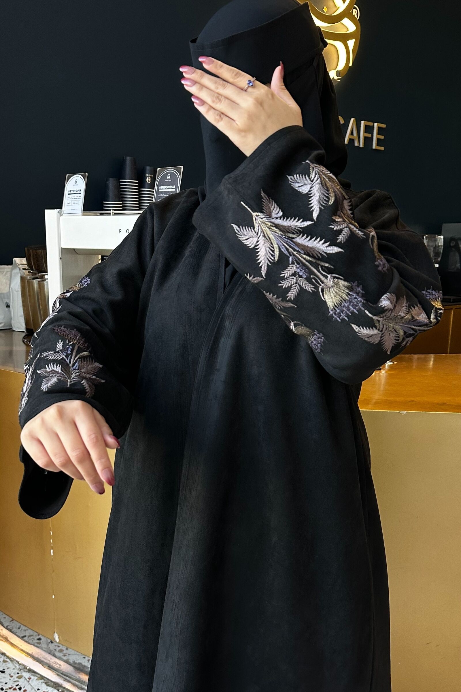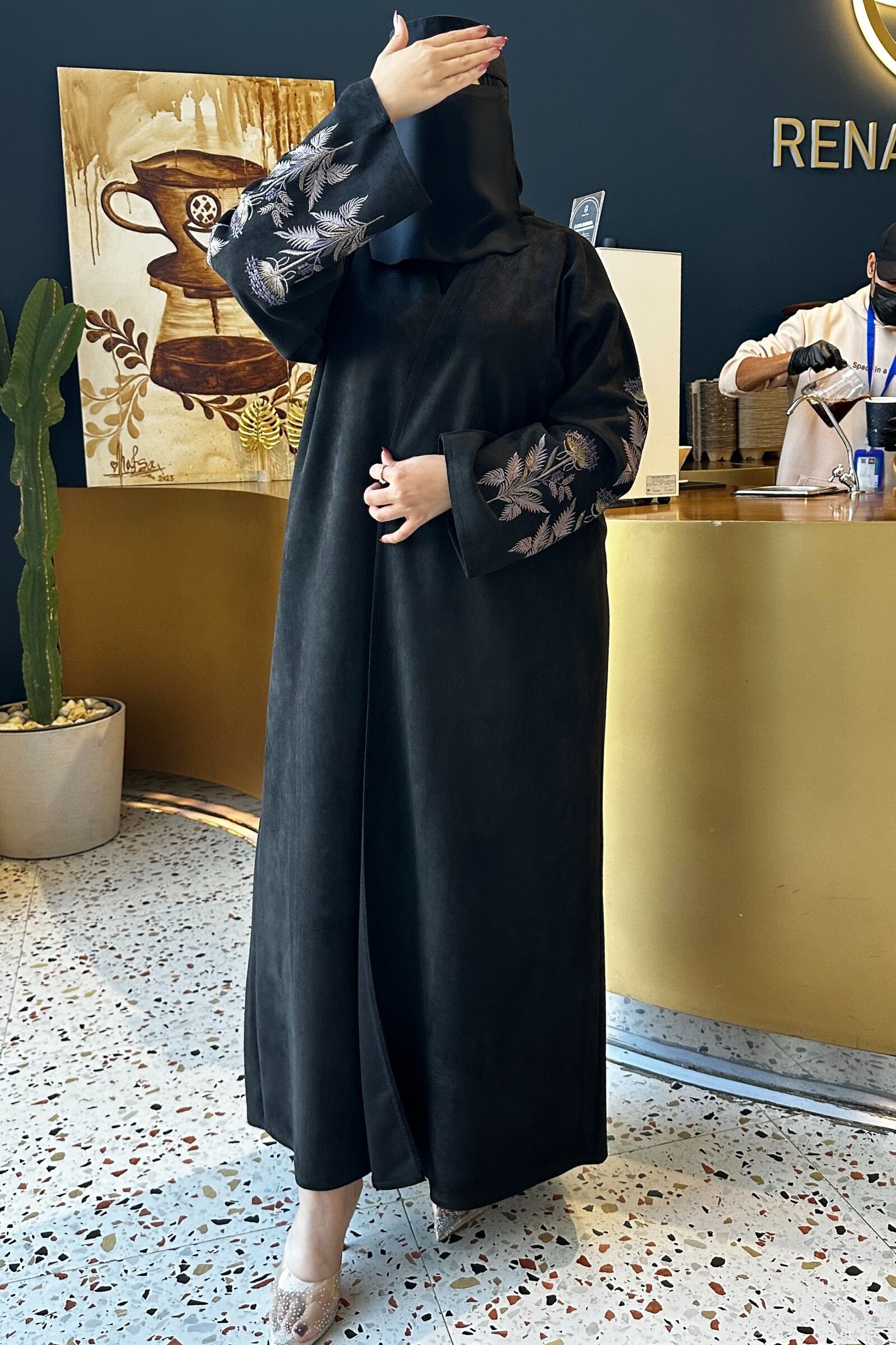 عباية مخمل بياقه كلوش بتطريز شك ابيض على اكمام