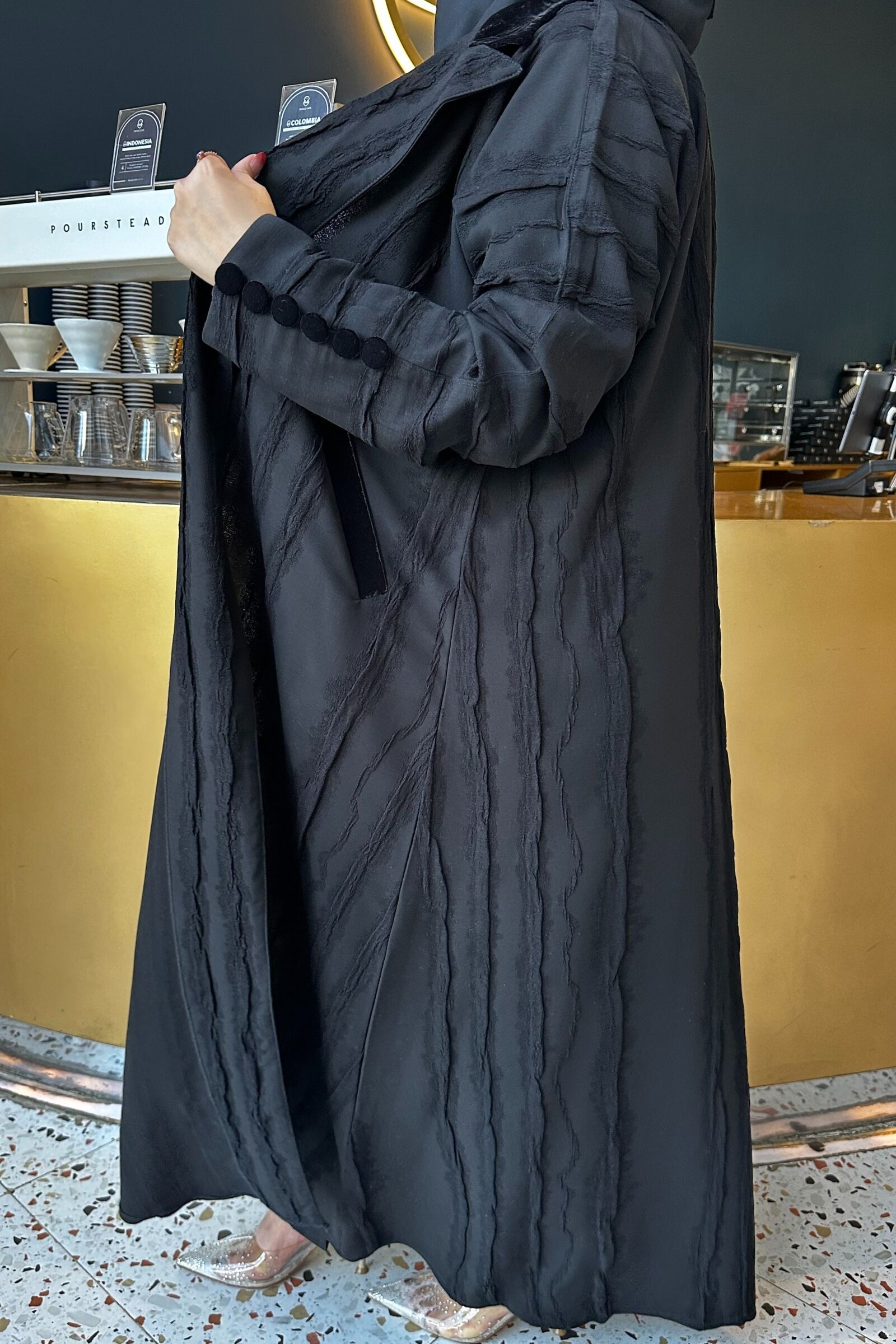 هذه العباية الملكية تتميز بأكمام مزينه بزراير بتصميم عصري جديد