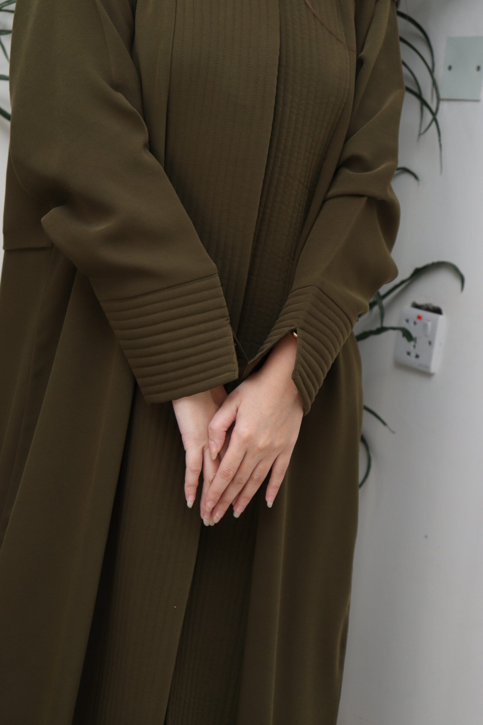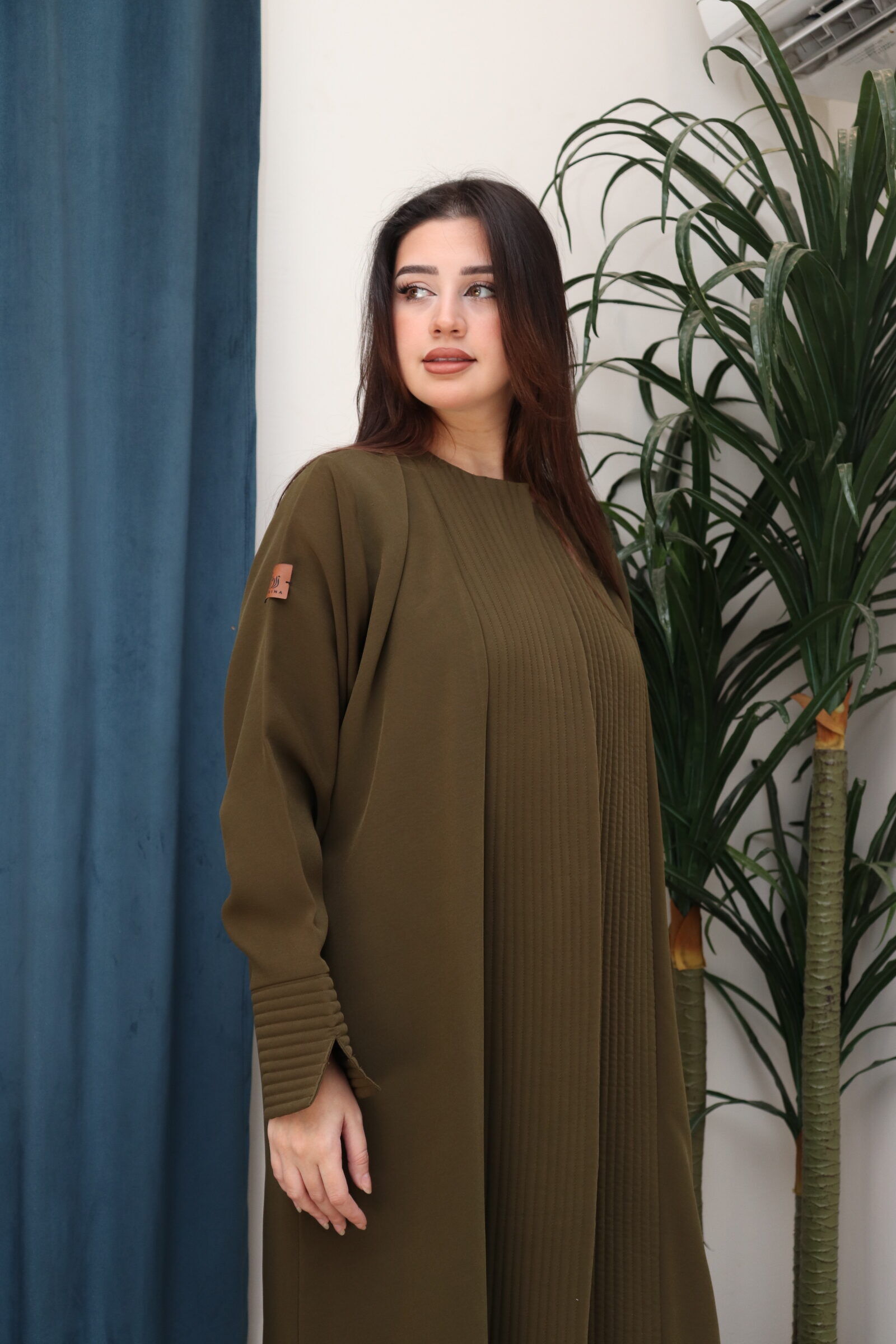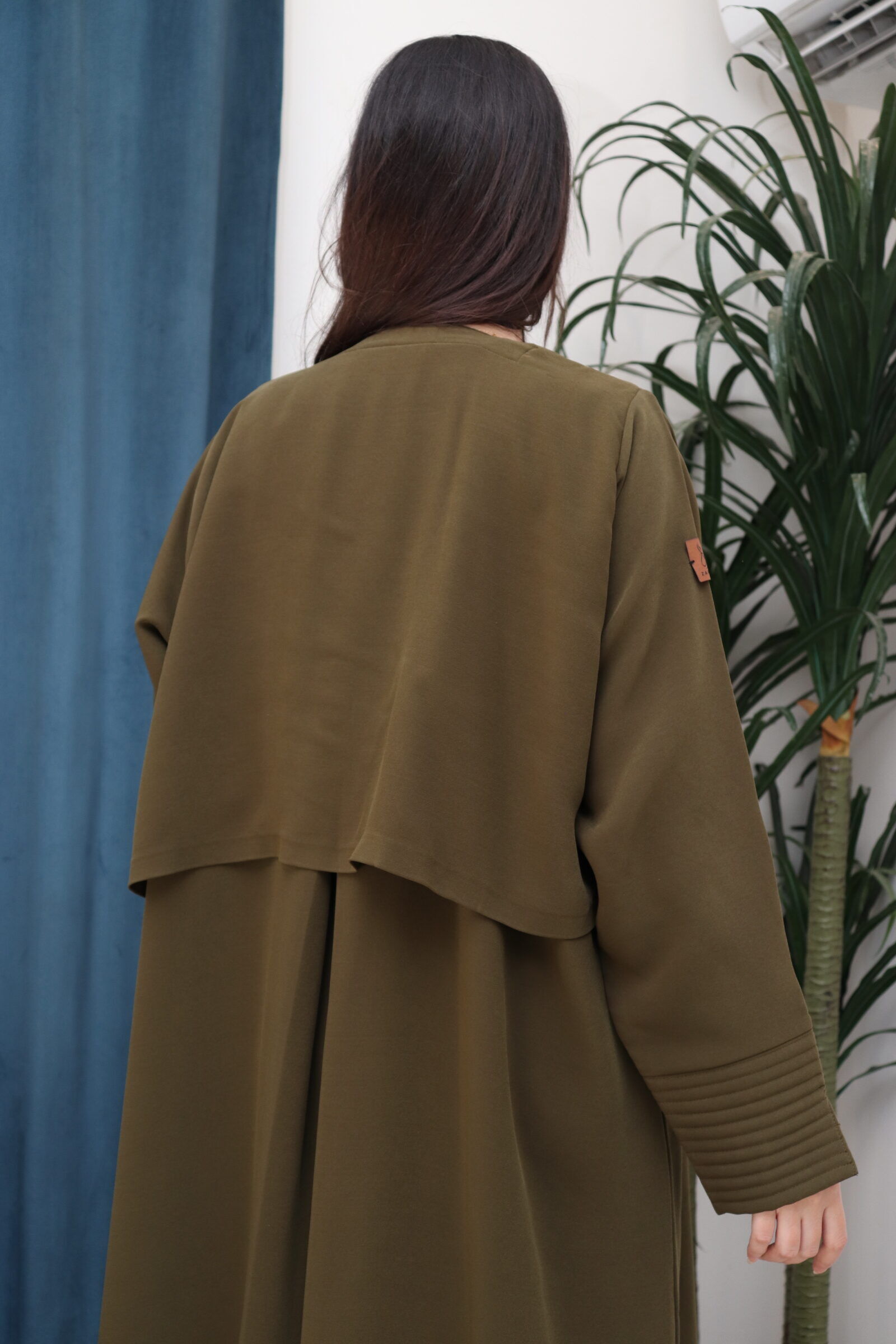اخترنا لها خامة انترنت عالي الجودة، العباية مفتوحة وتغلق بطقطق لسهولة اللبس، صممت بخيوط من الامام ومن الخلف صممت بطبقة من أعلى الظهر وكسرة طويلة.