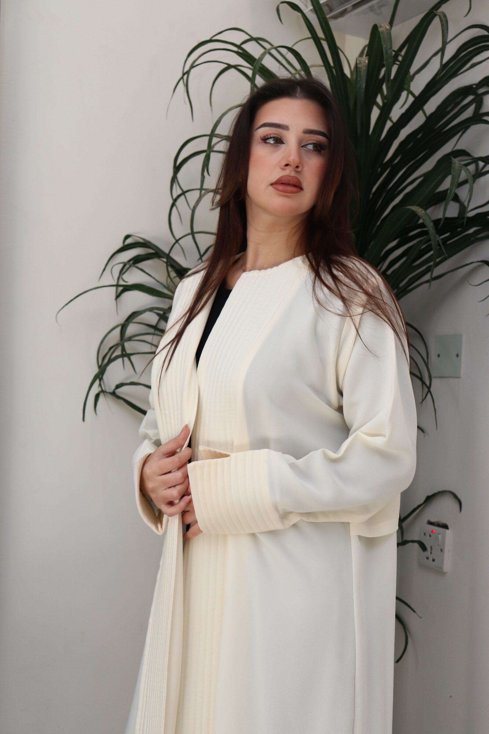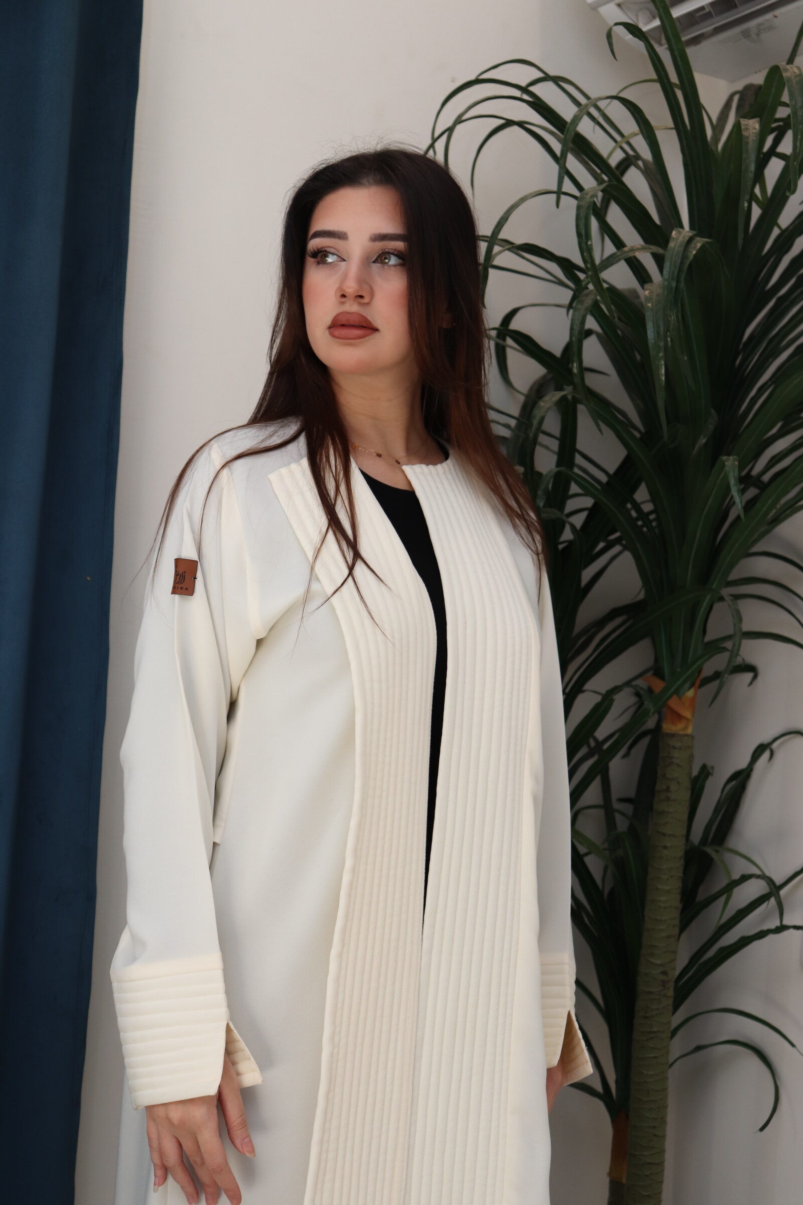 اخترنا لها خامة انترنت عالي الجودة، العباية مفتوحة وتغلق بطقطق لطلب لسهولة اللبس، صممت بخيوط من الامام ومن الخلف صممت بطبقة من أعلى الظهر وكسرة طويلة.