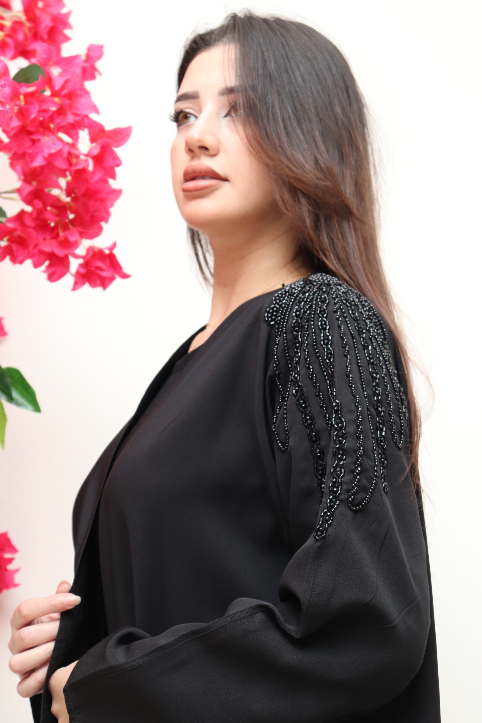 إن كنتِ تبحثين عن إطلالة مميزة بلمسة فريدة من الإبداع ، اختاري عباية اسود شك خرز يدوي بلاسود و ذات التصميم العملي المريح الذي يناسب مختلف المناسبات و الزيارات الراقية ، و هي عباية عملية فخمة مصنوعة من قماش انترنت الناعم الذي سيمنحكِ راحةً لا توصف . و العباية مزينة بتطريز يدوي راقي من شك الخرز اللامع على اكتاف لتتألقي و تتميزي أينما ما ذهبتِ .