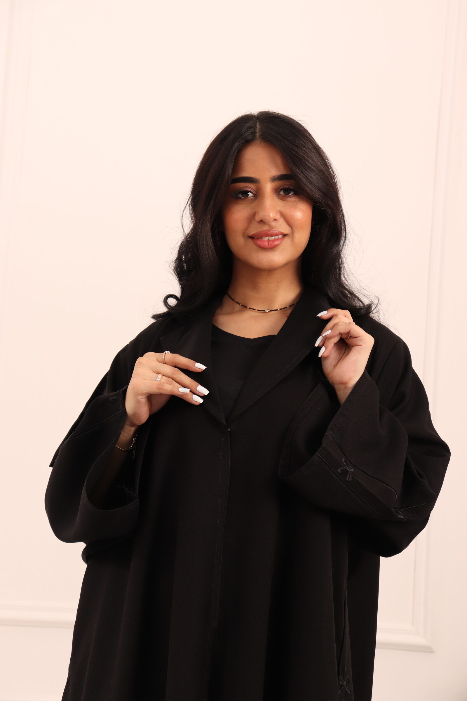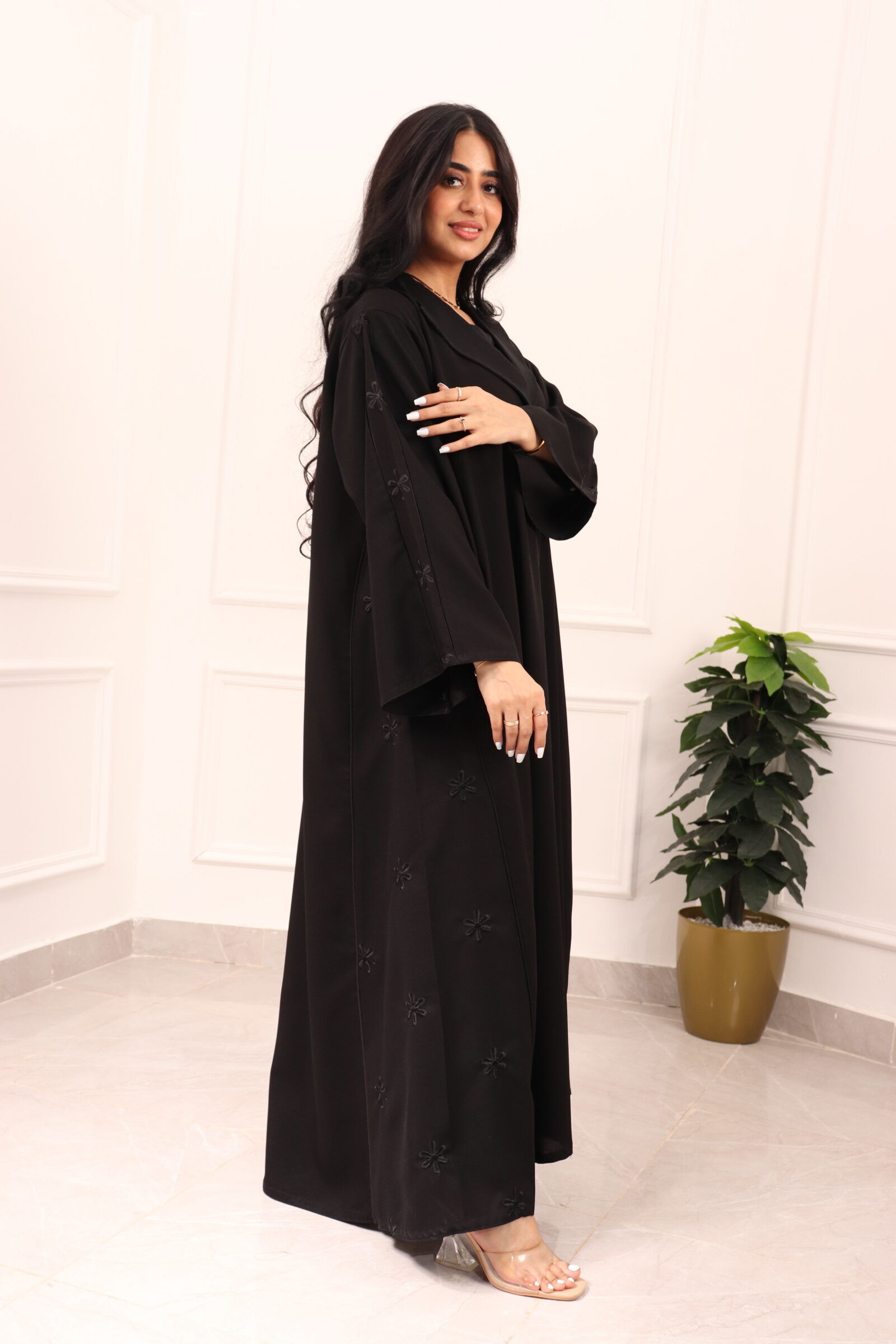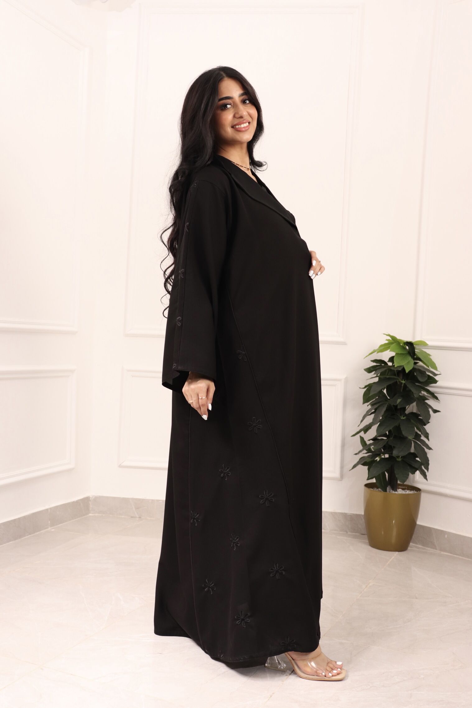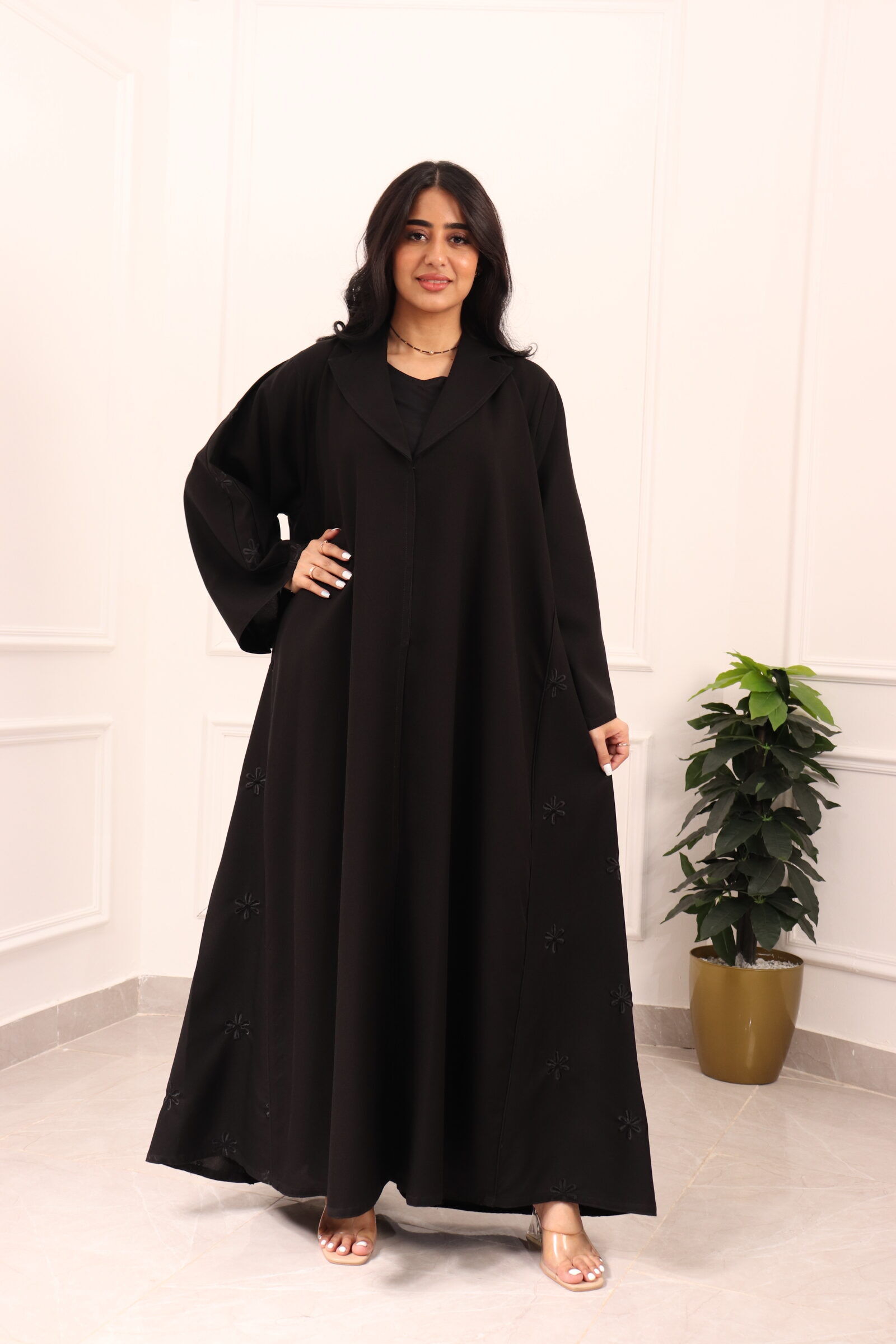 اخترنا لها خامة (مني مات) من افضل الخامات العملية، وصممت بياقه رسميه وتطريز جانبيه ناعمه تعطي راحه وانسيابية عند المشي مناسبه للعمل والمشاوير اليوميه.