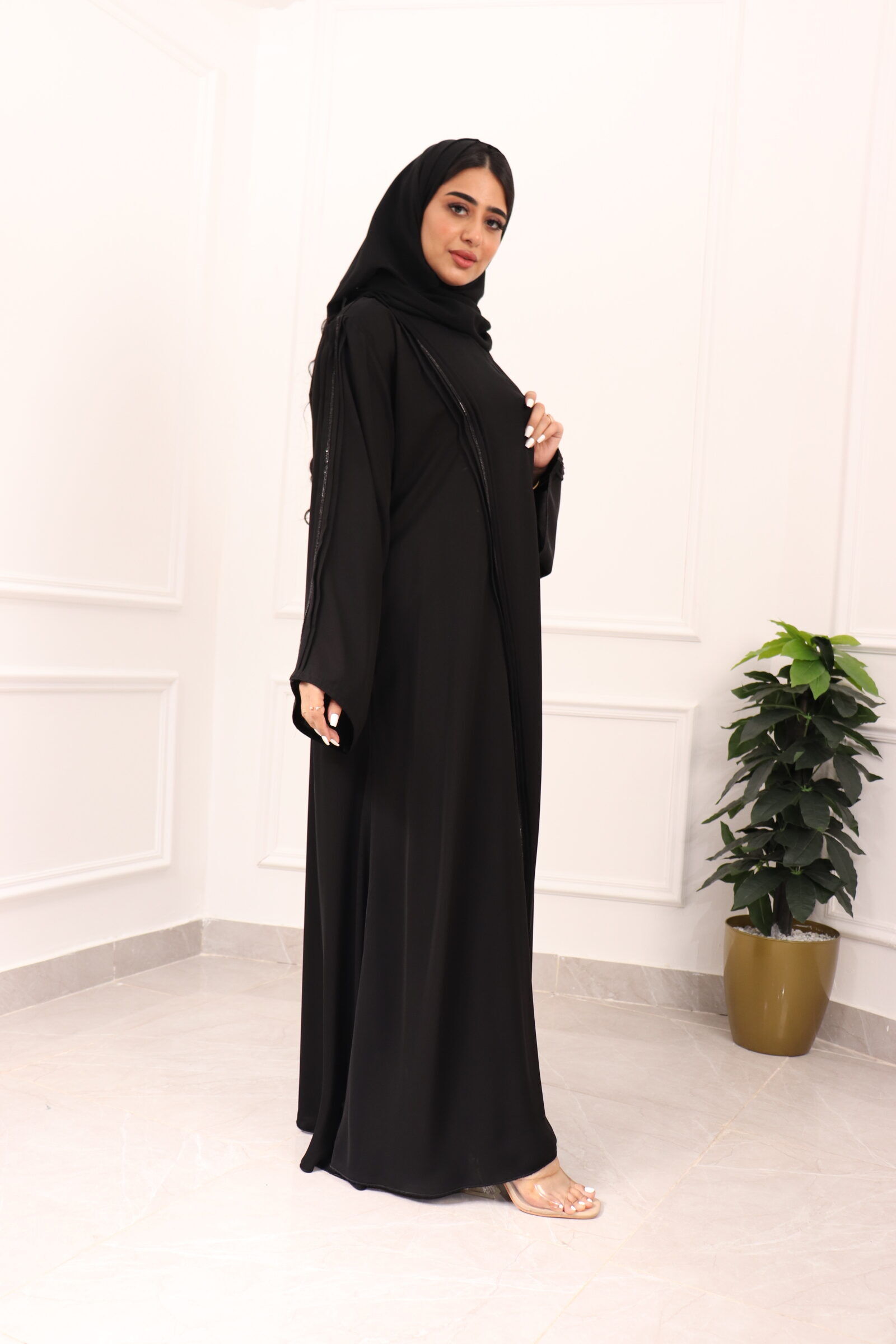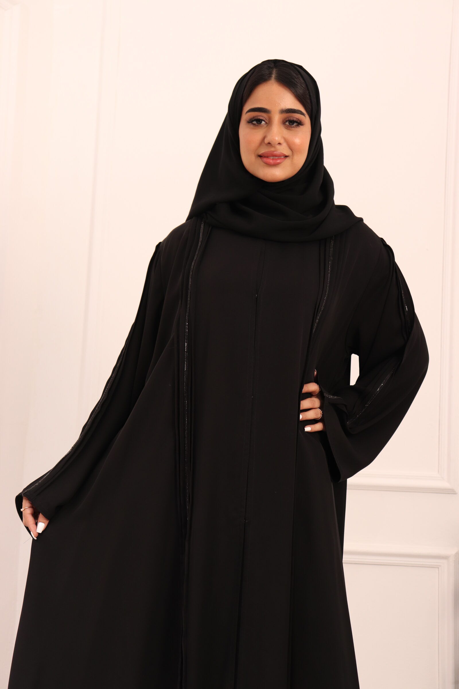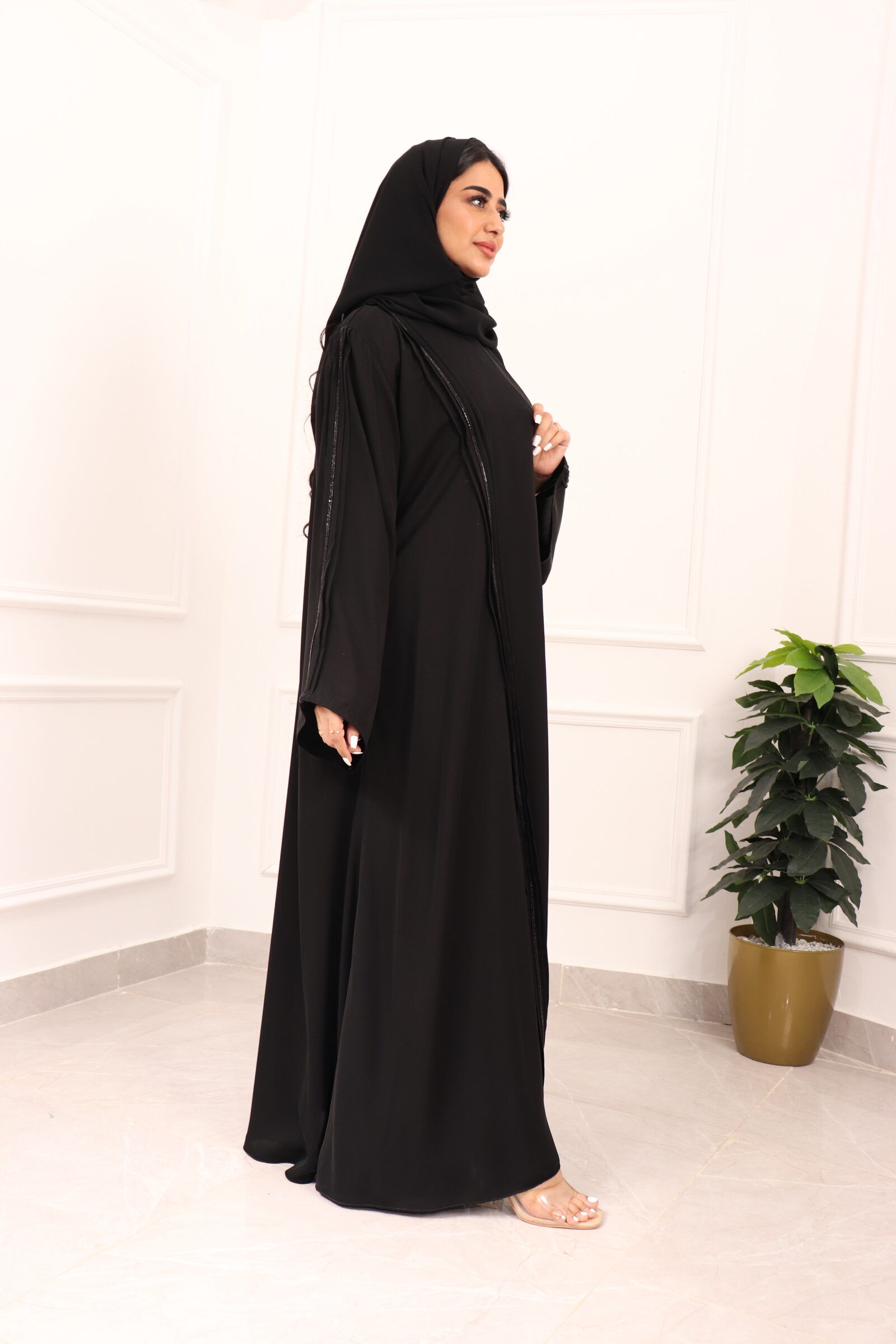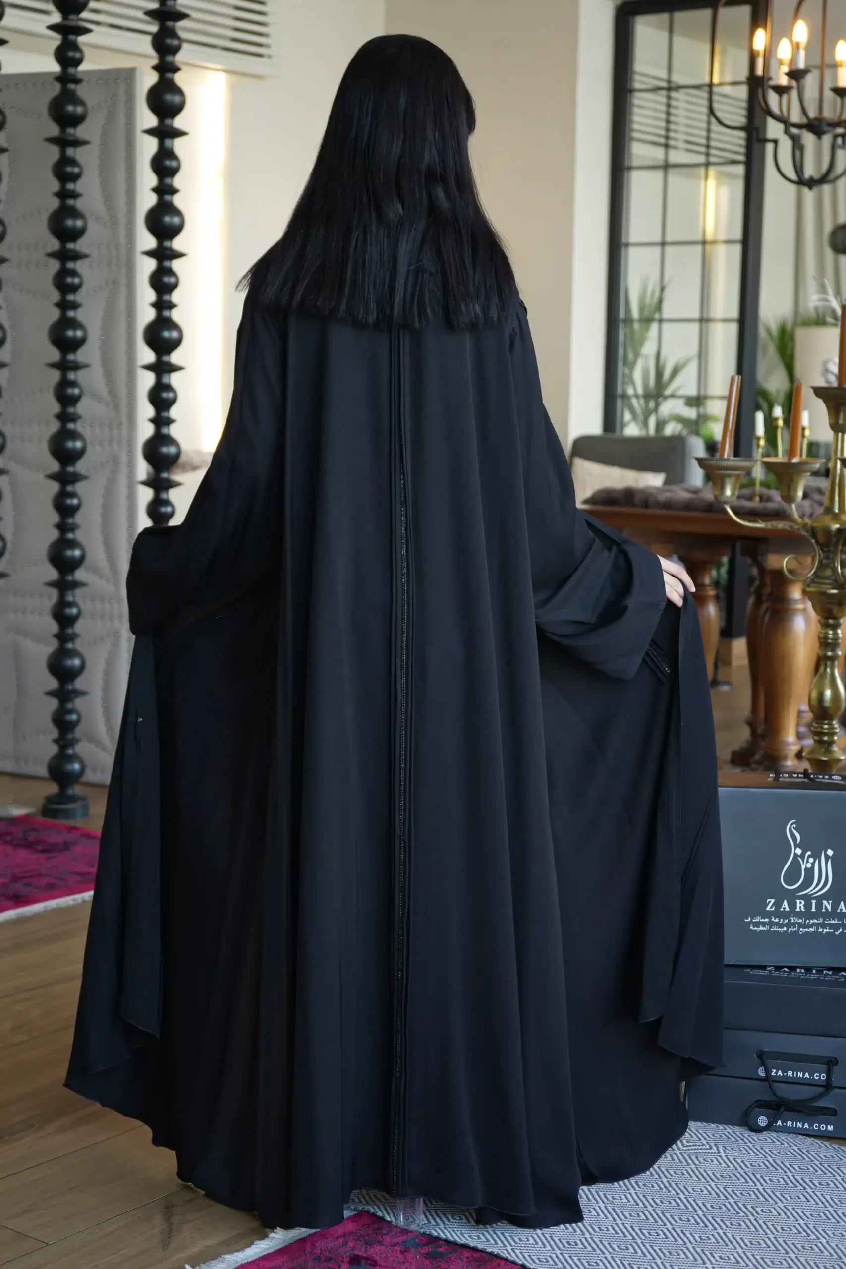 عباية بلون اسود من خامة (نواعم ) صممت بقصة A بطقطق من الامام . الاكمام كلوش وسيع وشريط فصوص محدد من اكتاف ممتدة الى نهاية الكم ومن الخلف و الامام ناعمة