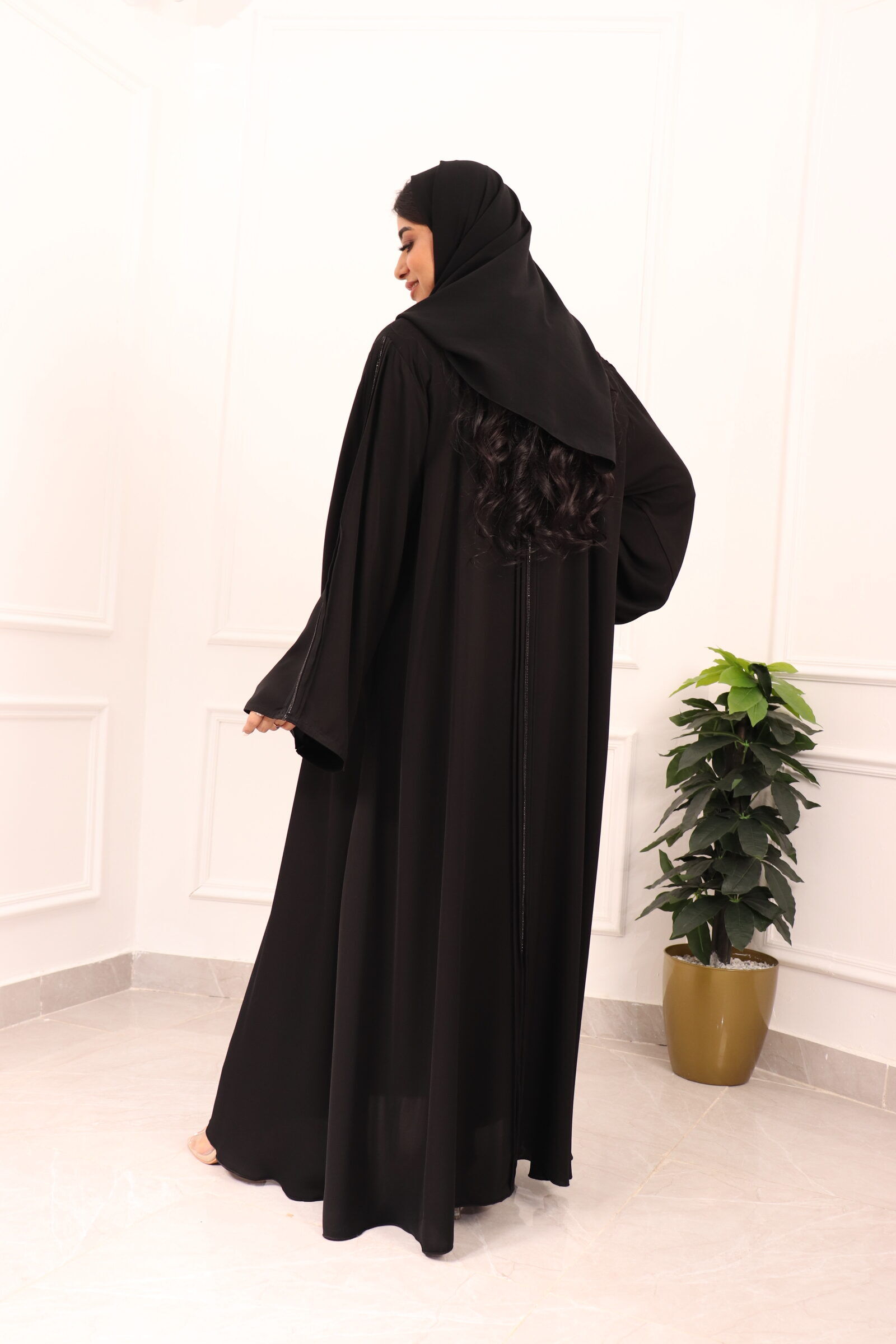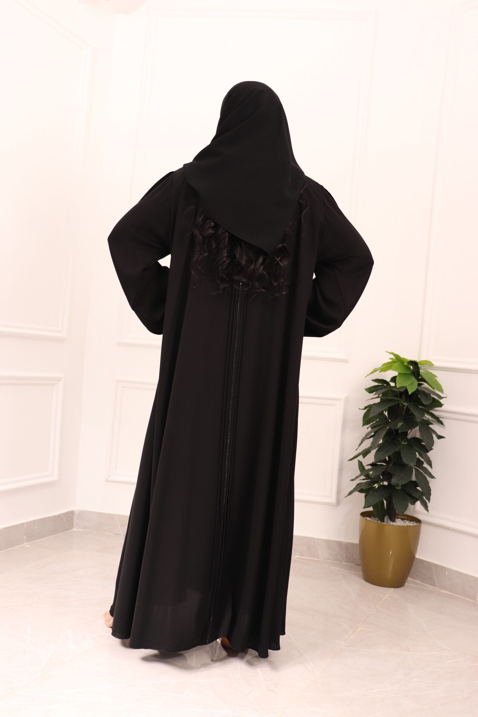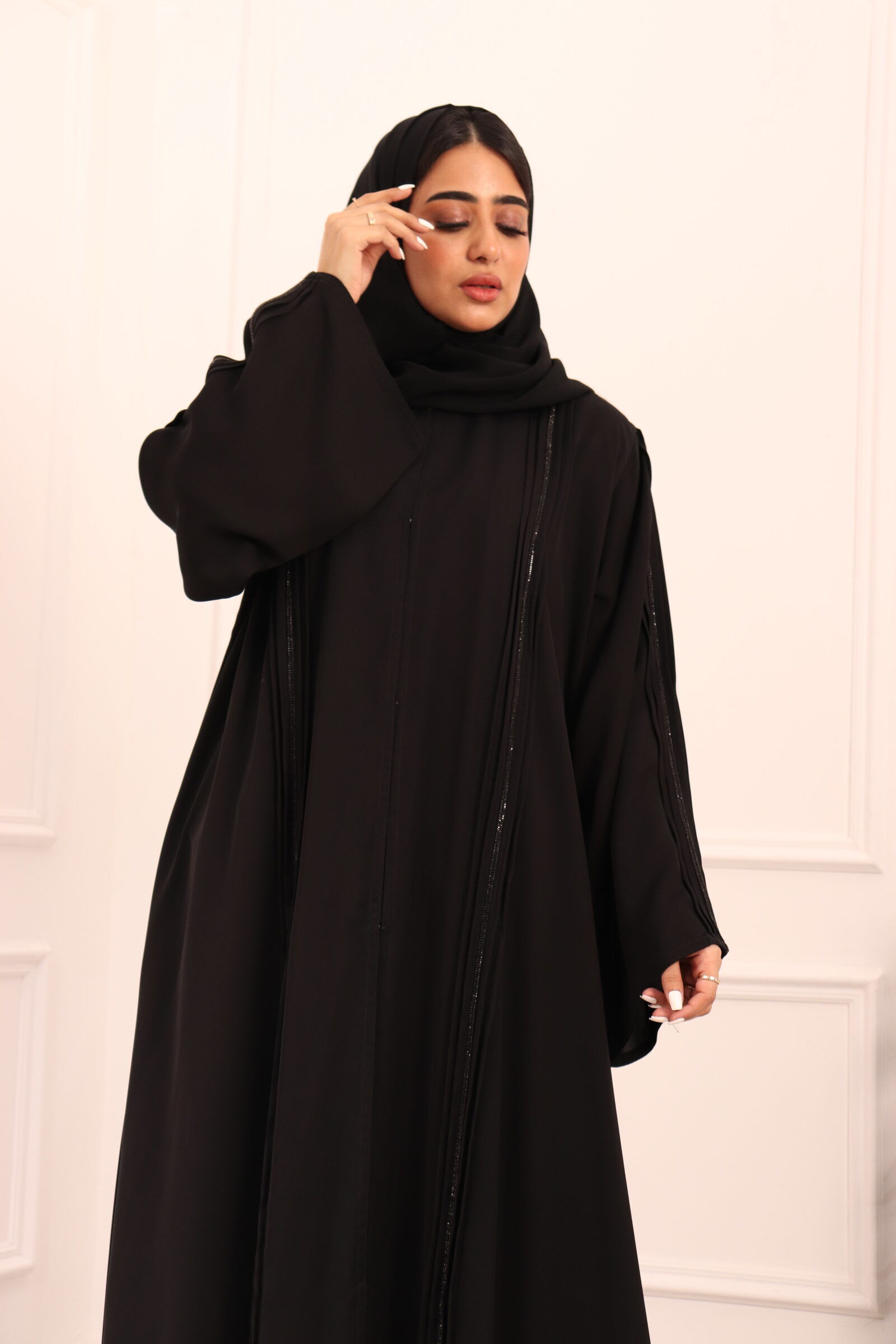 عباية بلون اسود من خامة (نواعم ) صممت بقصة A بطقطق من الامام . الاكمام كلوش وسيع وشريط فصوص محدد من اكتاف ممتدة الى نهاية الكم ومن الخلف و الامام ناعمة