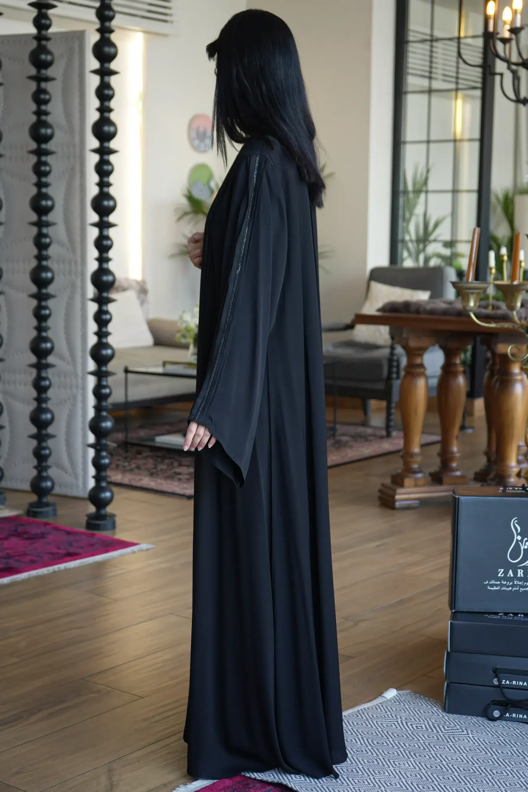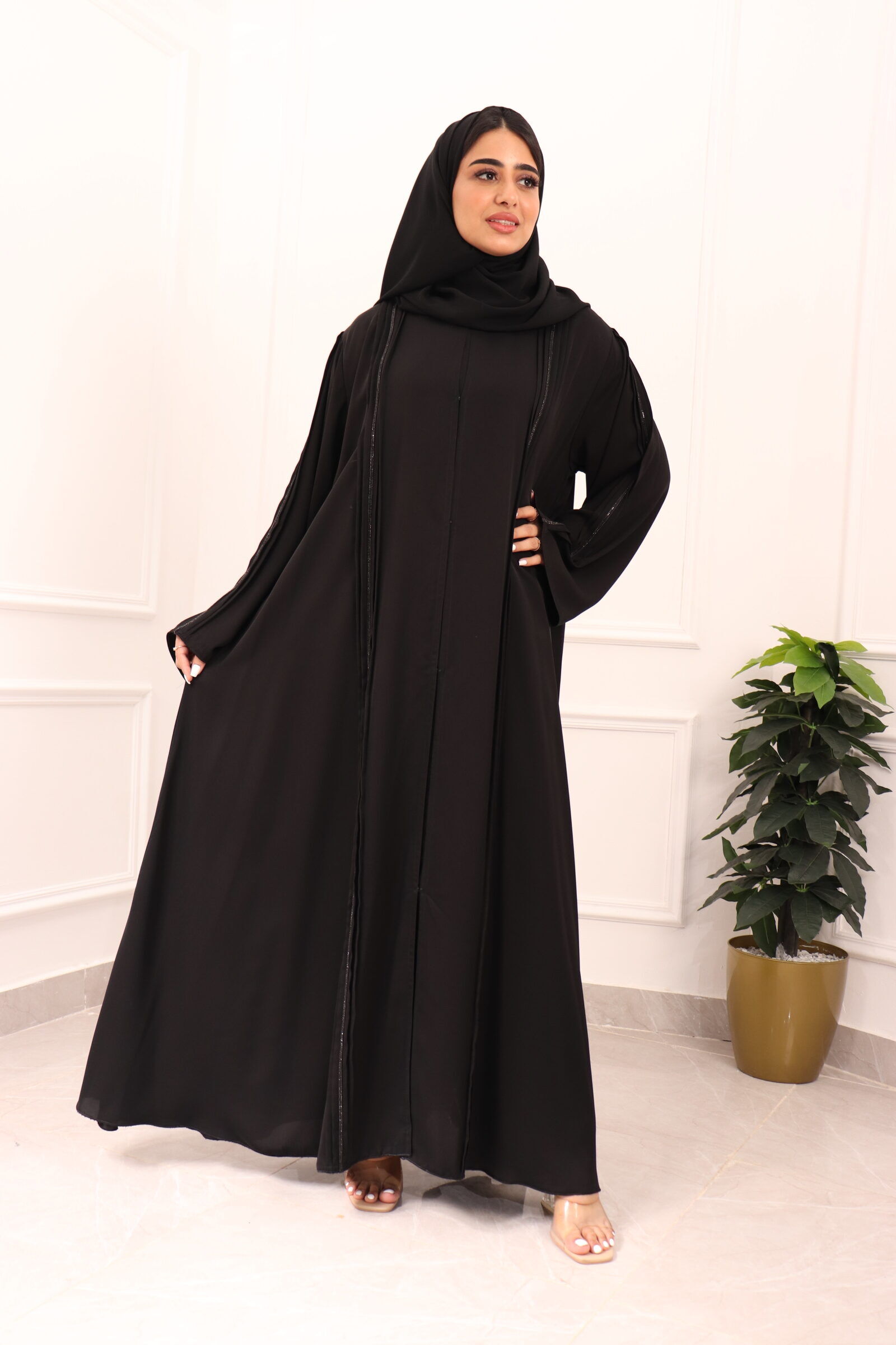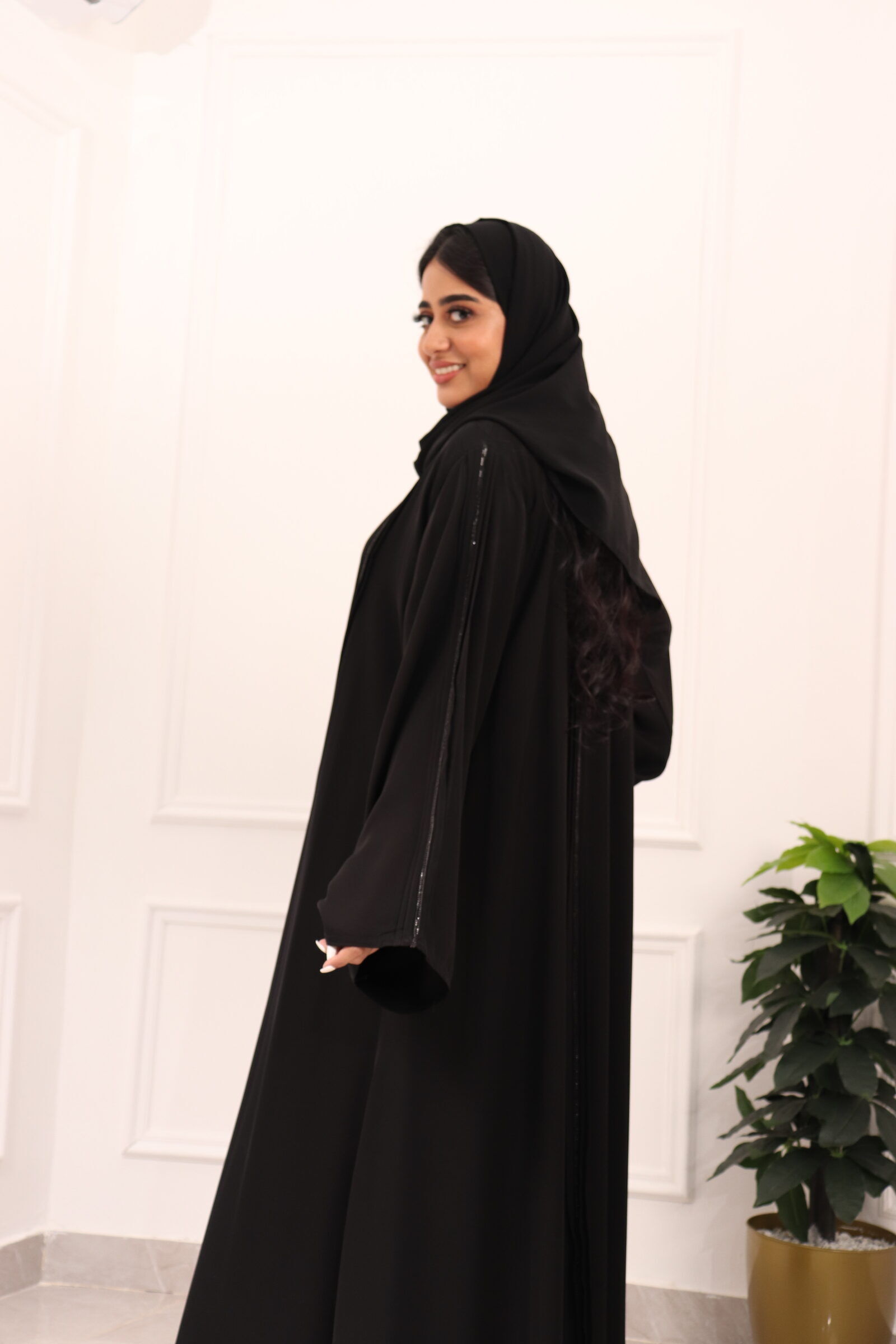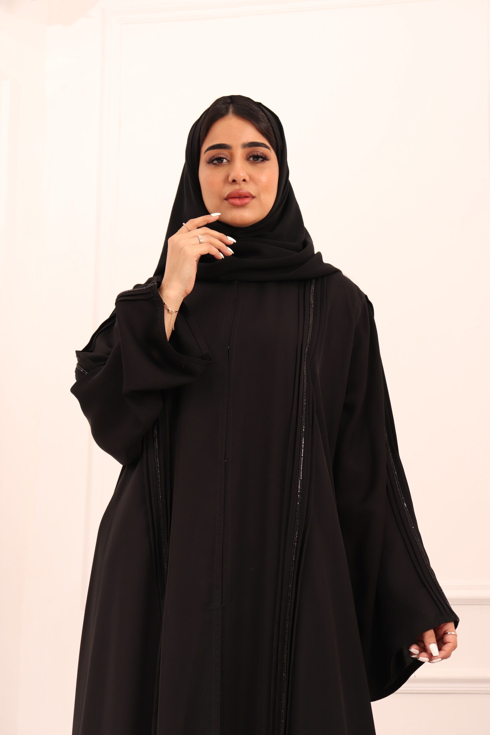 عباية بلون اسود من خامة (نواعم ) صممت بقصة A بطقطق من الامام . الاكمام كلوش وسيع وشريط فصوص محدد من اكتاف ممتدة الى نهاية الكم ومن الخلف و الامام ناعمة