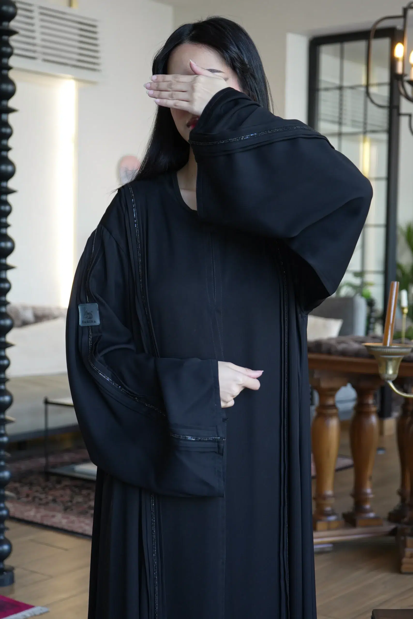 عباية بطبقة داخلية مع ربطة جانبية بكم جلد مفتوحة