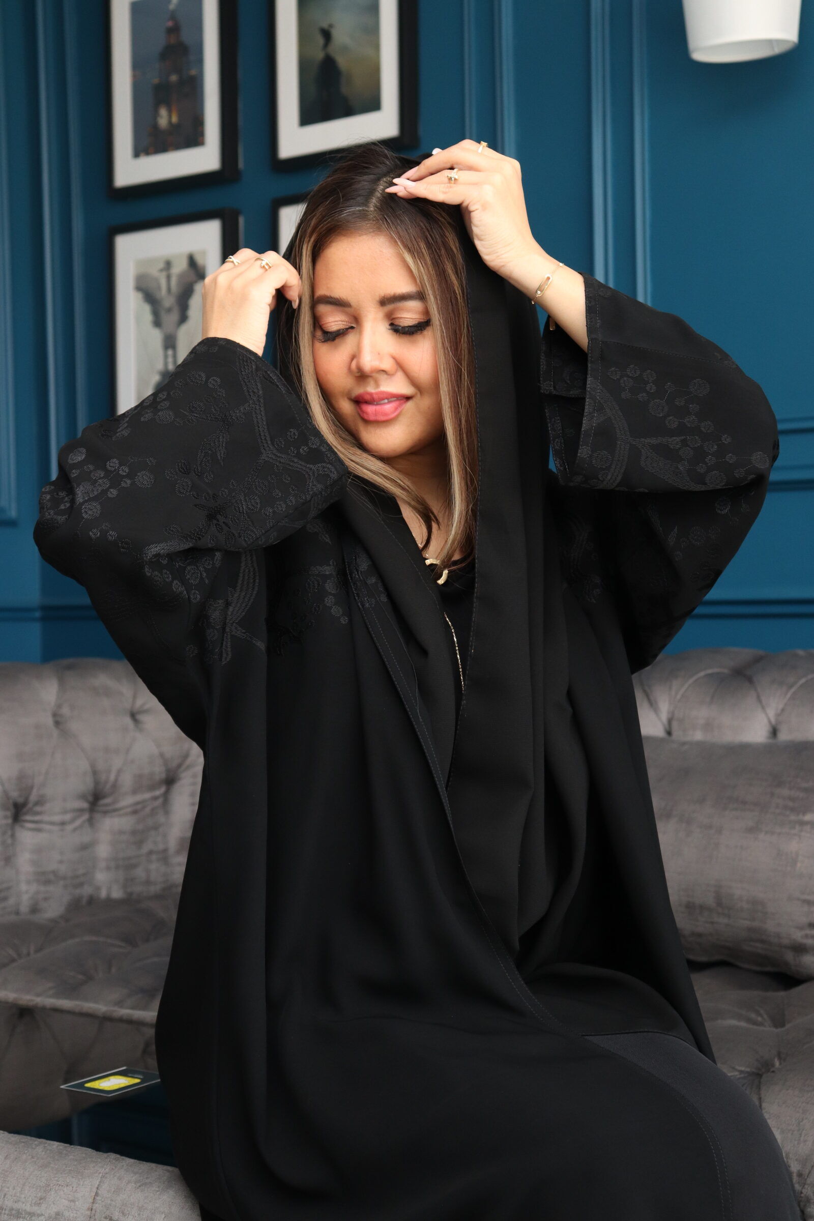 عباية بأكمام دانتيل مطاط و شك على الأكمام