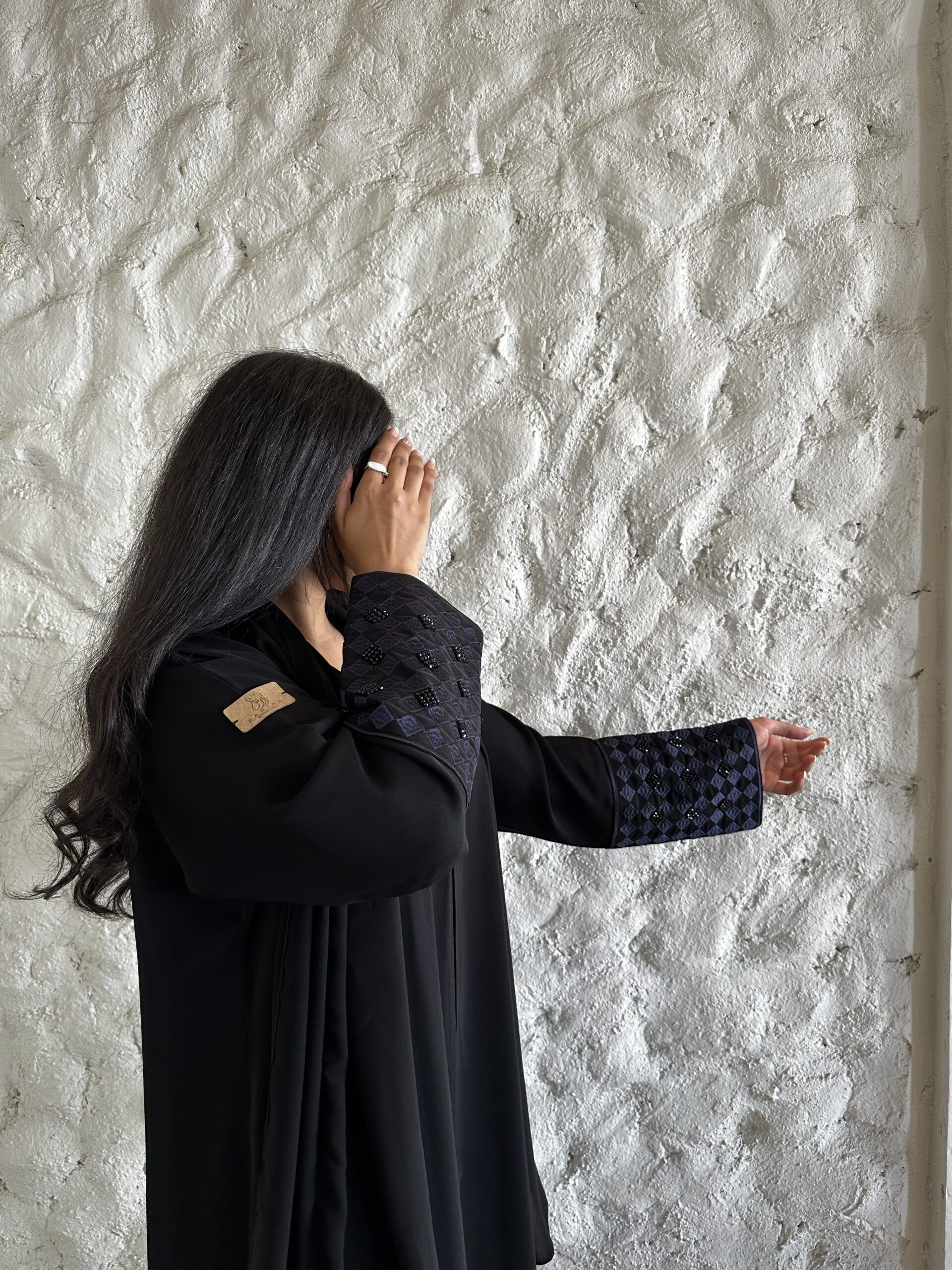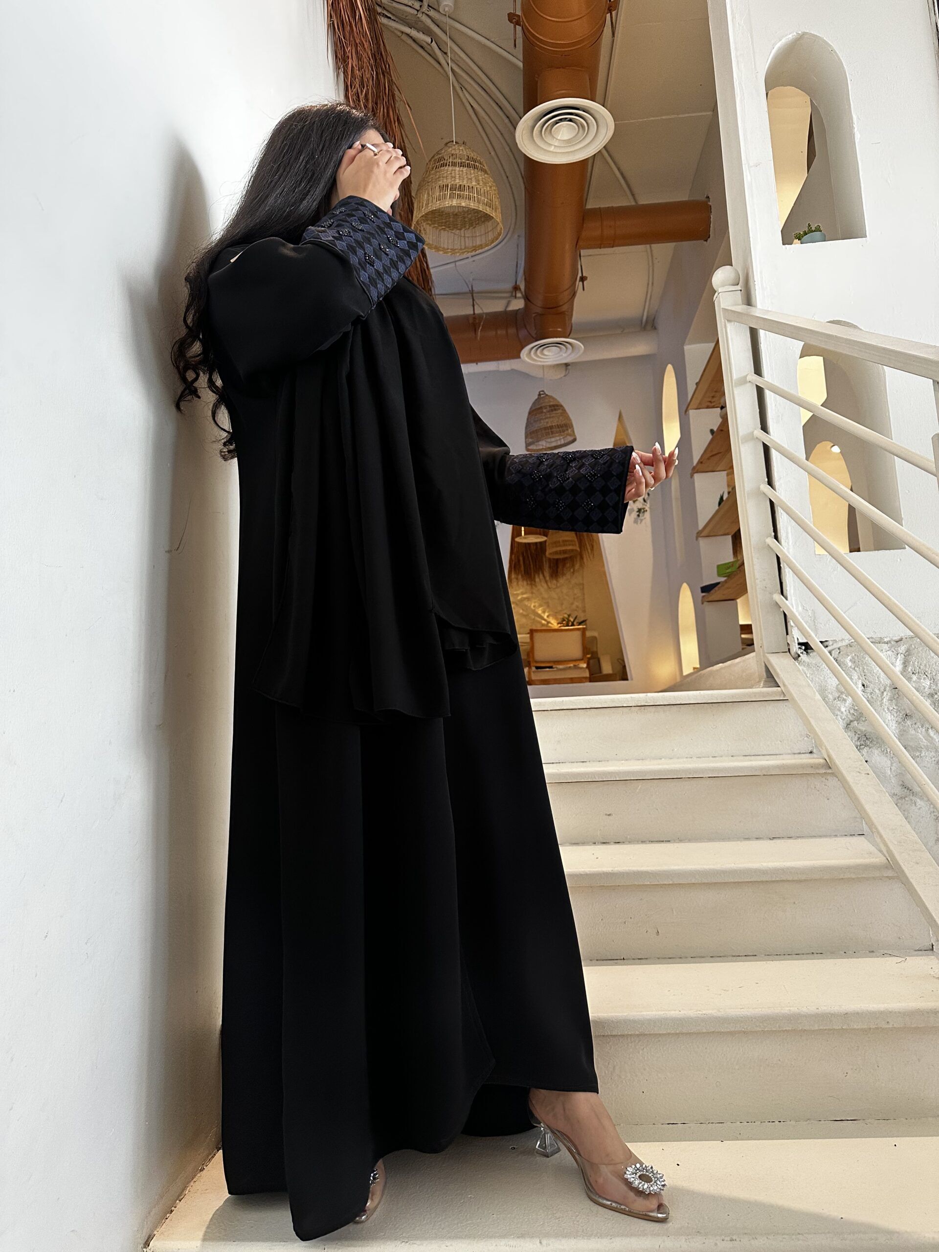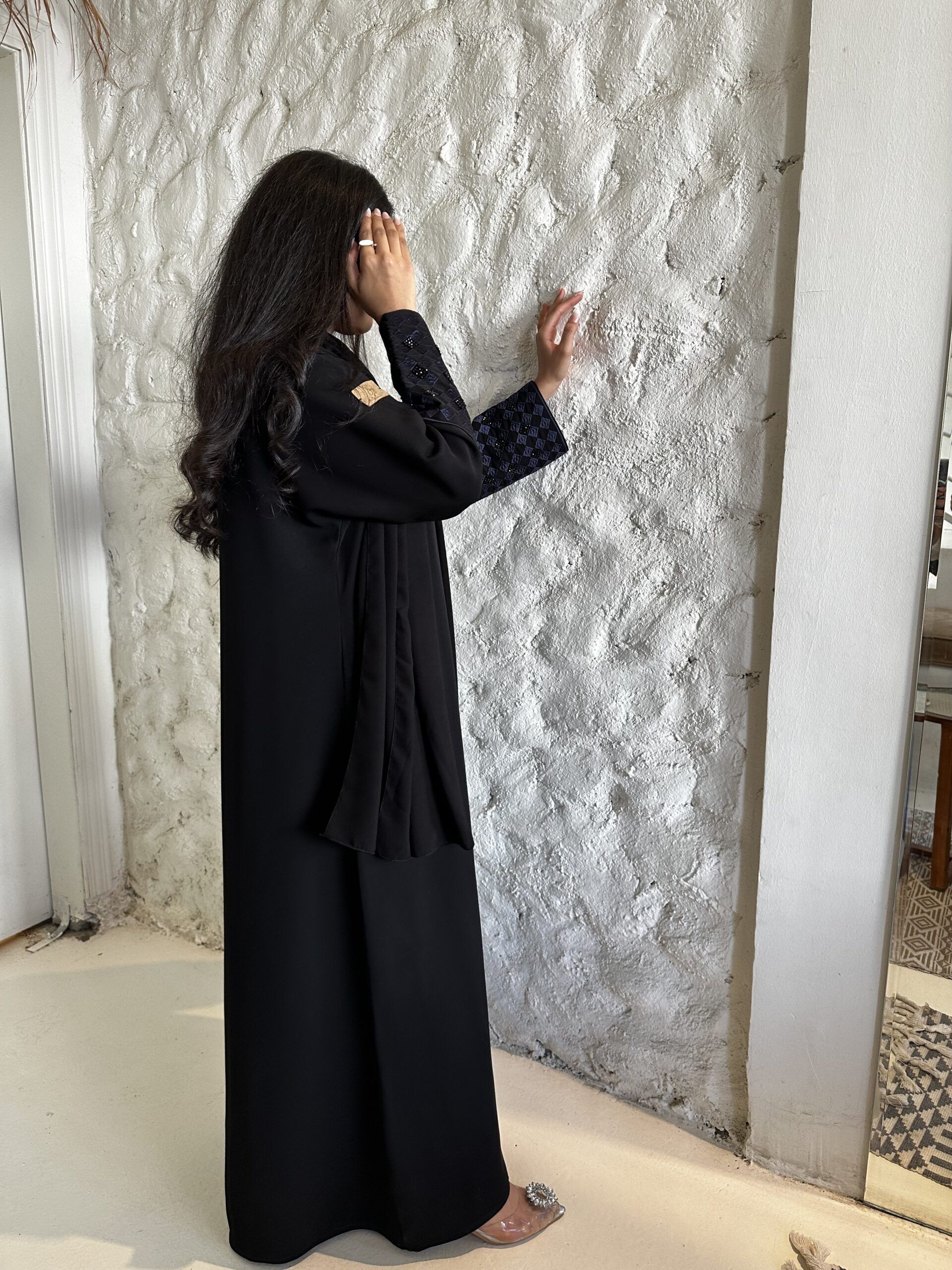 عباية ملكي بتطريز أسود يدوي على الأكمام بلون أسود