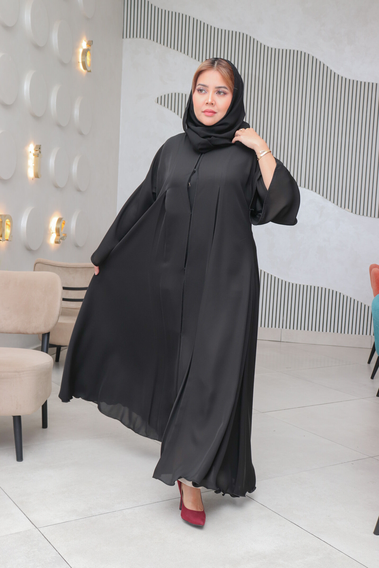عباية بلون اسود من خامة (نواعم ) صممت بقصة A بطقطق من الامام . الاكمام كلوش مع صفطات طوليه من الكتف ممتدة الى نهاية الكم ومن الخلف و الامام كسرات ناعمة تبدا من منتصف الظهر