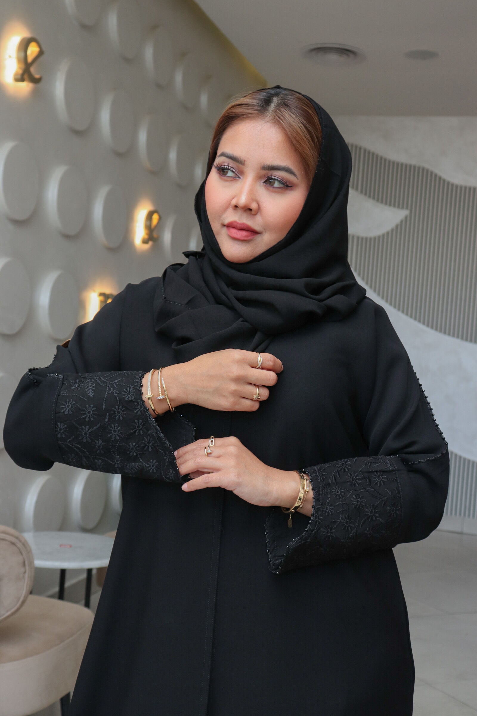 عبايه كتف بفصوص محدد وتطريز مميز على كم
