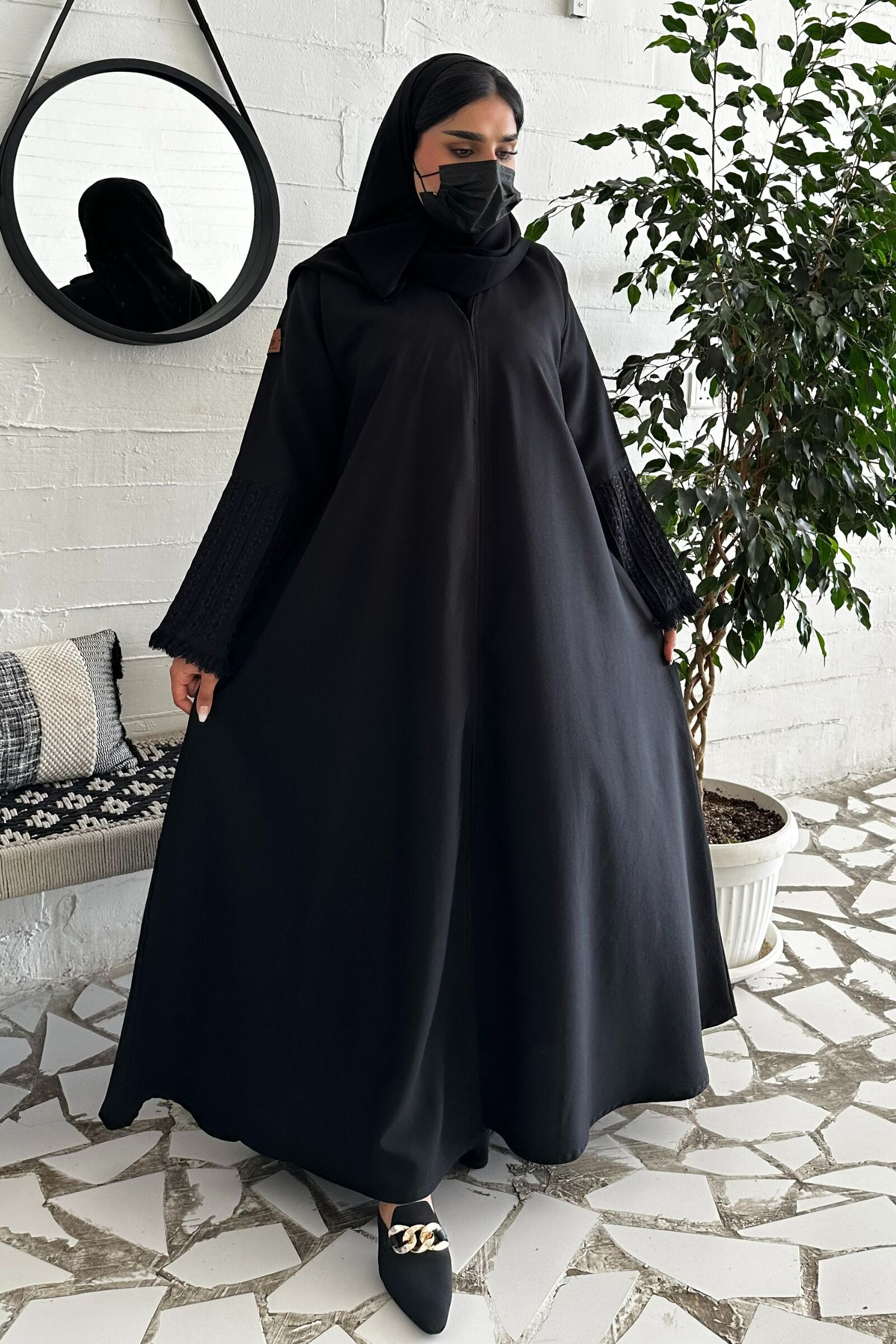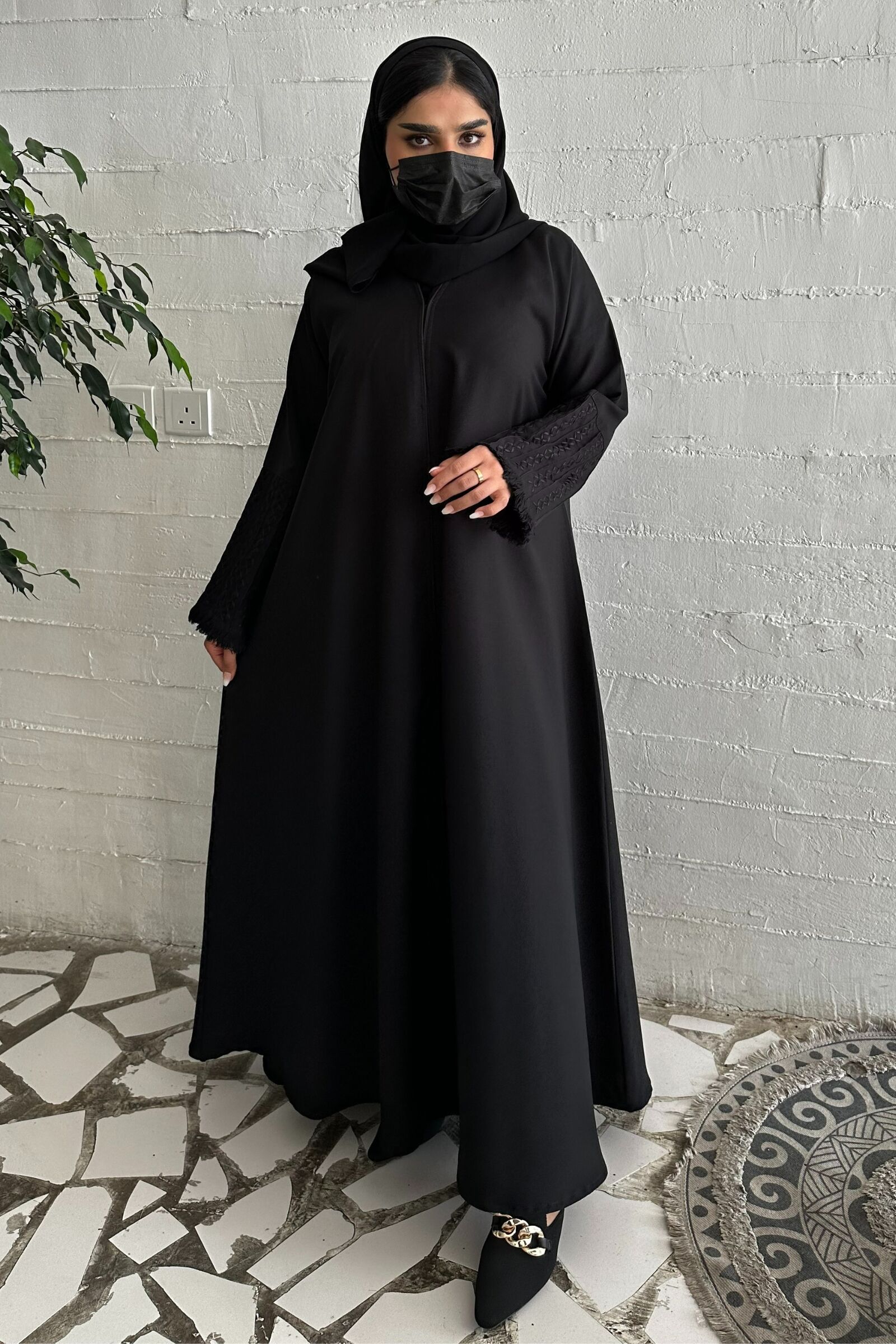عباية سوداء أنيقة بقصة كلوش أهم مايميز العباية مزينة بتطريز شك على اكمام