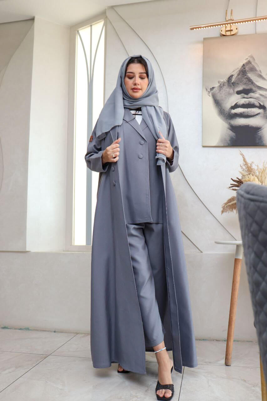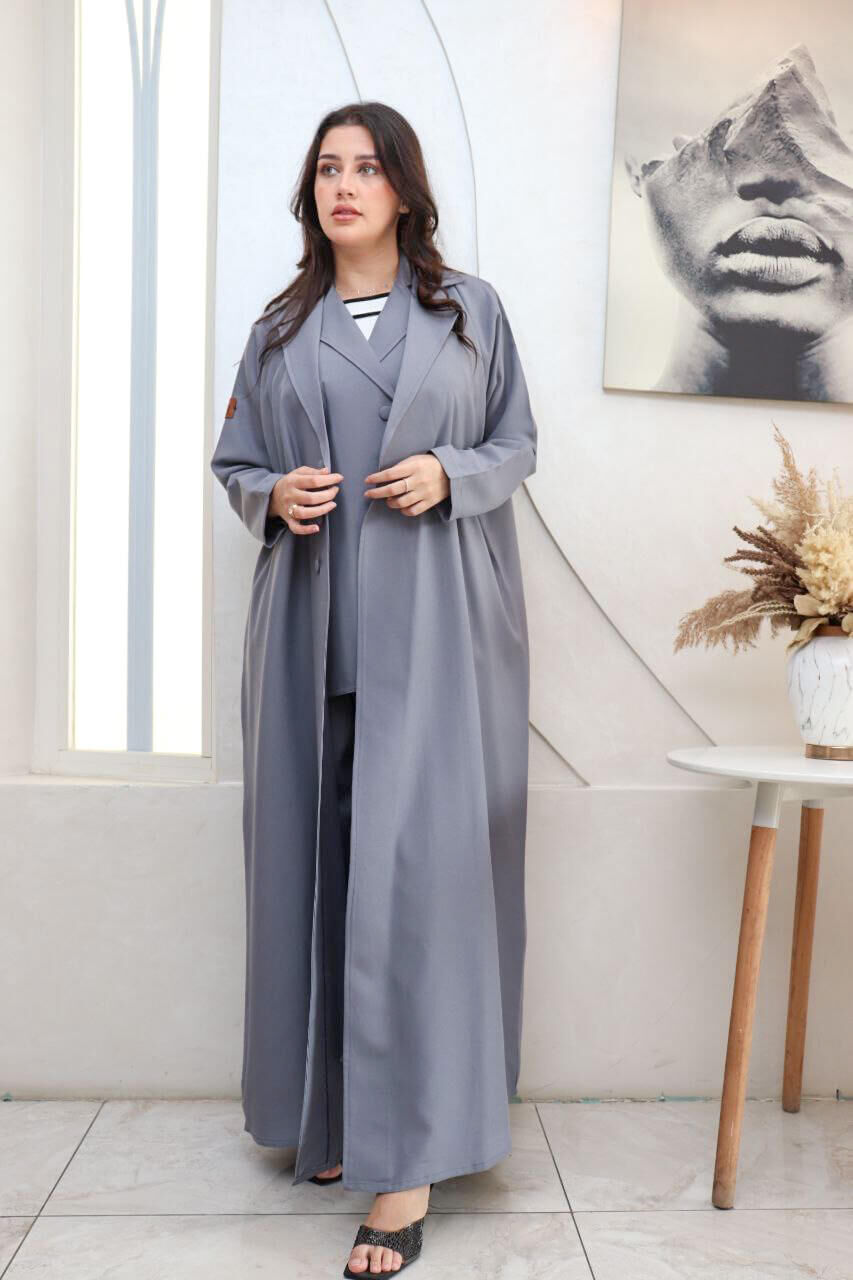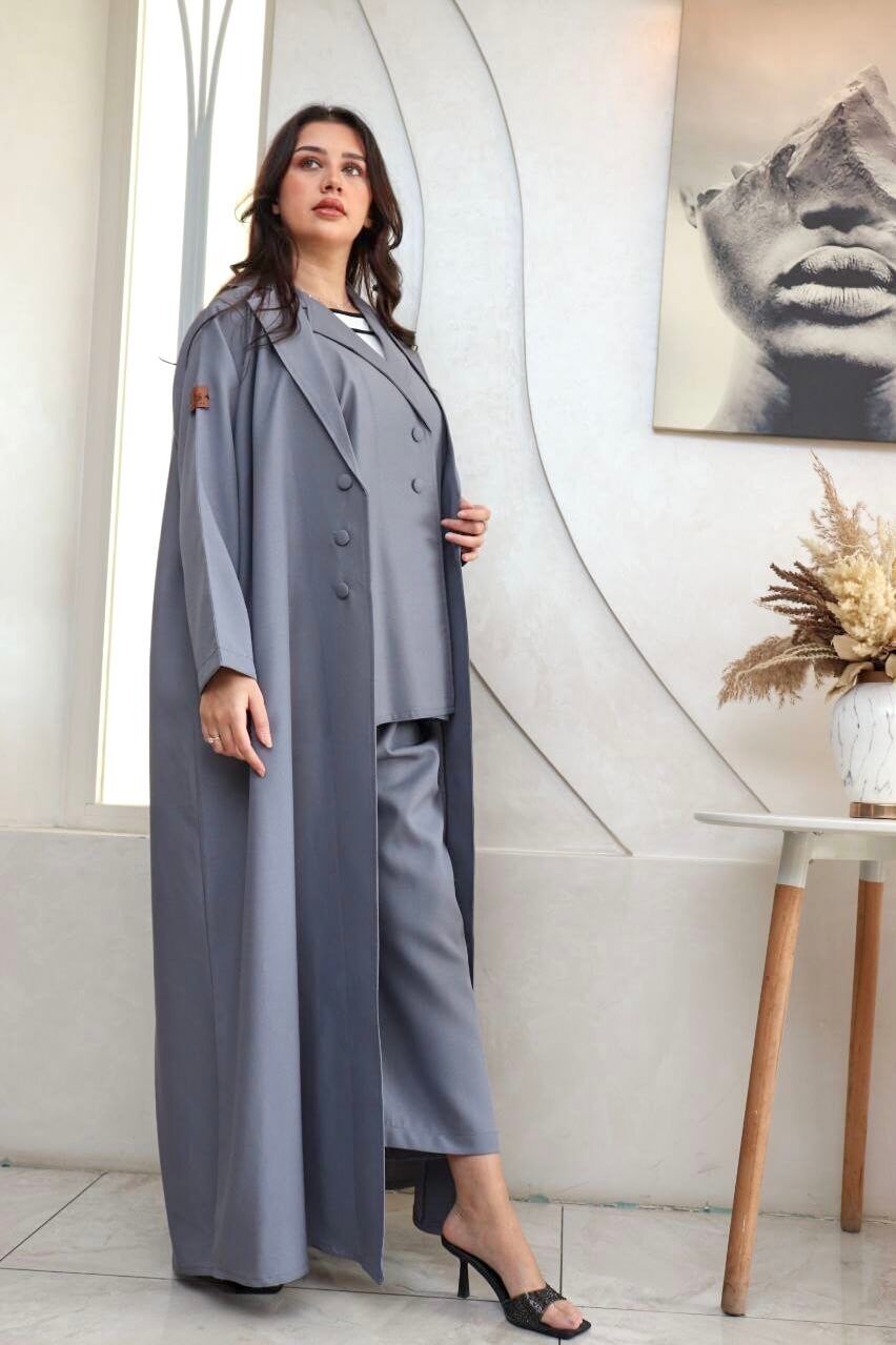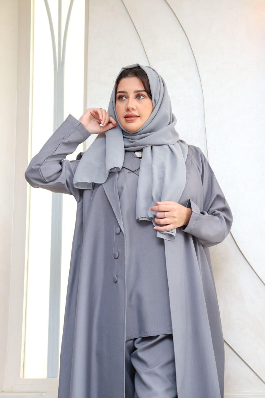 عباية ثلاث قطع رمادي : تحفة فنية تجمع لكِ الأناقة العملية