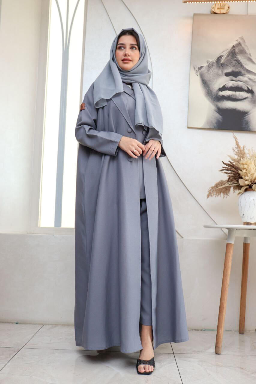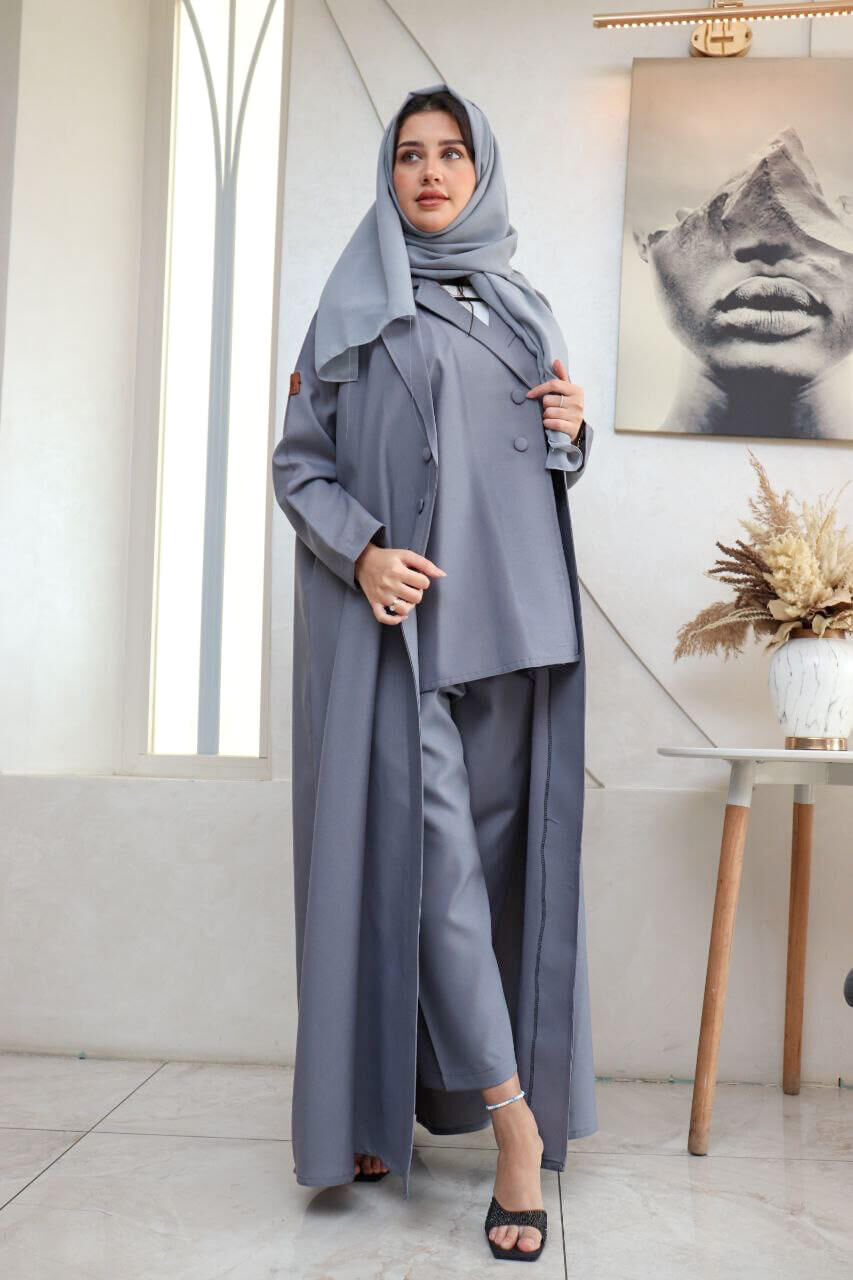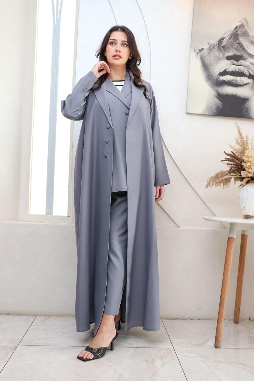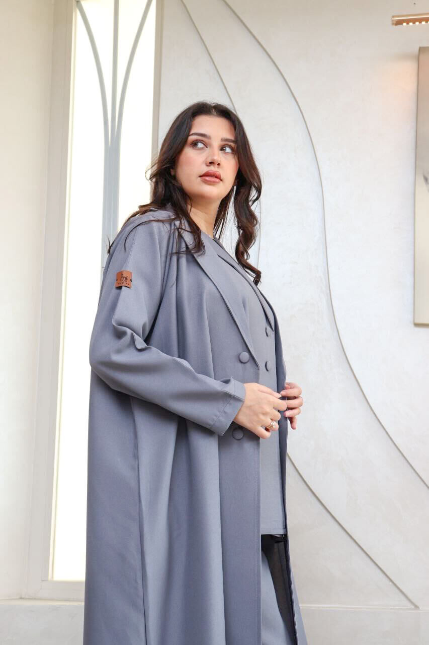 عباية ثلاث قطع رمادي : تحفة فنية تجمع لكِ الأناقة العملية