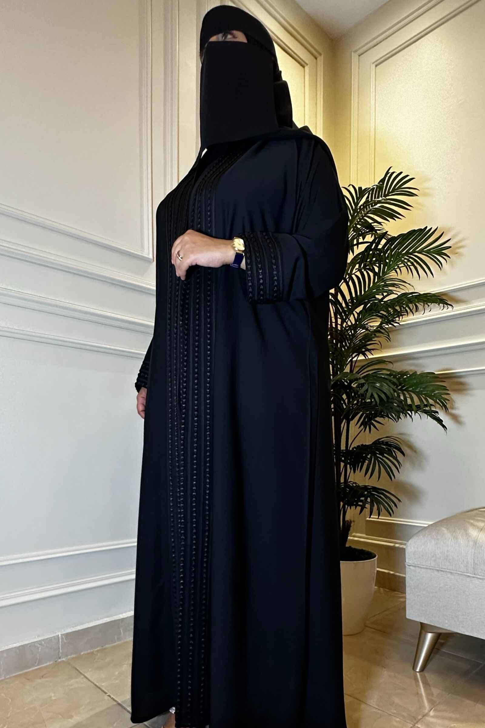 عبايه سوداء بقيطان مصنوعة من أقمشة عالية الجودة ،