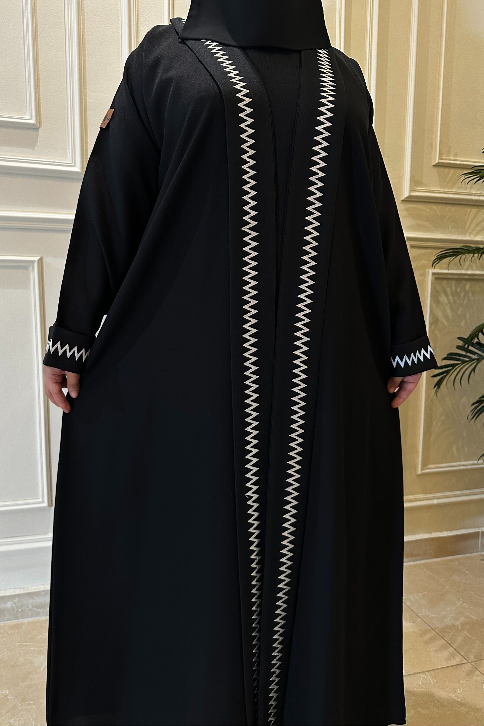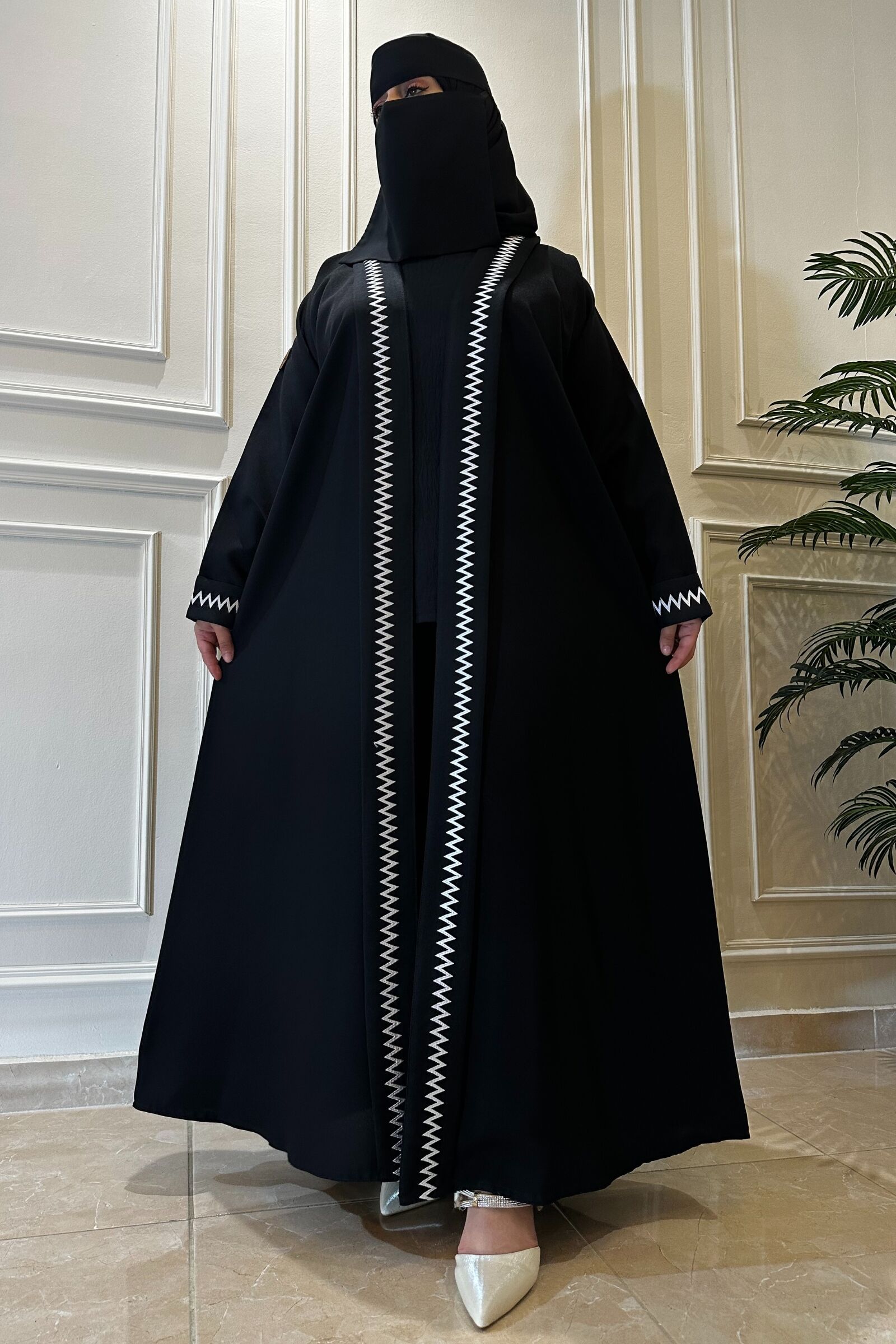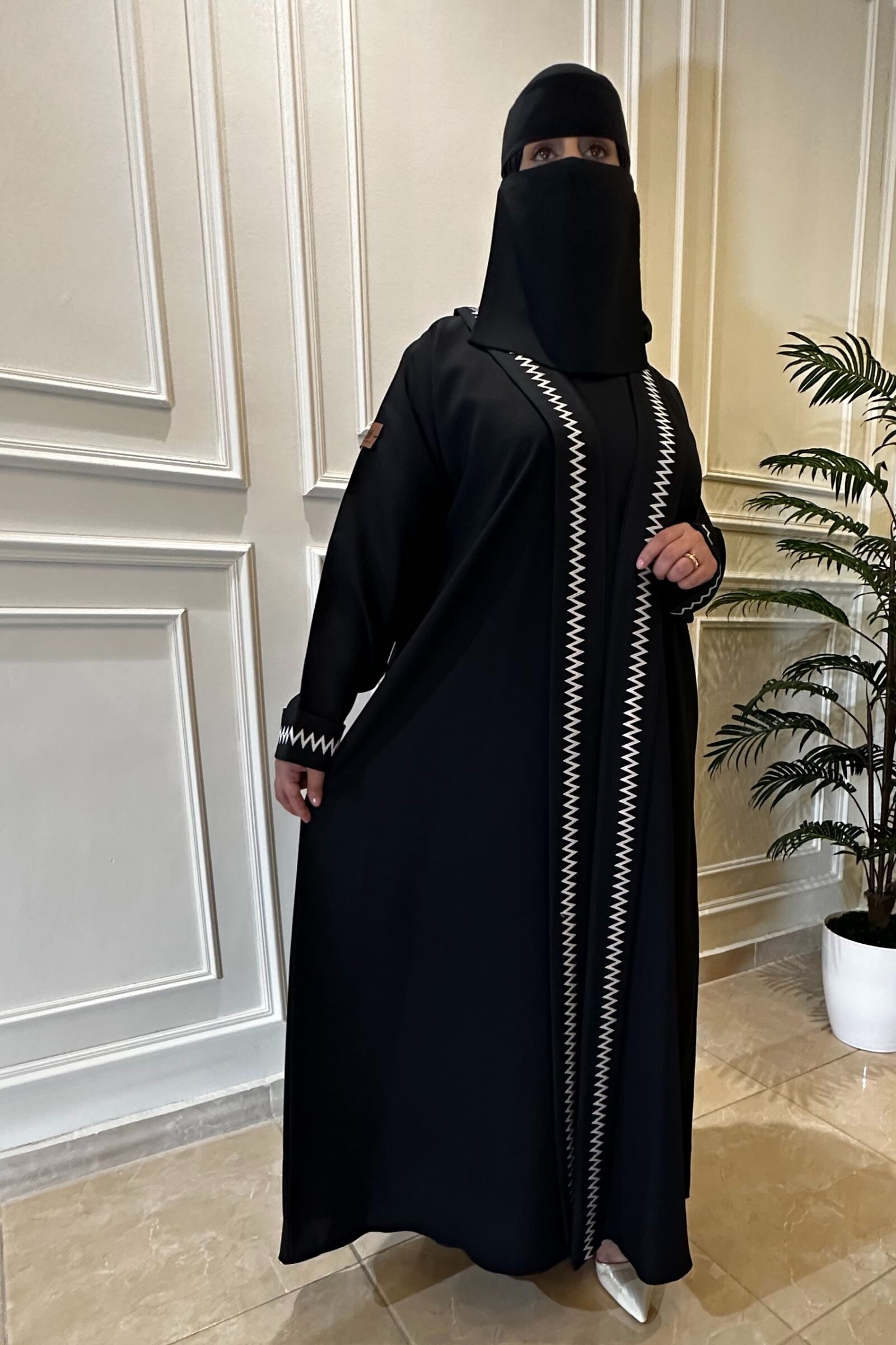 فخامة اللون الأسود لا يضاهيها شيء ، فما بالك بعبايه كلاسيك فخمه بتطريز محدد باسهم بلون كحلي ، مصممه بإبداع من قماش منى ميد عالي الجودة ، وخيوط مبتكر و مميزة بلون ابيض من امام ليعطي شكل مميز ، ستكون اكثر عباية سوداء ، تناسب مختلف المناسبات و الأوقات و دوام .