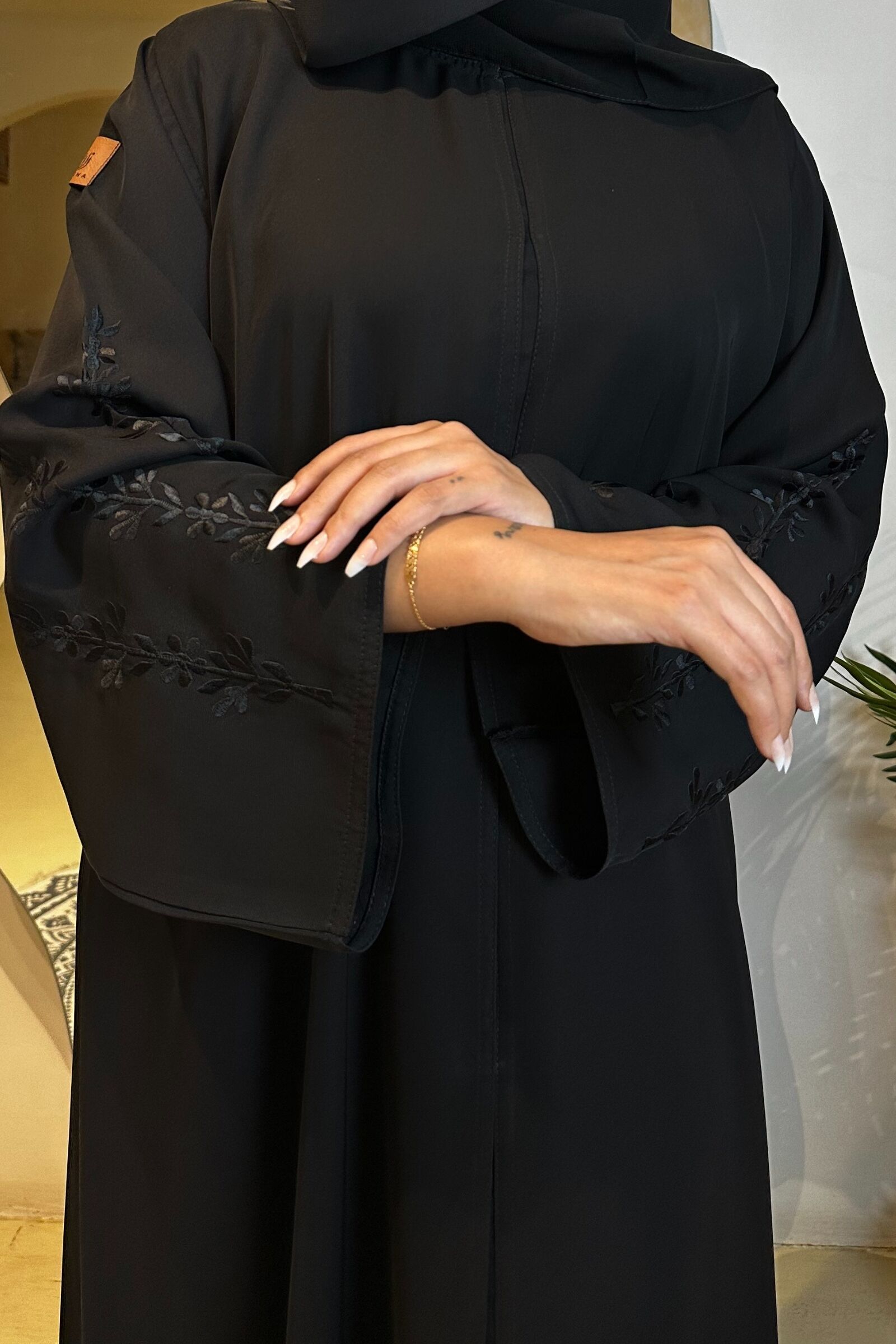 عباية كتف مطرز باسود مخفى على الكم على شكل جذور ورد