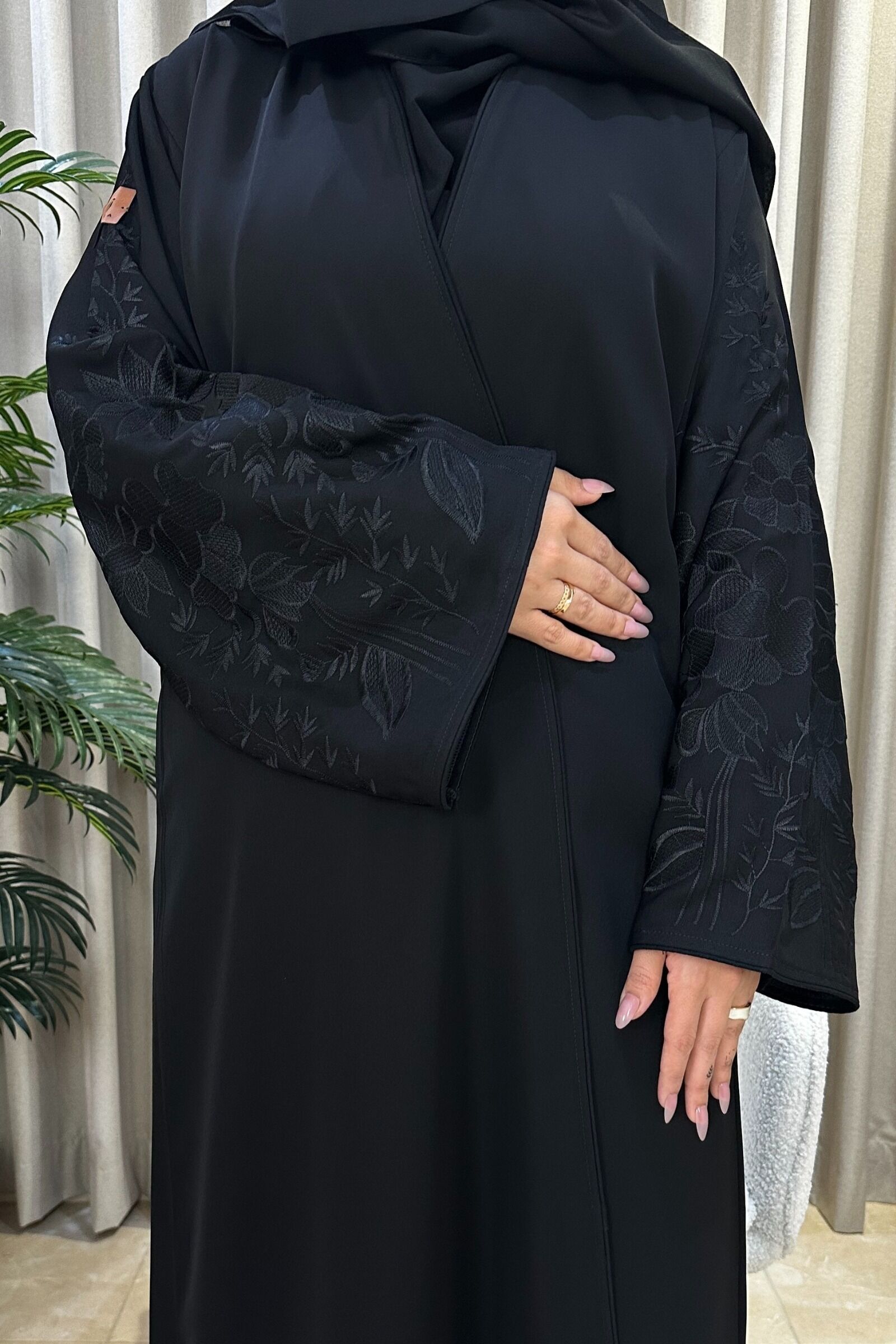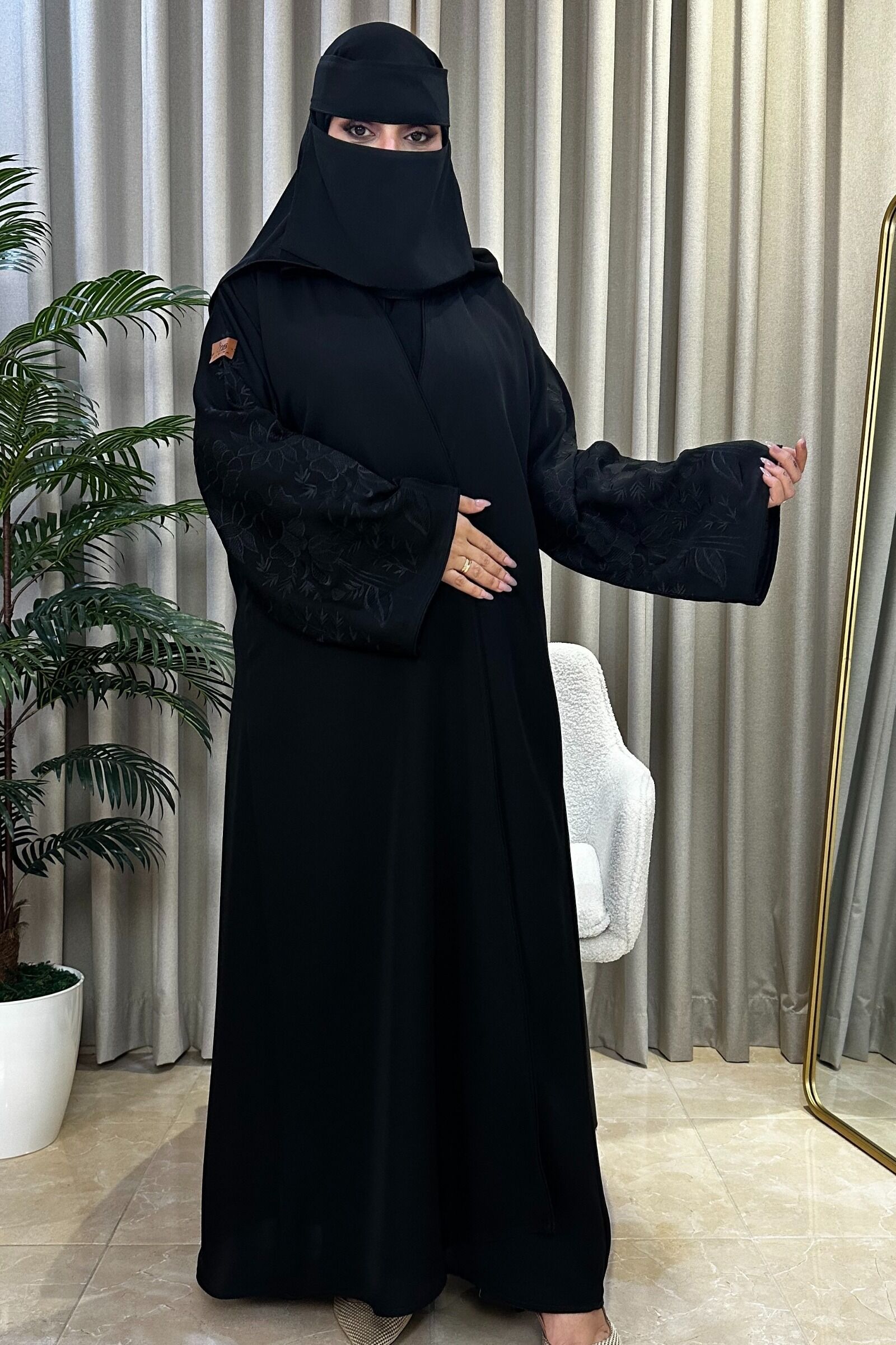 عبايه بتطريز اسود على اكمام بأسلوب مبتكر