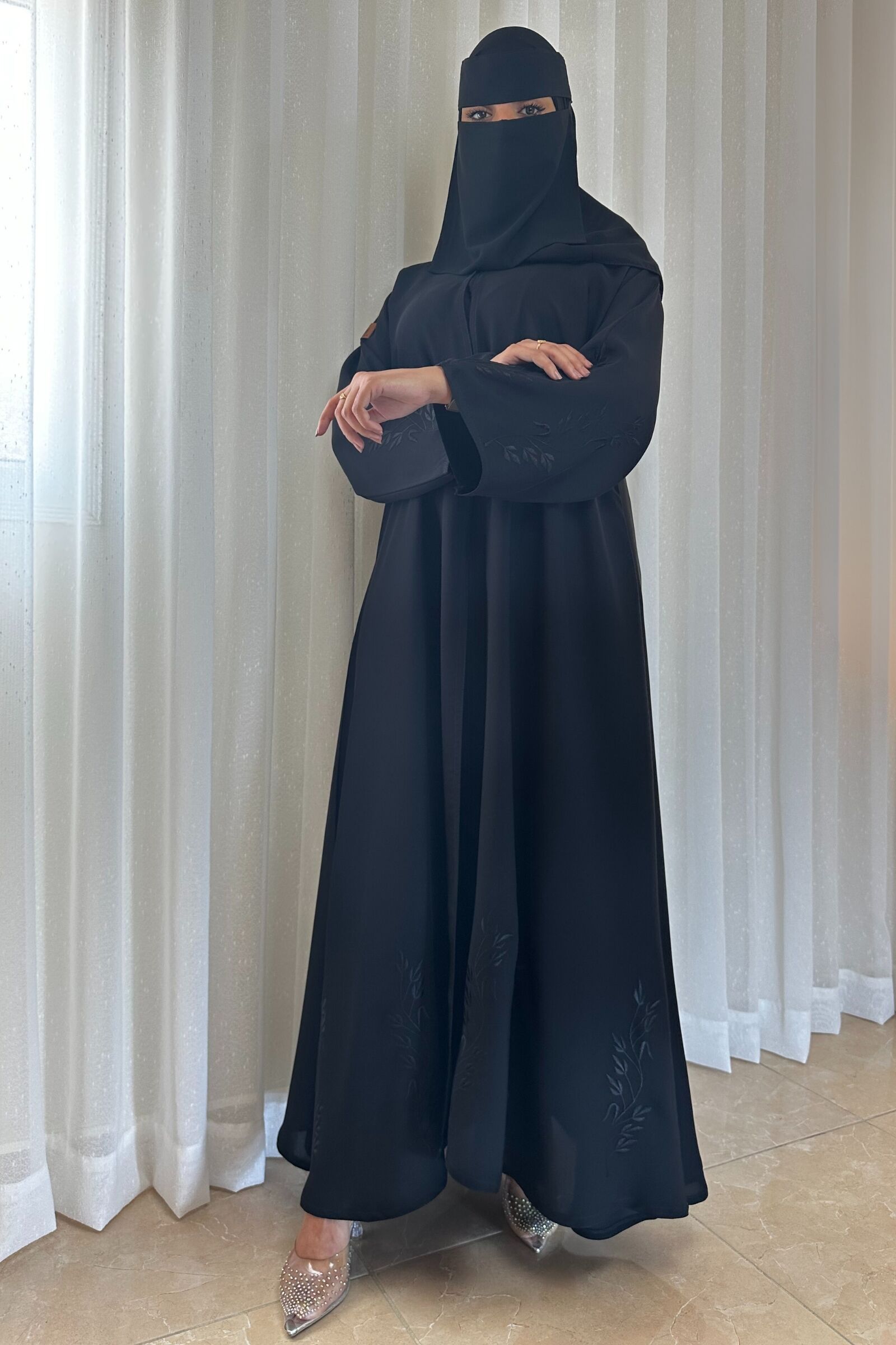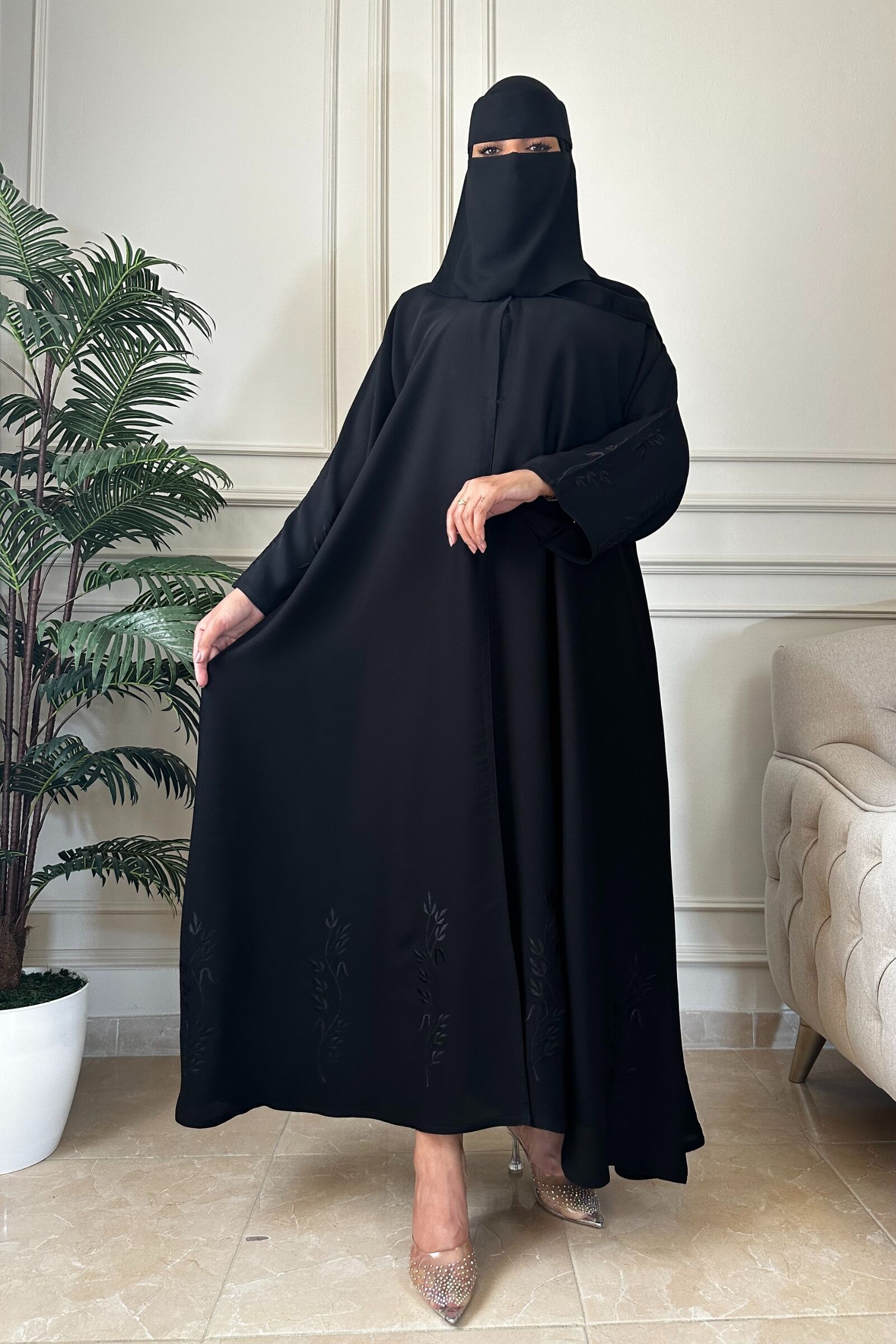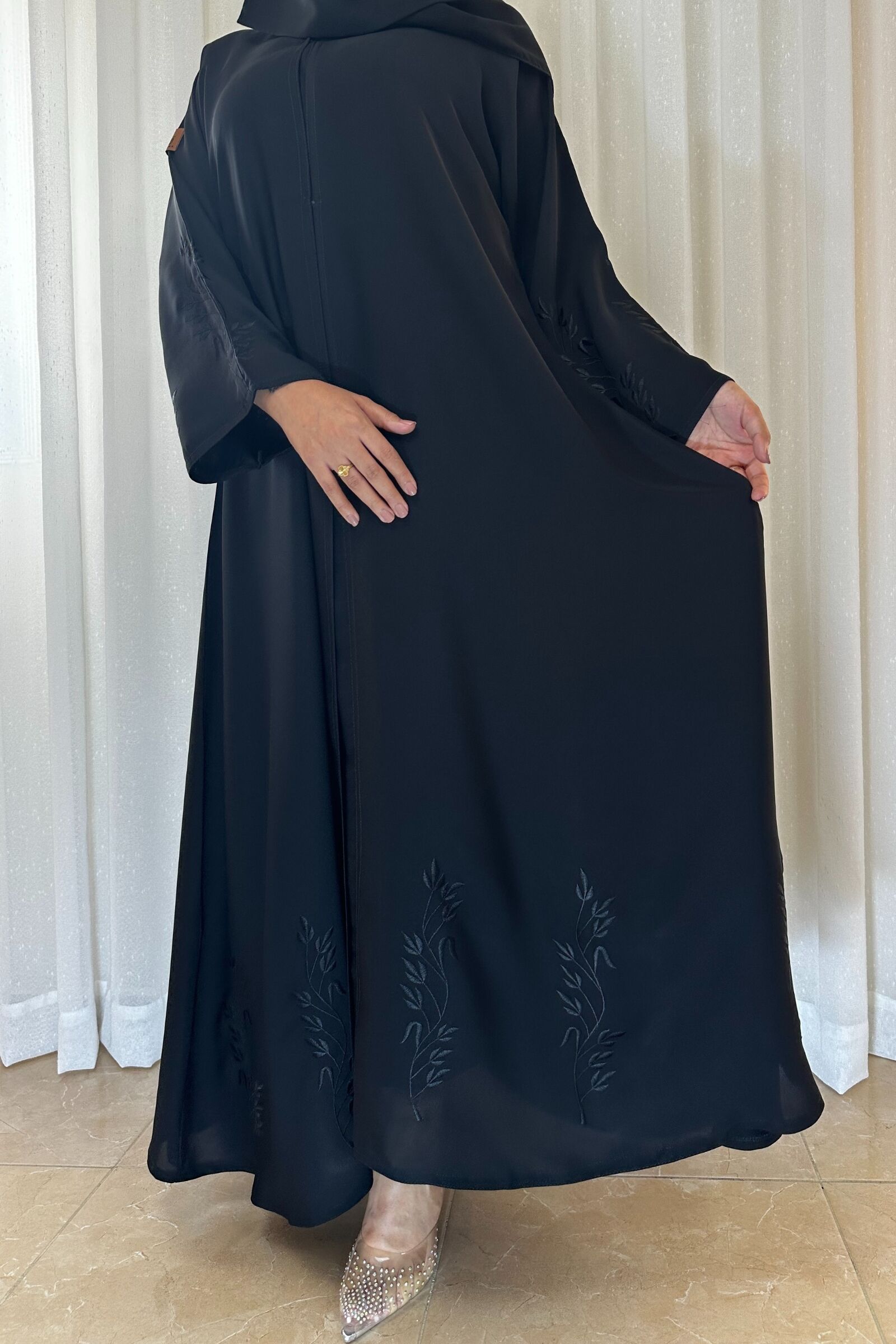اختاري هذه العباية الكلوش بتطريز ناعمة على اكمام واسفل العبايه لتتألقي بإطلالة عصرية وجذابة تجمع بين الأناقة والراحة في جميع المناسبات
