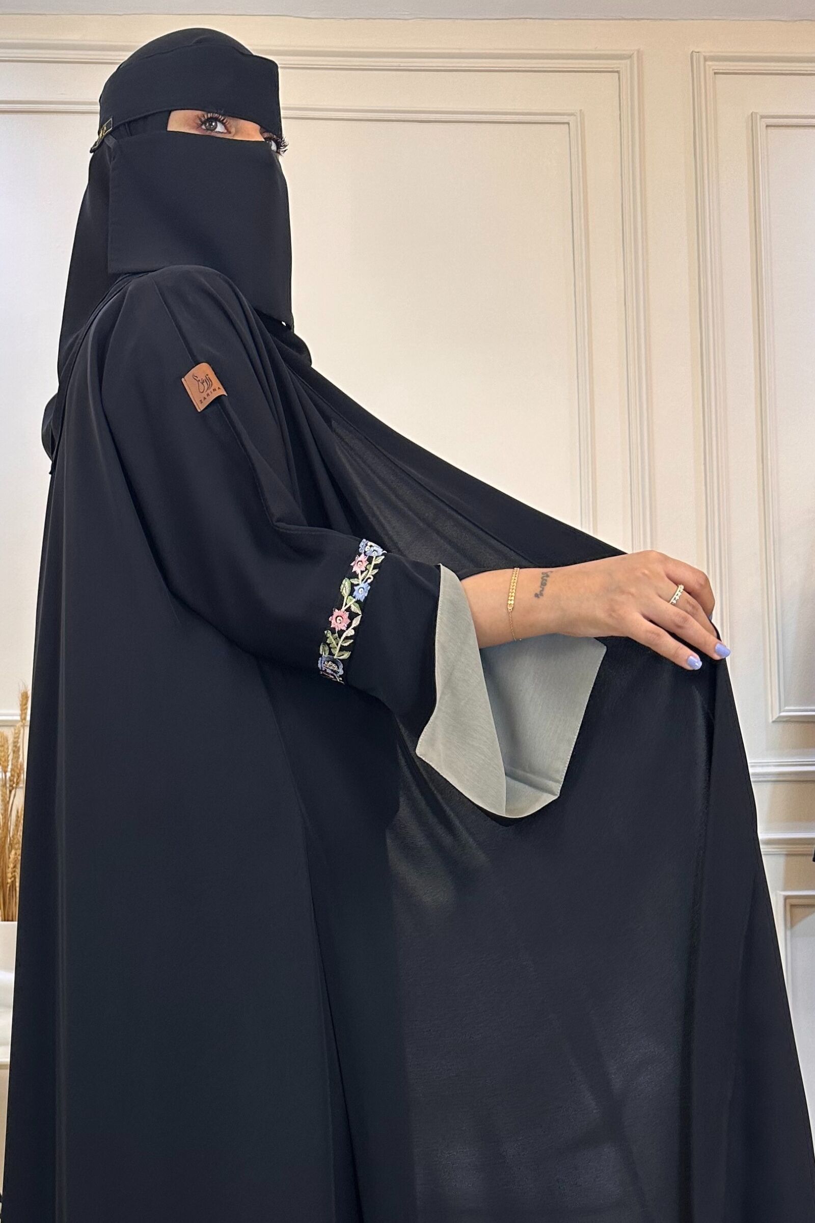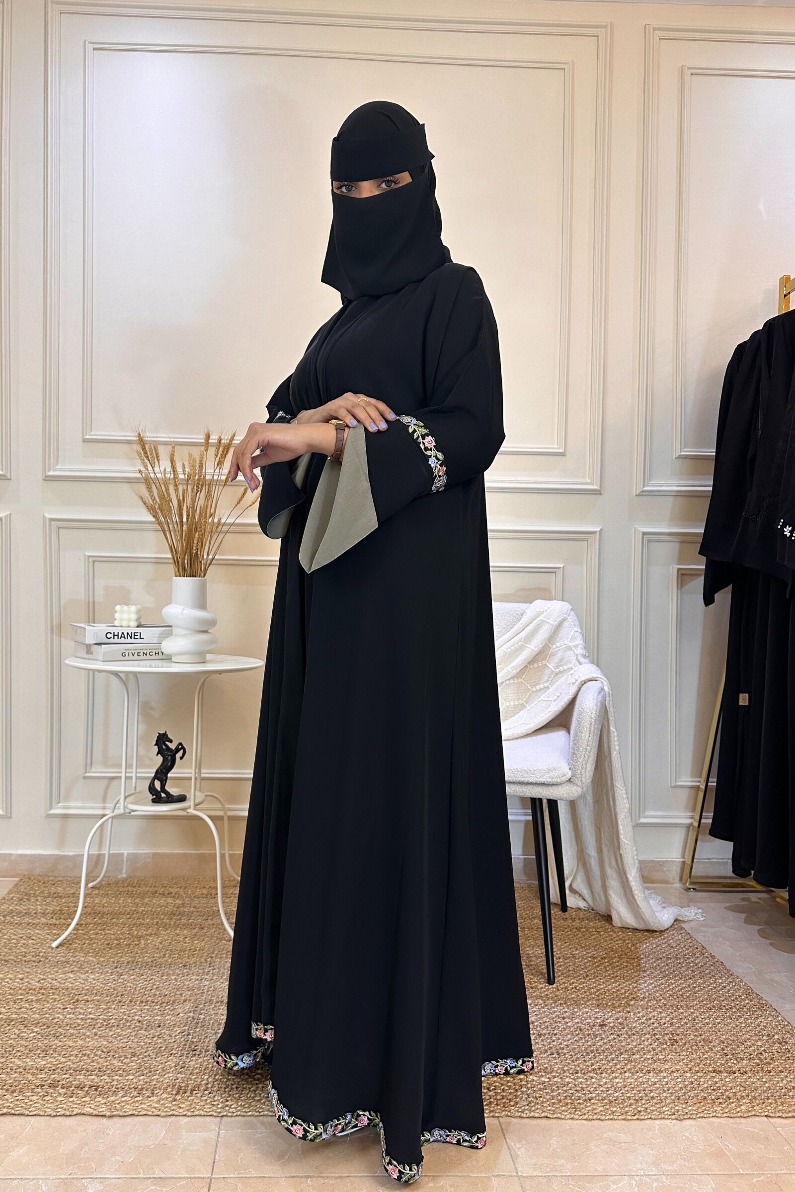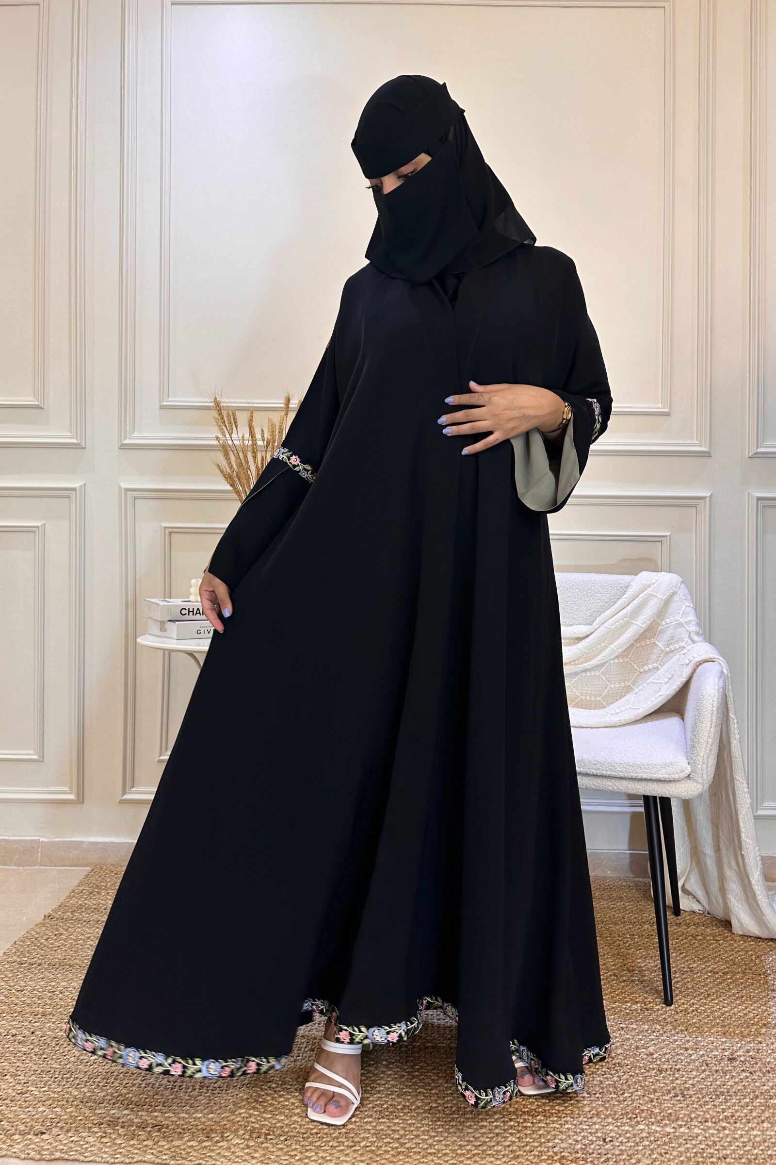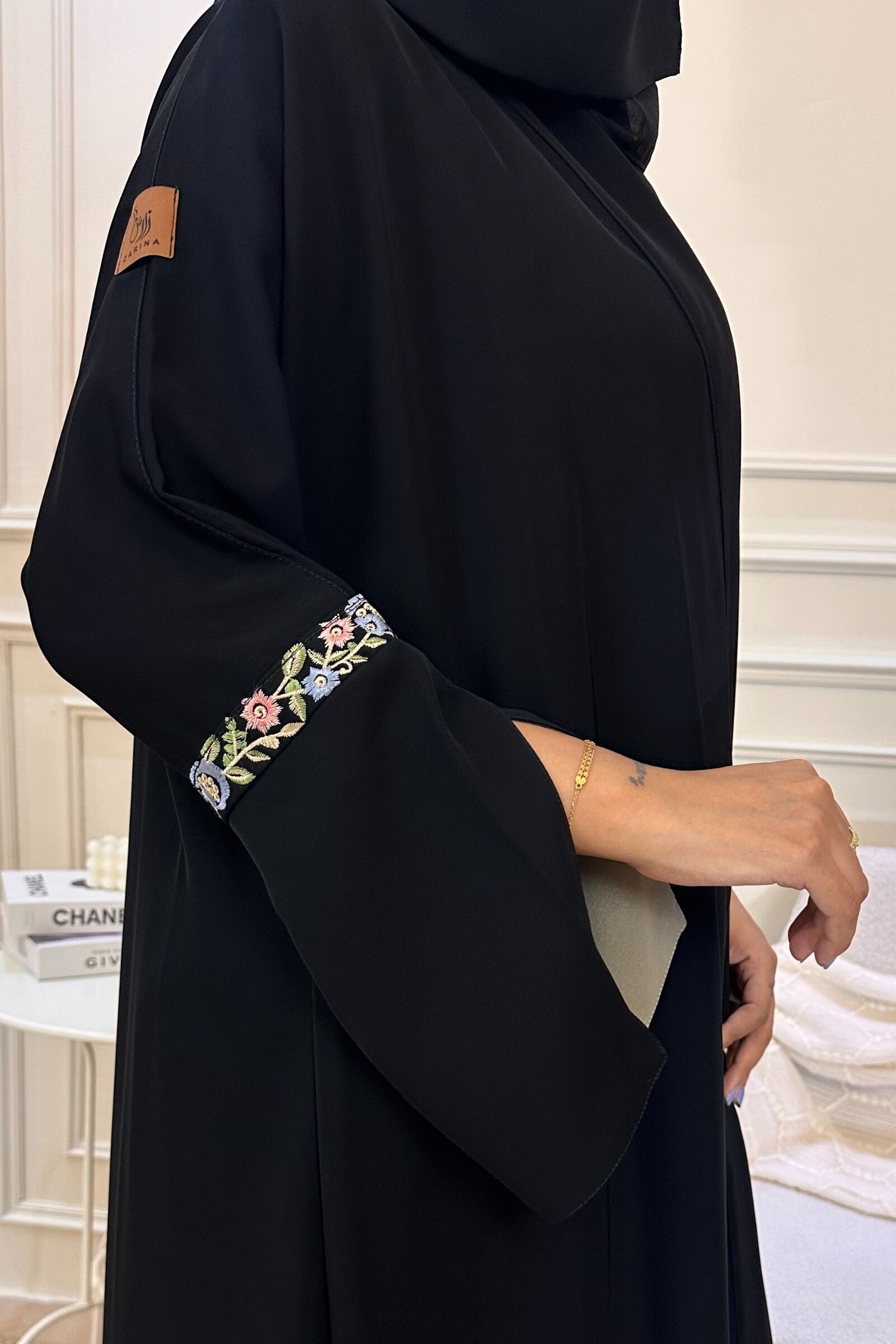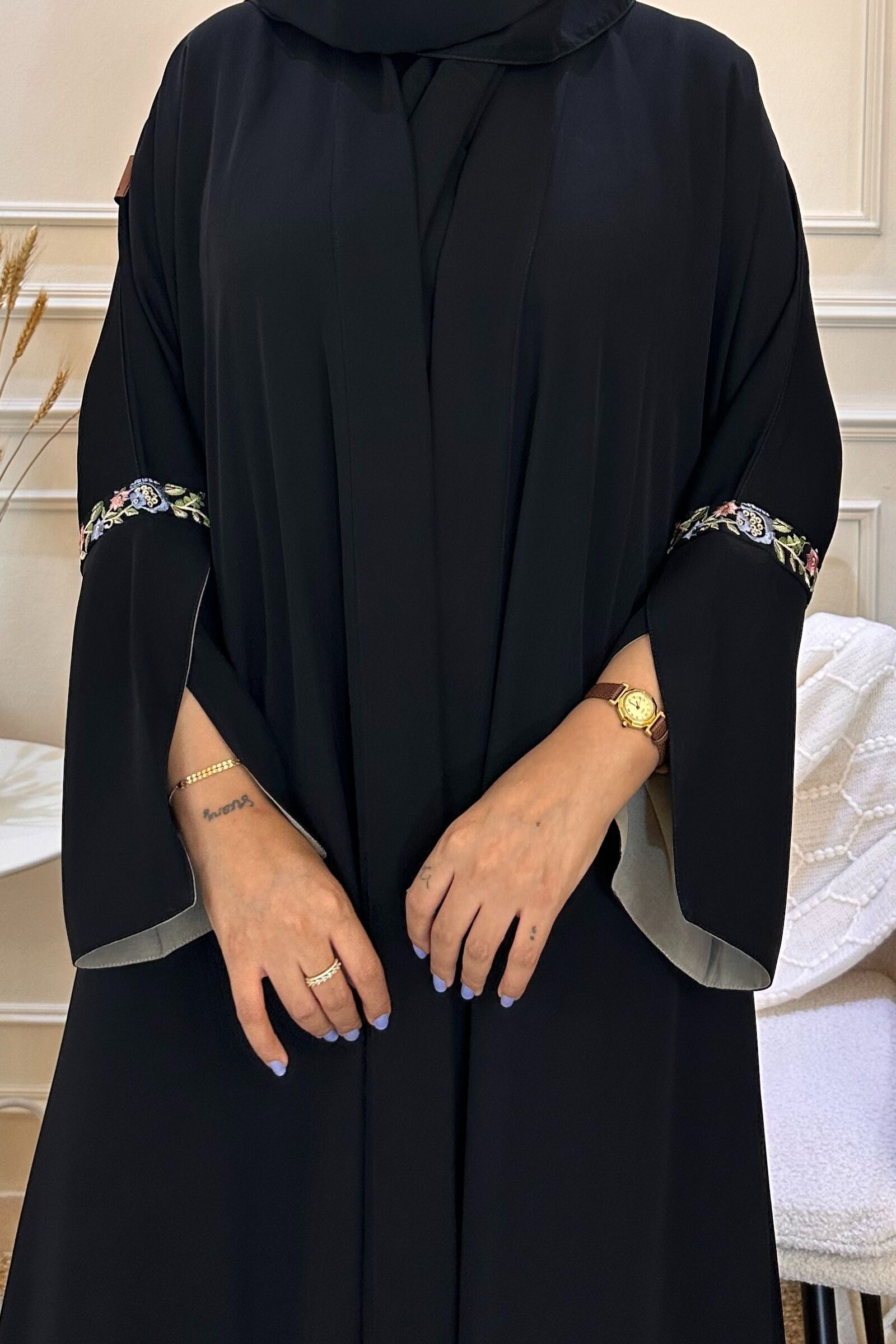 الأكمام: مطرزة بورود ملونة من الكم وأسفل العباية.