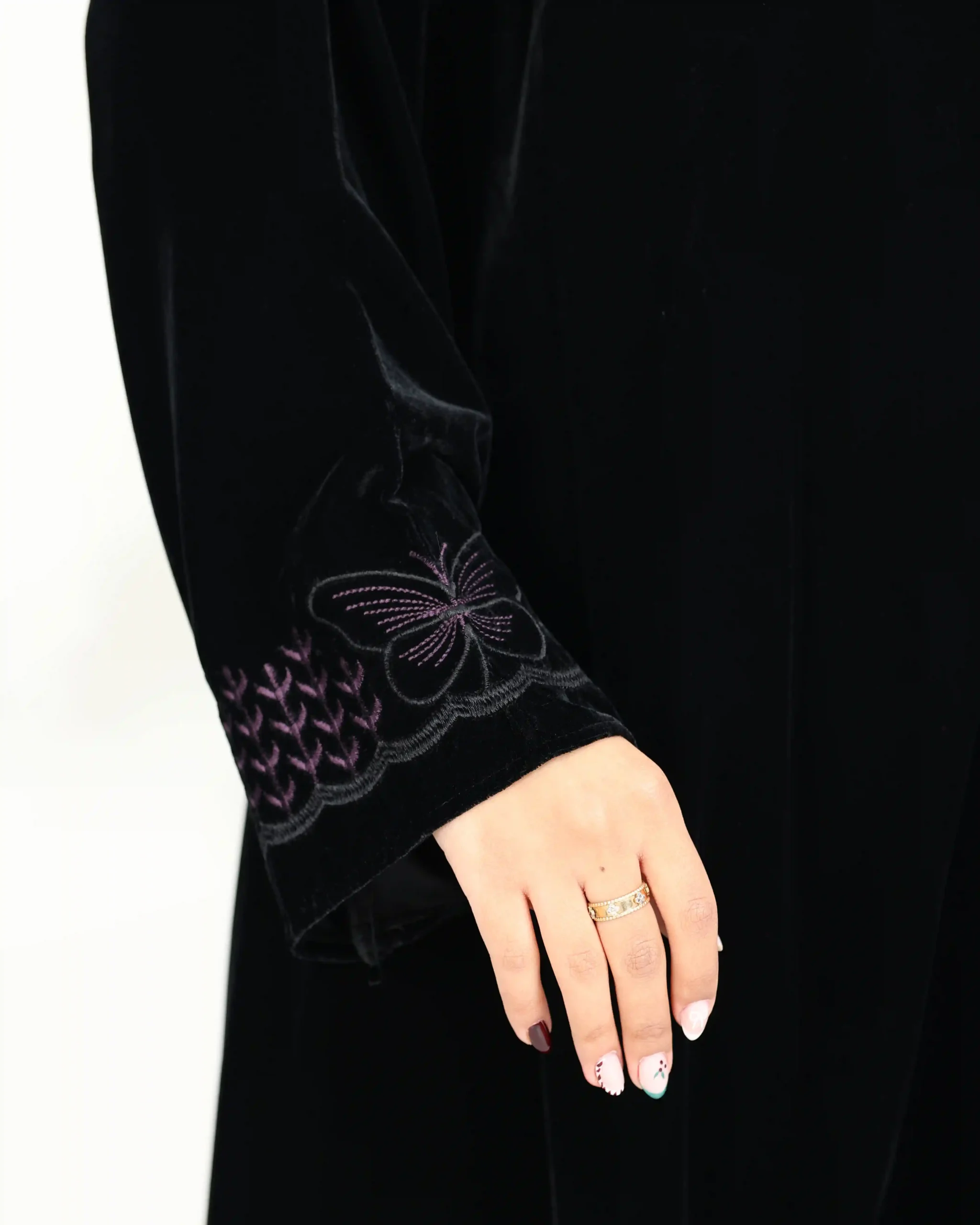 عباية مخمل مطرزة بفراشة بلون موف