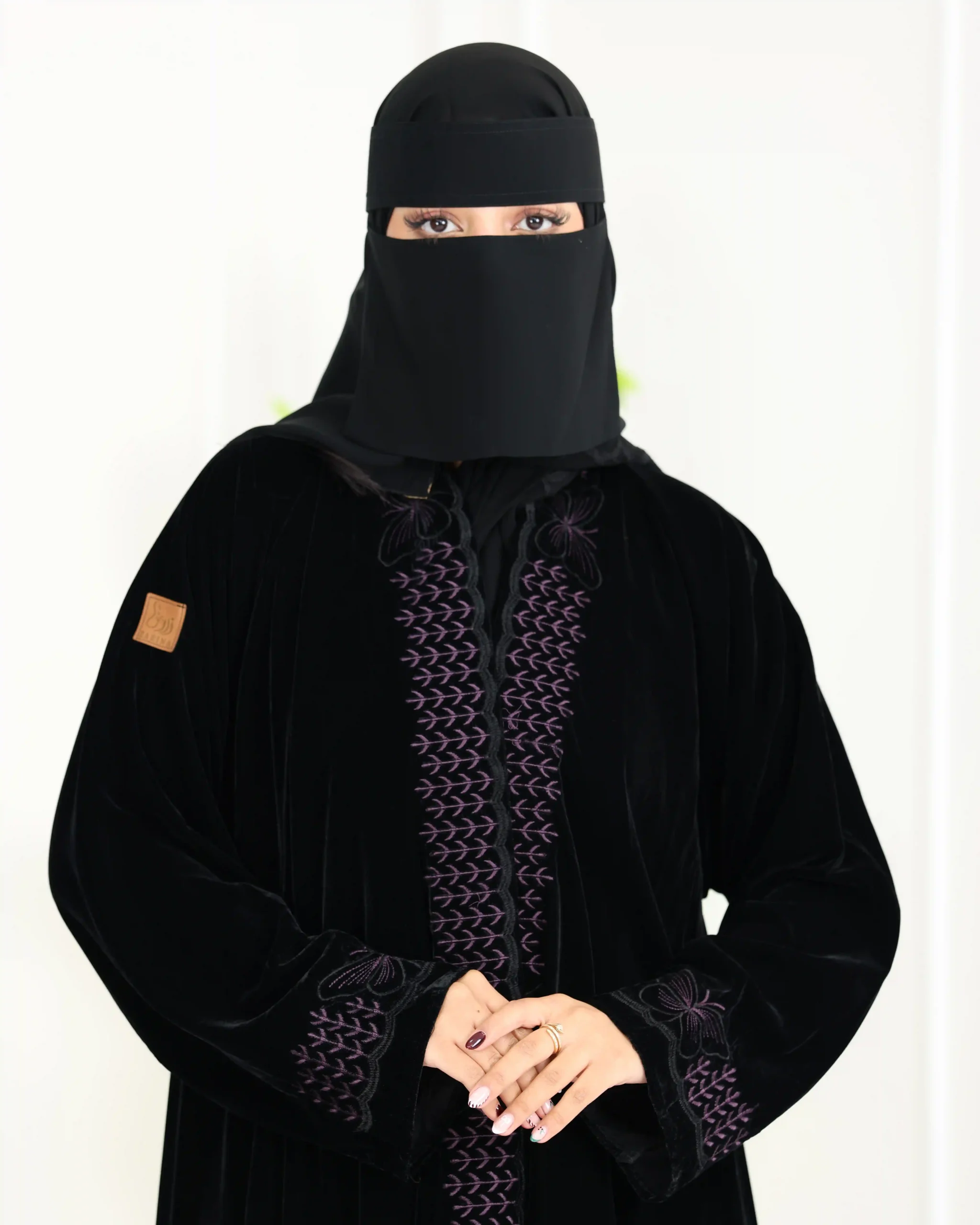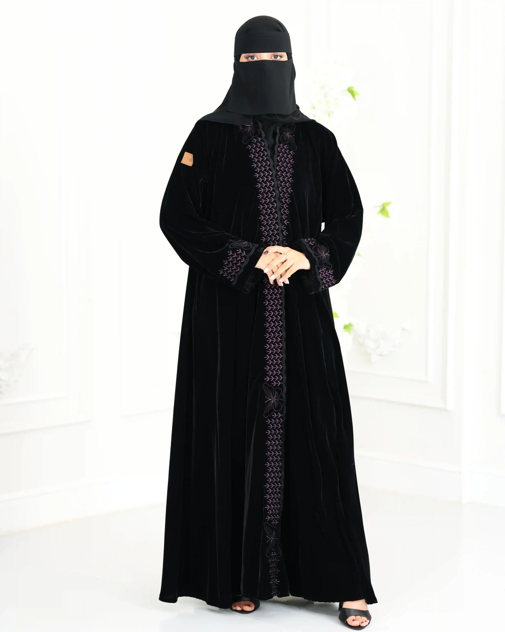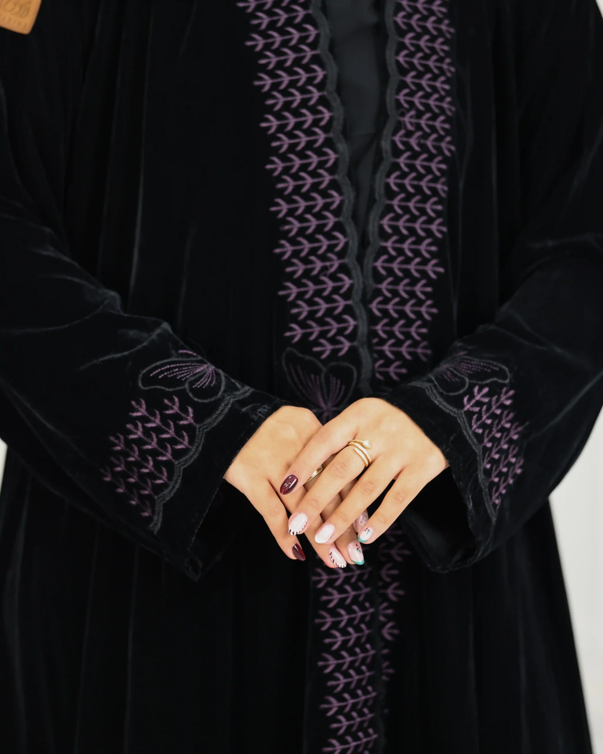 عباية مخمل فراشة مطرزة بالموف هي قطعة فاخرة تتميز بخامة المخمل الناعمة والدافئة و أنيق، وقصة كلوش الفضفاضة والمريحة التي تضفي لمسة أنثوية ، مع تطريزات بارزة من امام بخيوط موف شك، وعلى الأكمام والحواف لتعزيز الجمال والتفرد، مثالية للمناسبات الخاصة وتجمع بين الفخامة والراحة