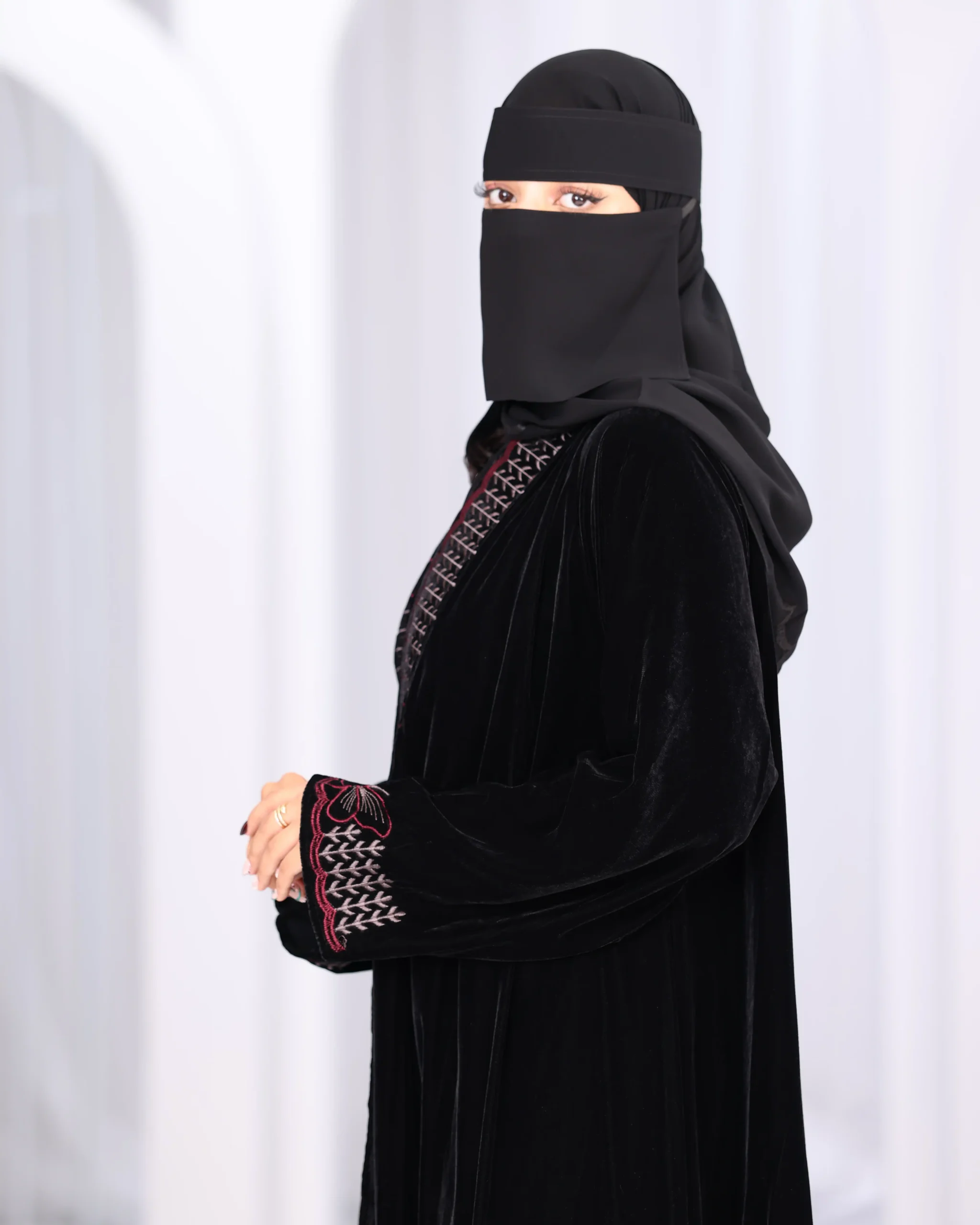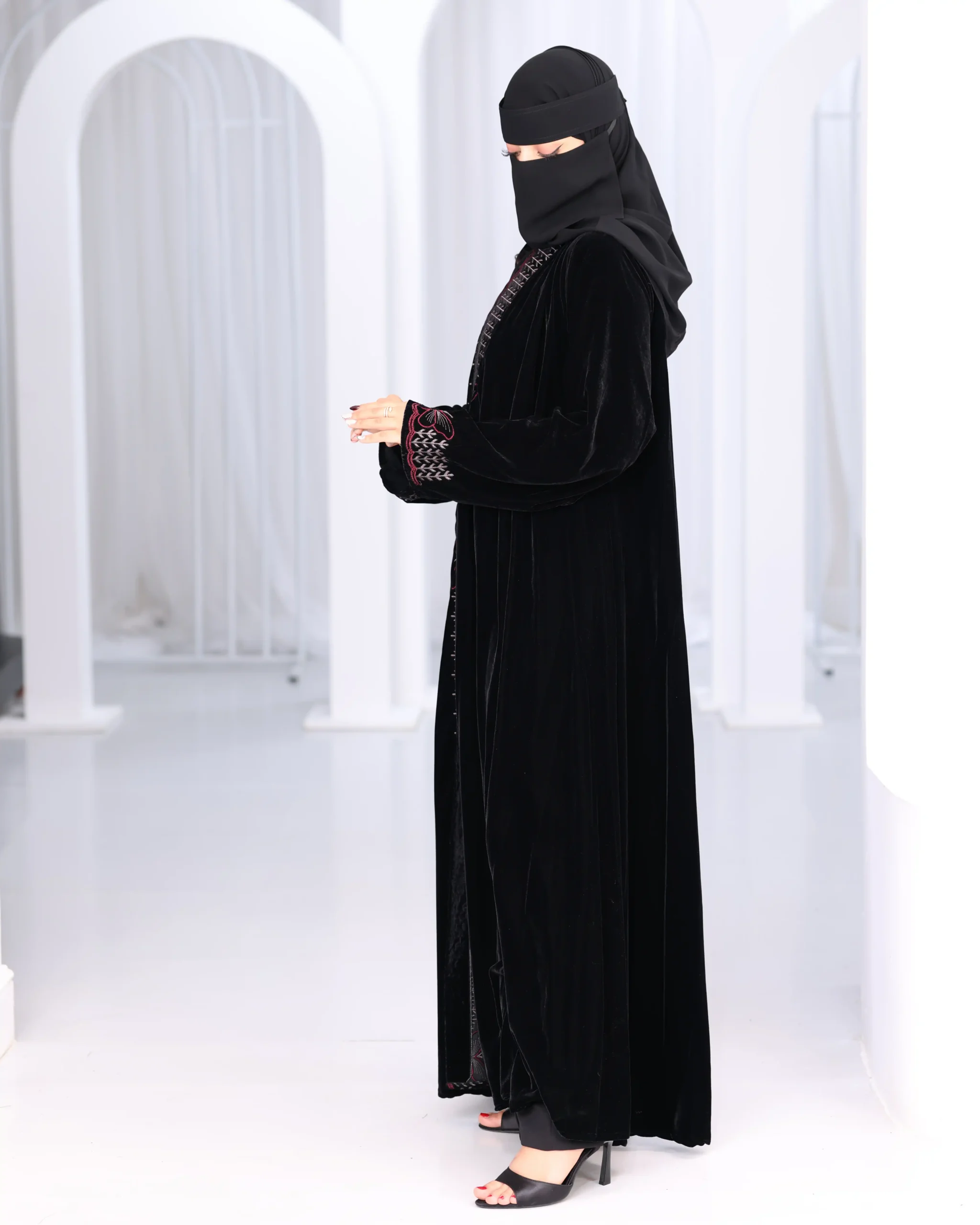 عباية مخمل بتطريز شك ابيض على اكمام