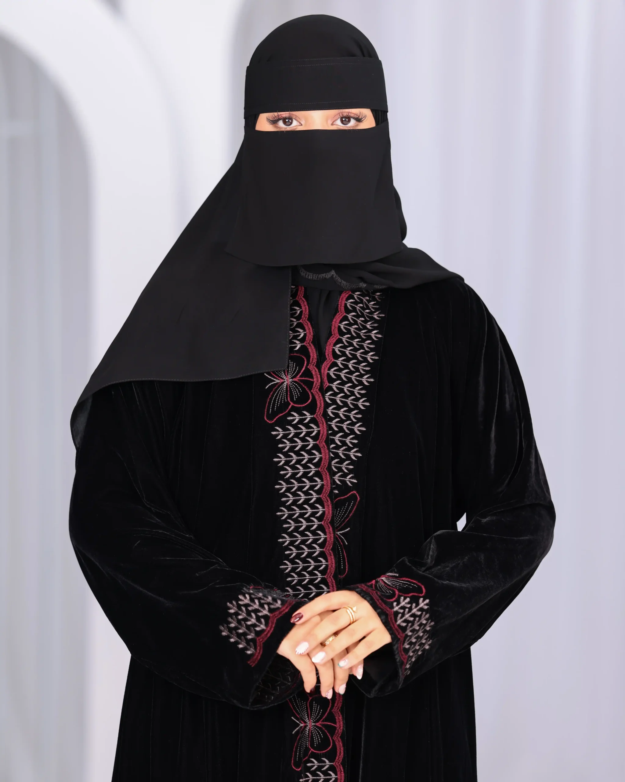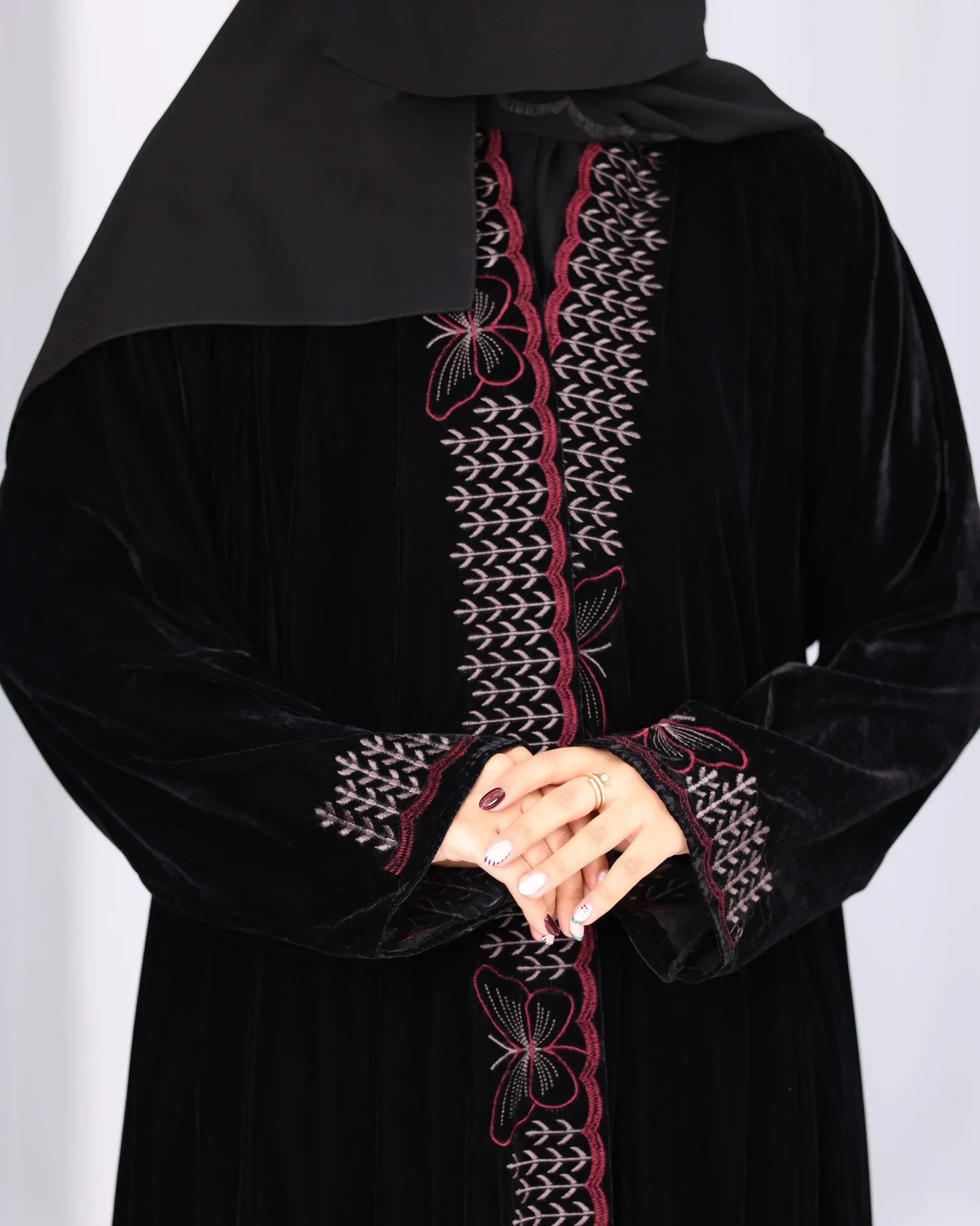 عباية مخمل فراشة مطرزة بالعنابي هي قطعة فاخرة تتميز بخامة المخمل الناعمة والدافئة و أنيق، وقصة كلوش الفضفاضة والمريحة التي تضفي لمسة أنثوية ، مع تطريزات بارزة من امام بخيوط عنابي شك، وعلى الأكمام والحواف لتعزيز الجمال والتفرد، مثالية للمناسبات الخاصة وتجمع بين الفخامة والراحة