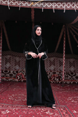 - لأنها عبايه حلوه عبايه بدقات بكم مفصول جاكار مشجره بالأسود الفخم ، ليمنح إطلالتكِ بريقاً مميزاً .