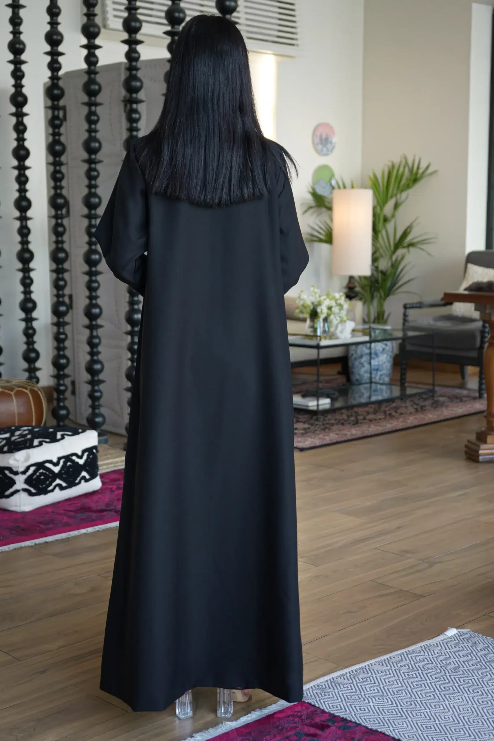 عباية رسمية مصنوعة من قماش كتان أسود فخم، تتسم بتصميم يجمع بين البساطة والفخامة.مما يضيف لها لمسة من الانسيابية والأناقة. الجزء علوي من العباية مزين بطزيز شك اسود ناعم، ليضفي لمسة فريدة ومميزة. الإطلالة بأسلوب راقٍ وأنيق، مما يجعلها مثالية للمناسبات الرسمية.