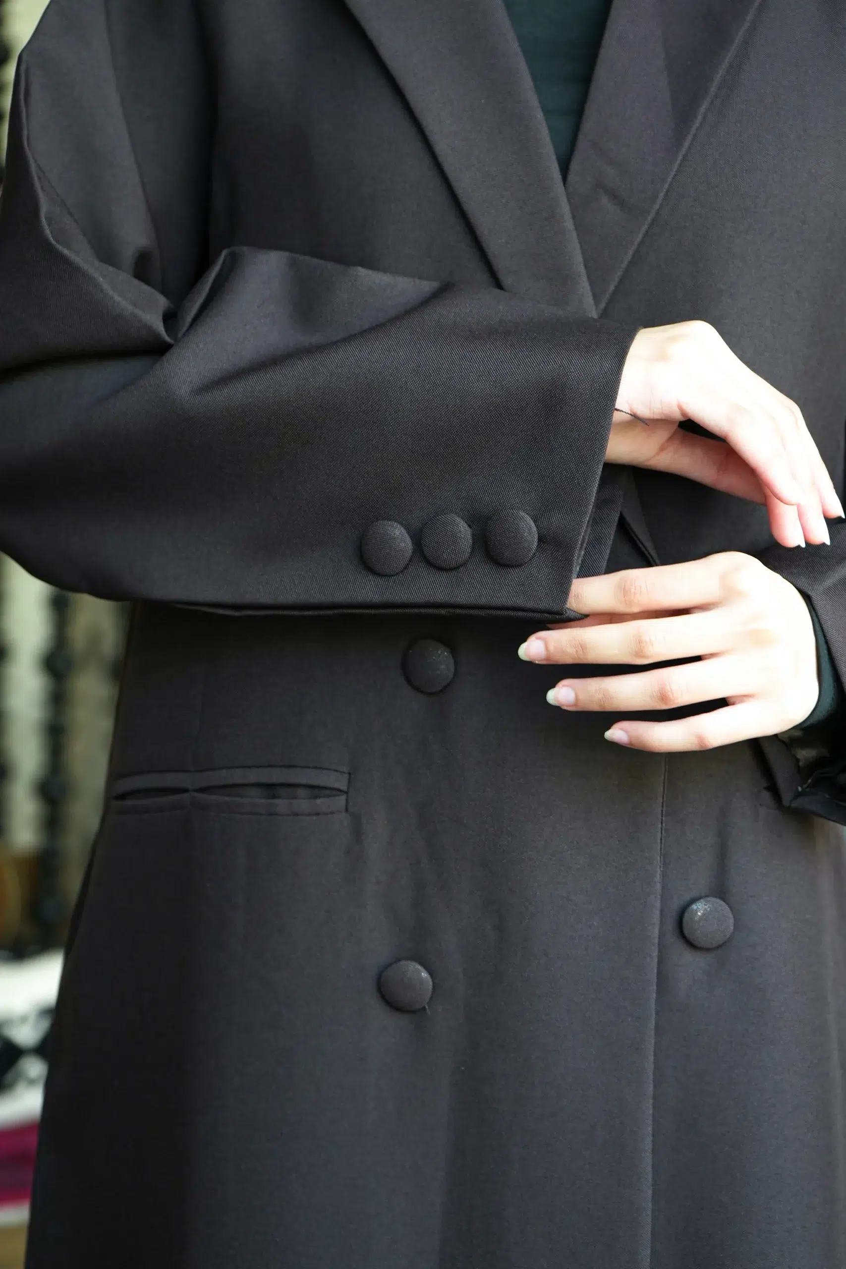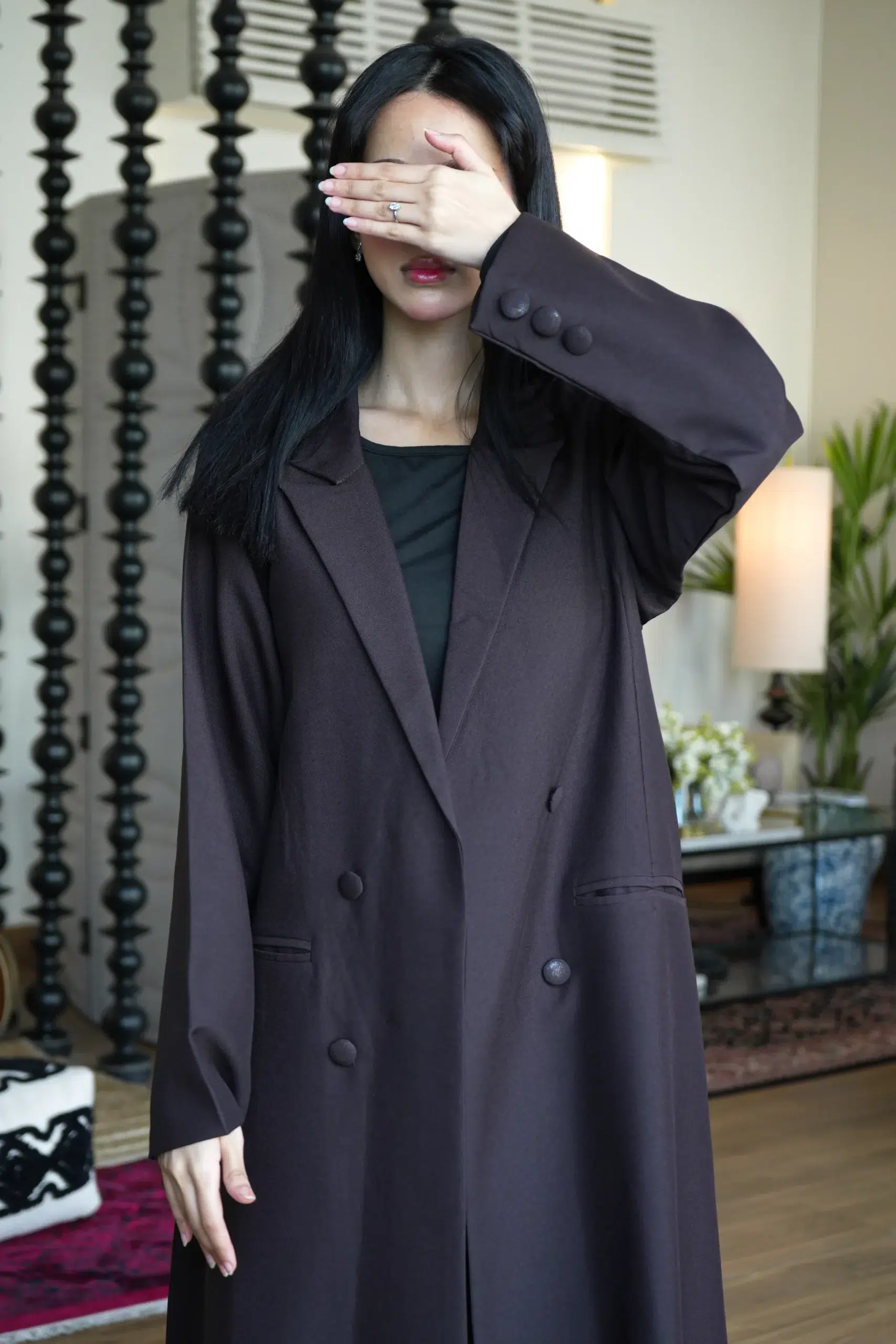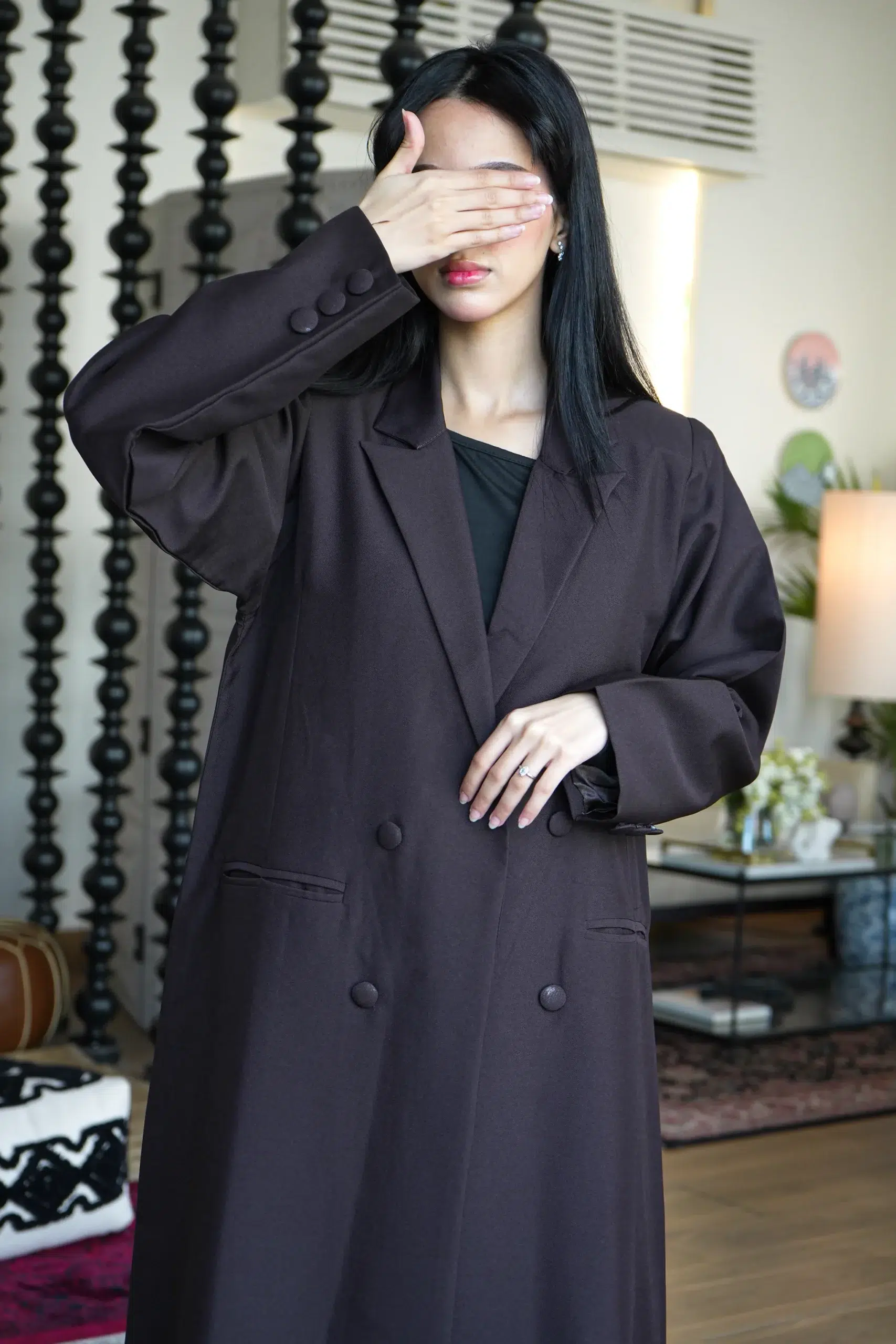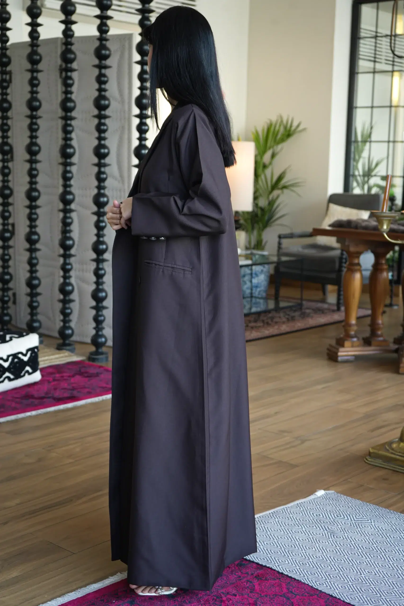عباية بليزر بني رسمية بجيوب تتسم بتصميم يجمع بين البساطة والفخامة.مما يضيف لها لمسة من الانسيابية والأناقة.