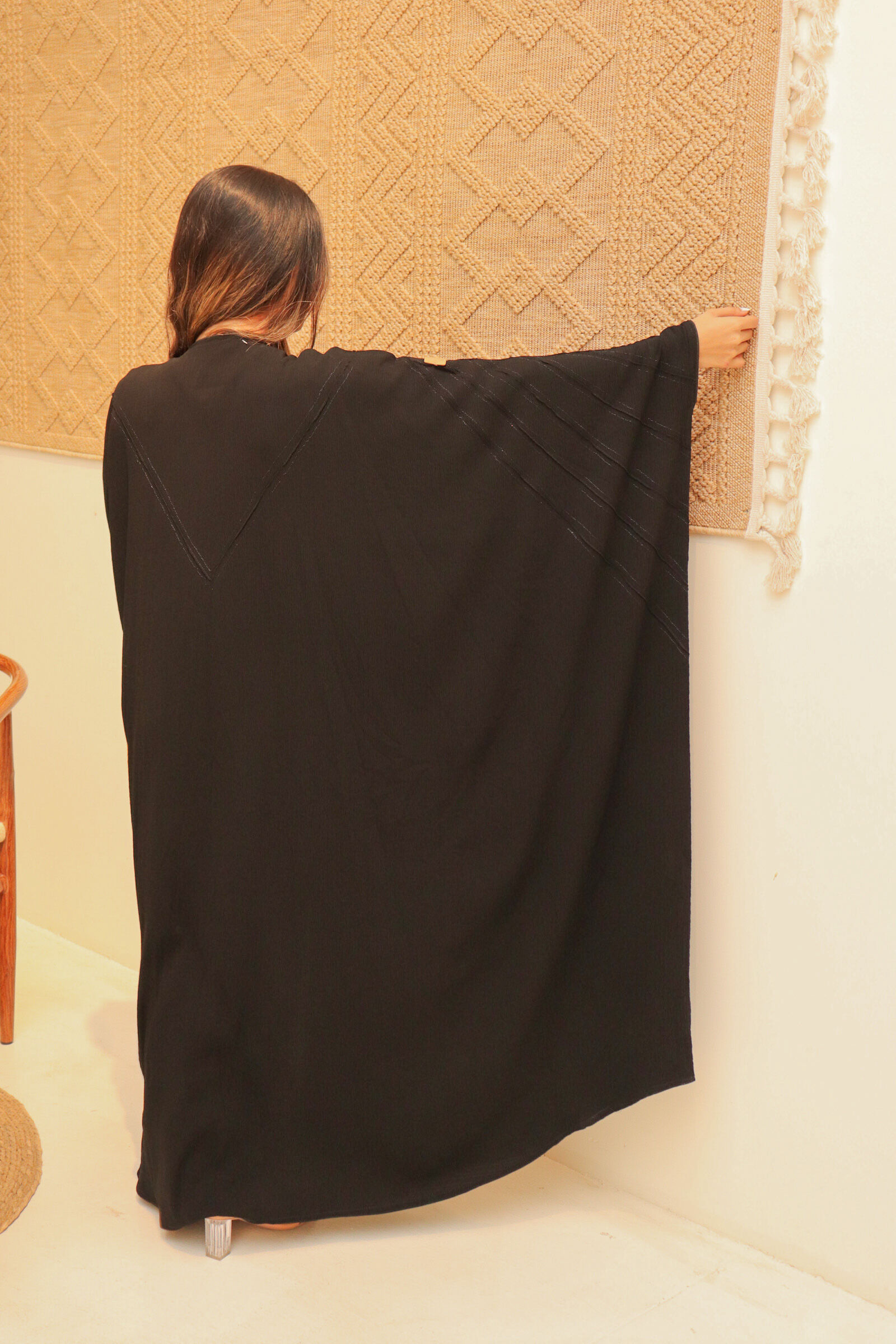 اكتشفي أناقتك مع هذه العباية البشت الإماراتية بقصة اللف، محددة بخطوط كحلي فاخرة تضيف لمسة ملكية لمظهرك.