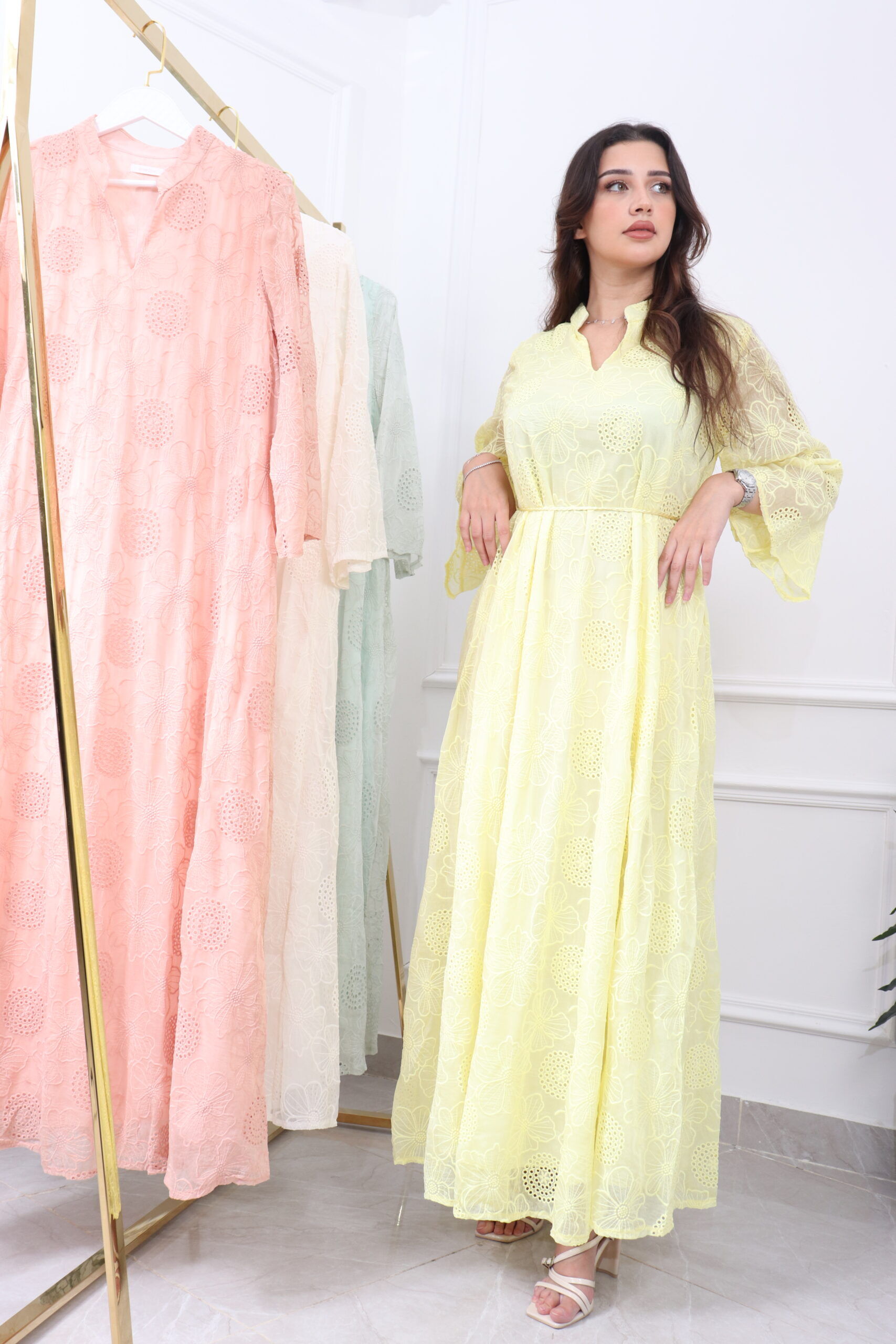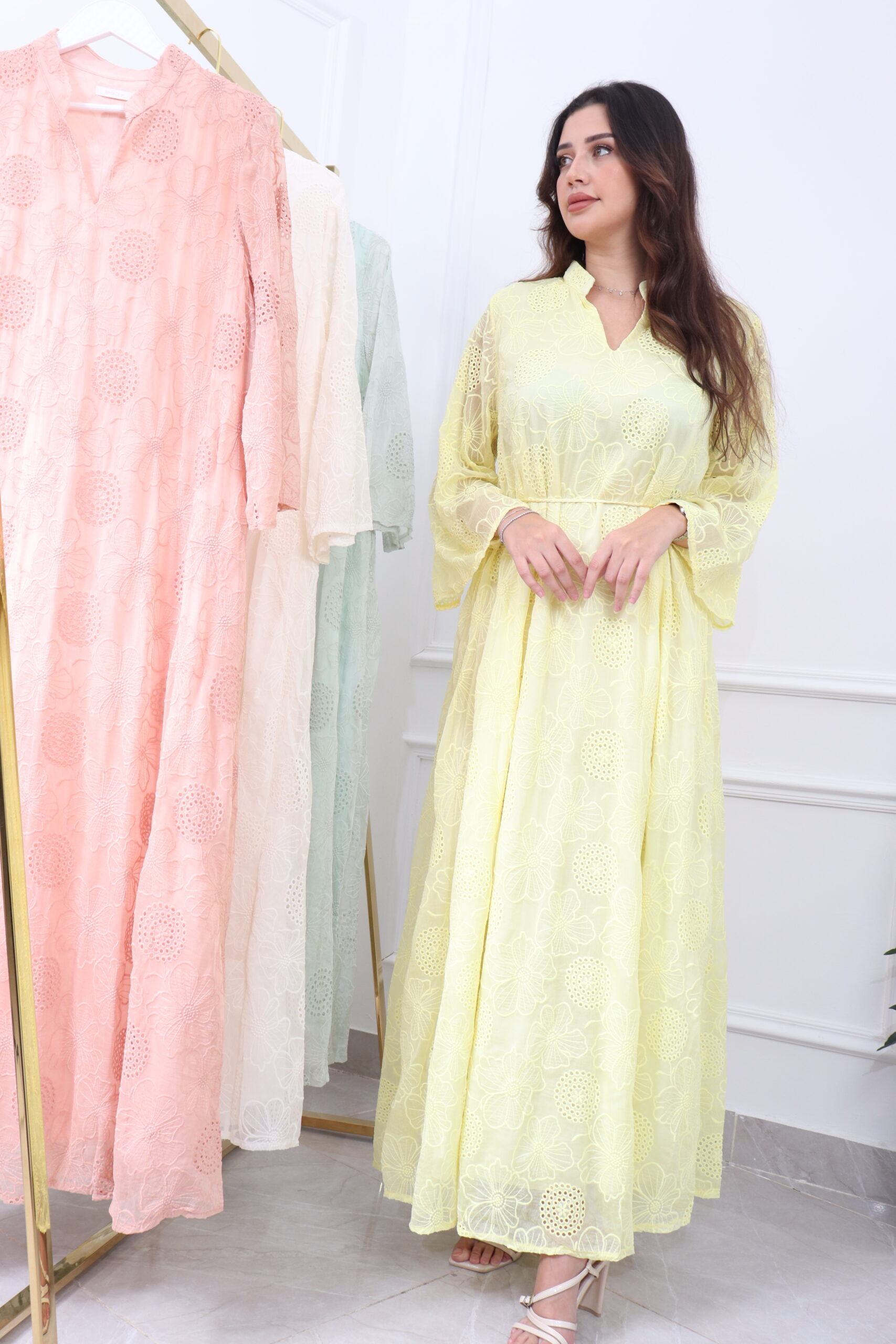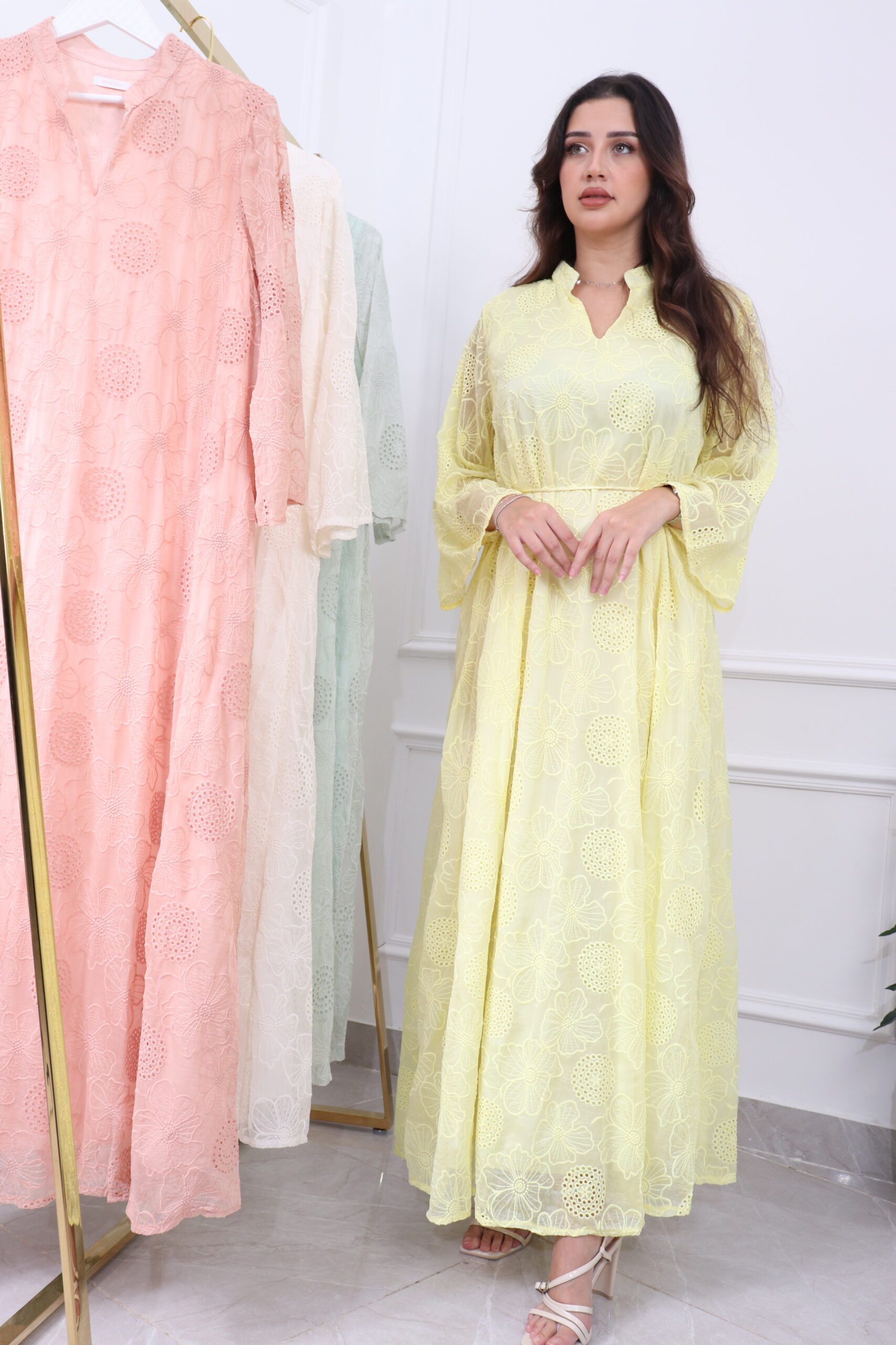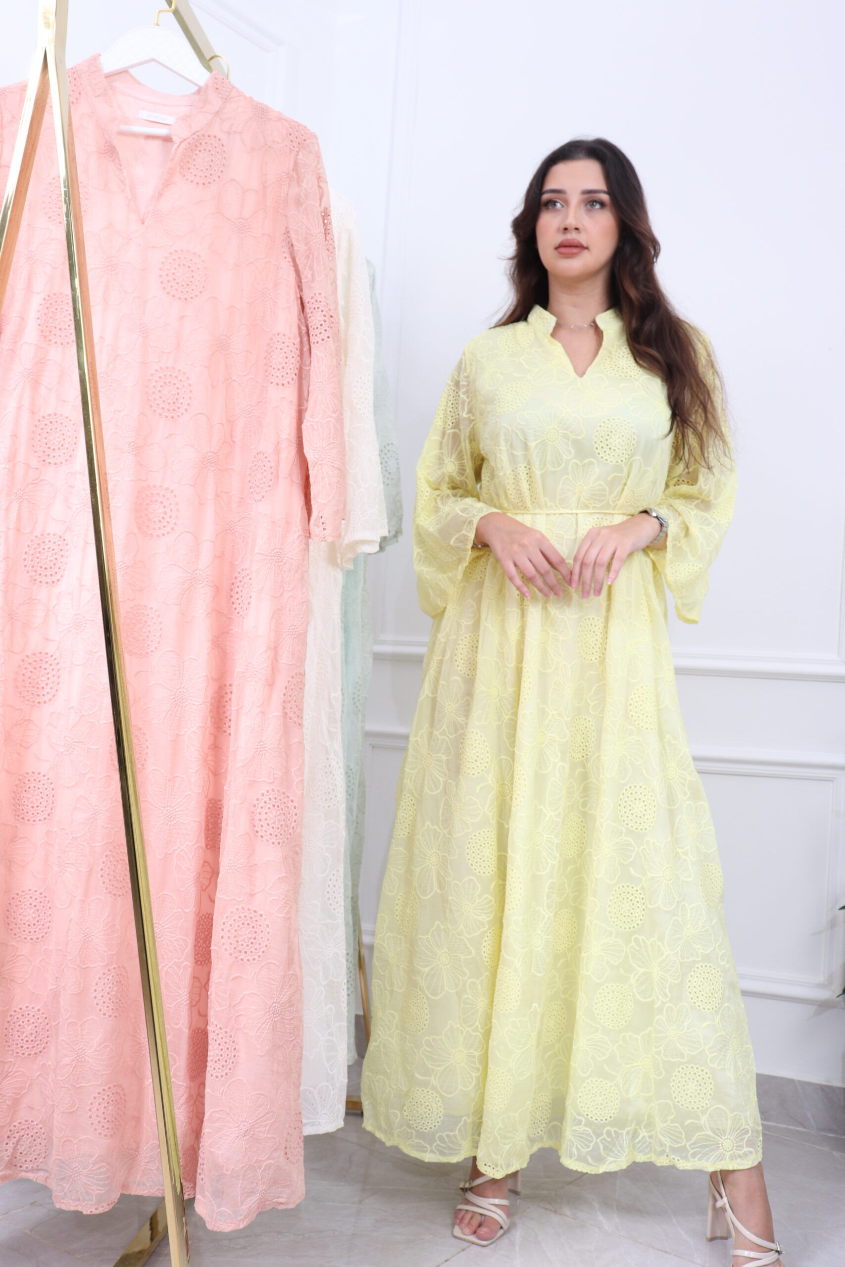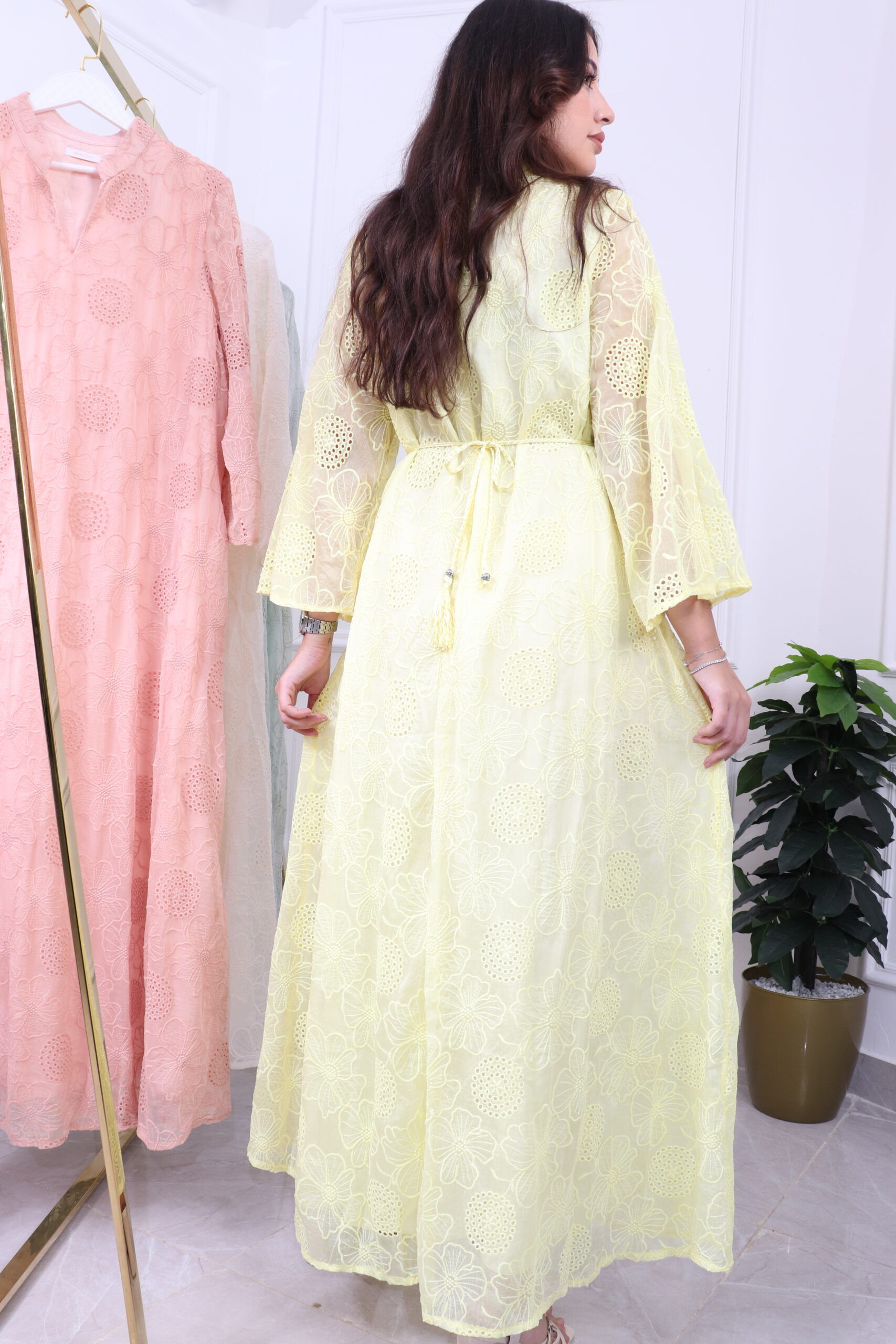 جلابية اصفر بنقوش الوان فخمة وبألوان زاهية تحبينها لأنها تشبهك بنفاصيلها الأنيقة، تصلح لكل مناسباتك وجمعاتك العائلية.