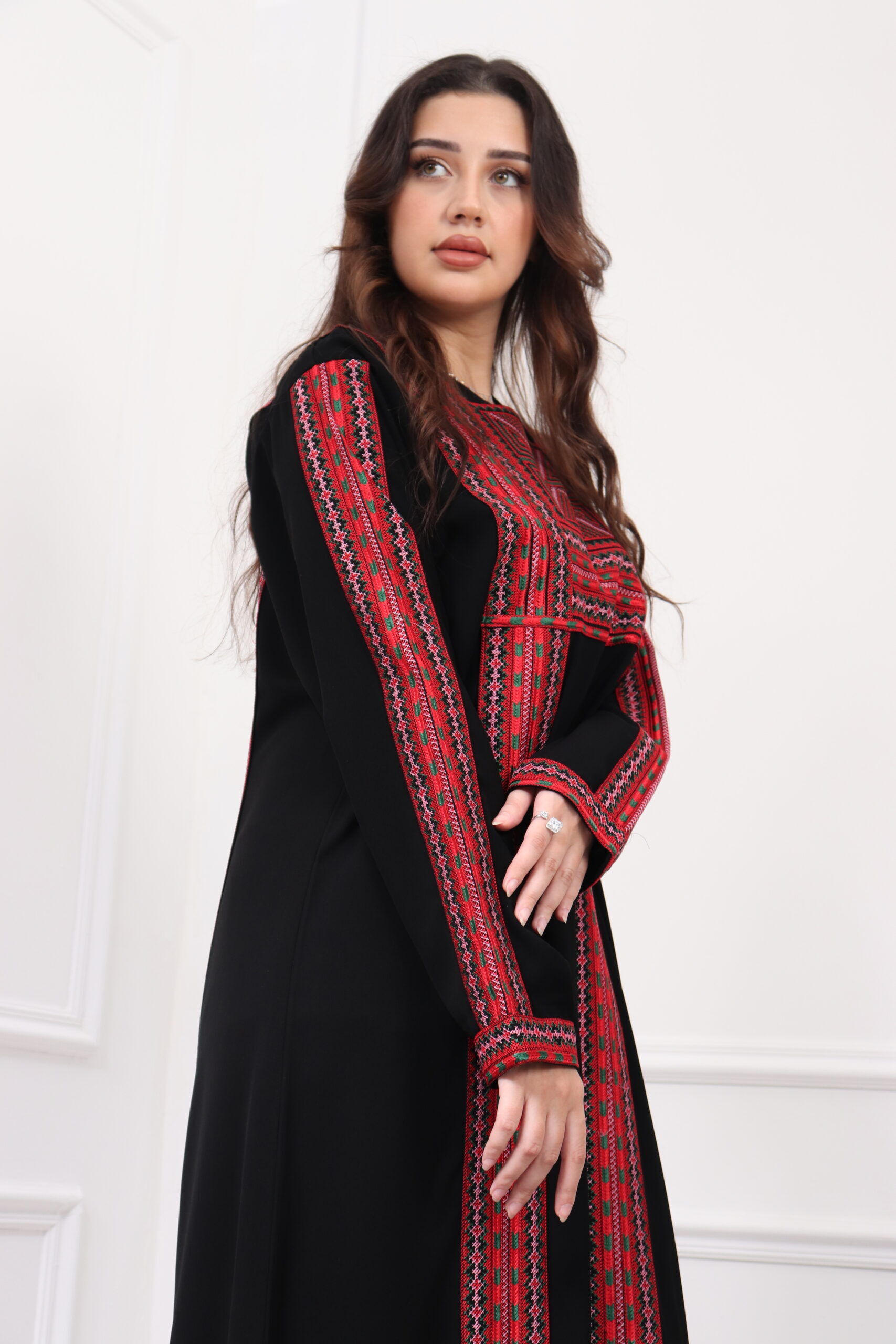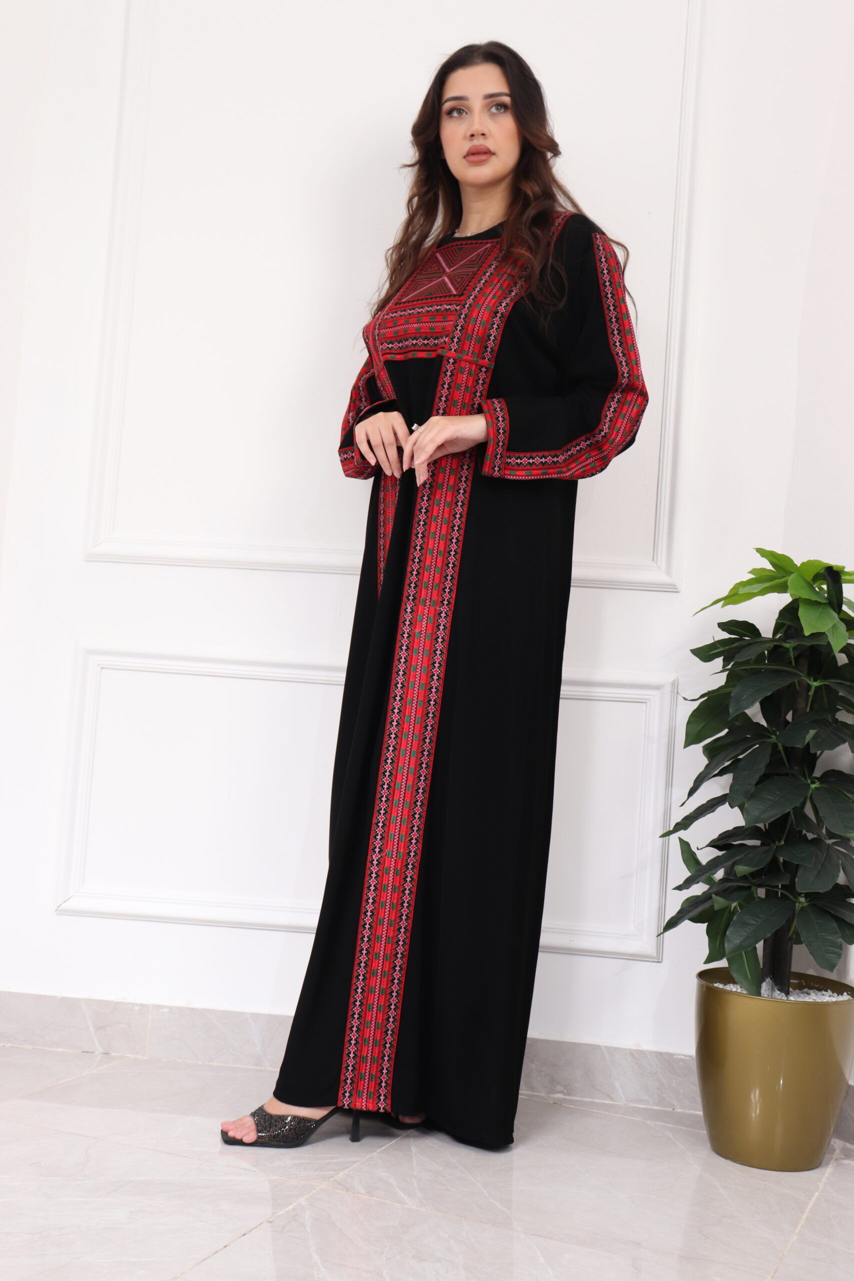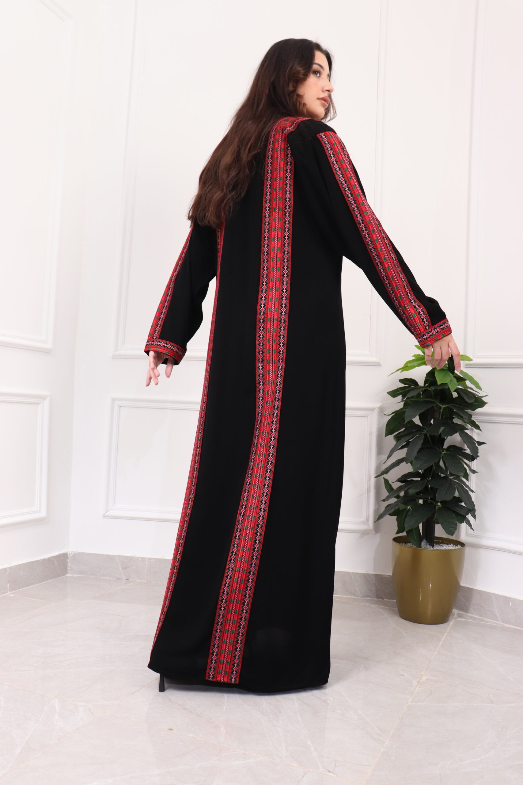 جلابية رصاصي بتطريز دقات ملونة من الأمام و اكمام وسيع