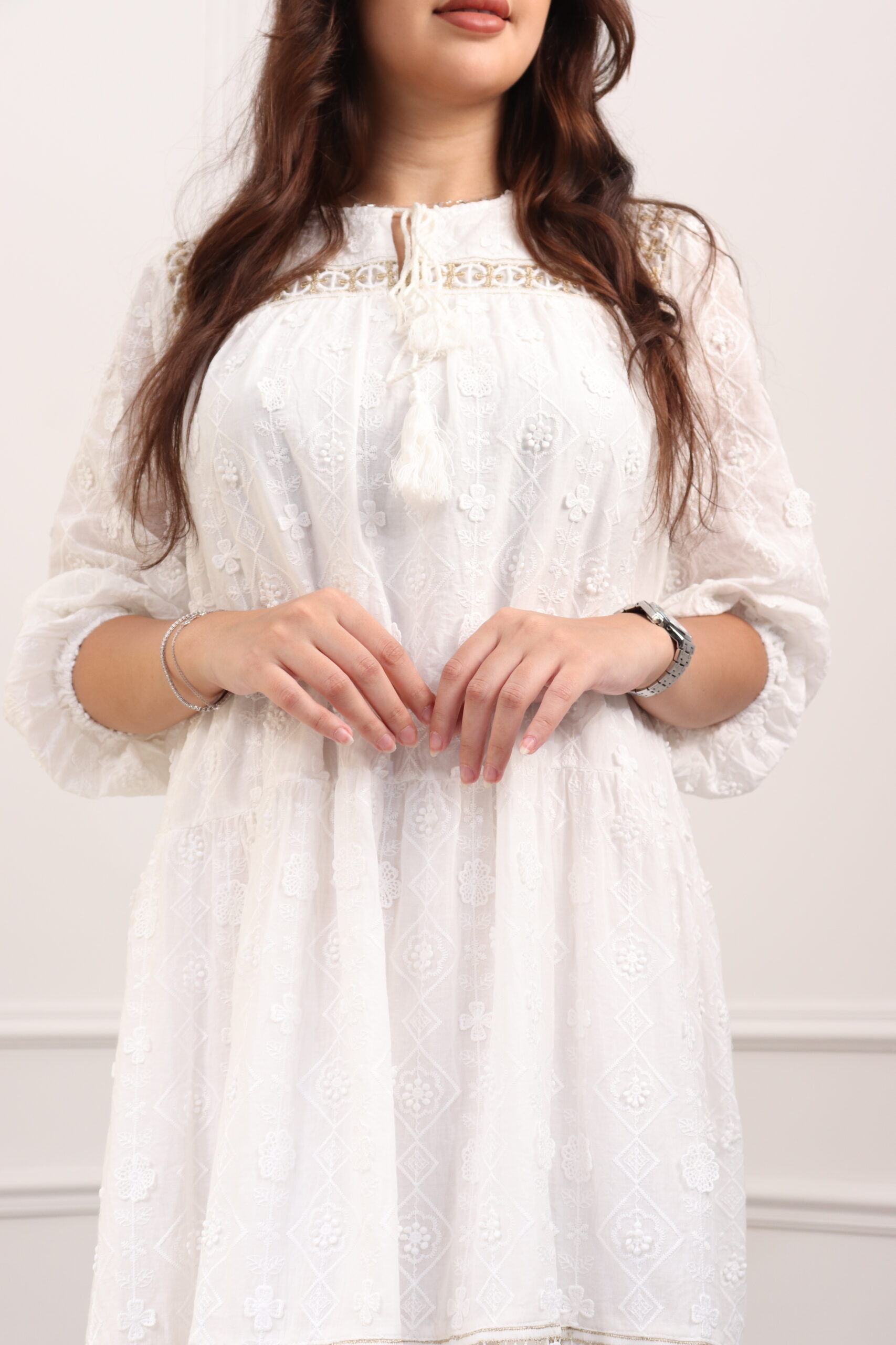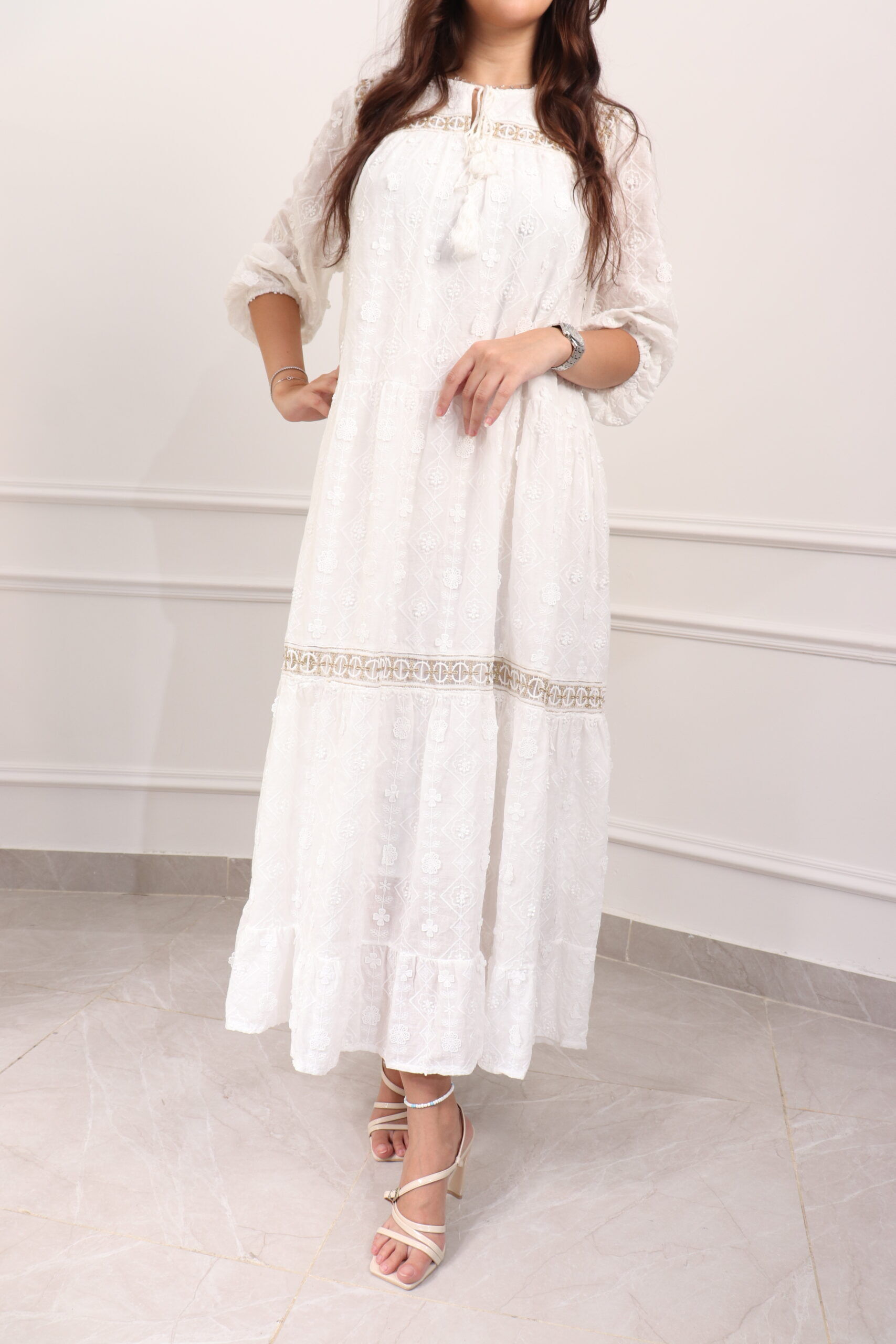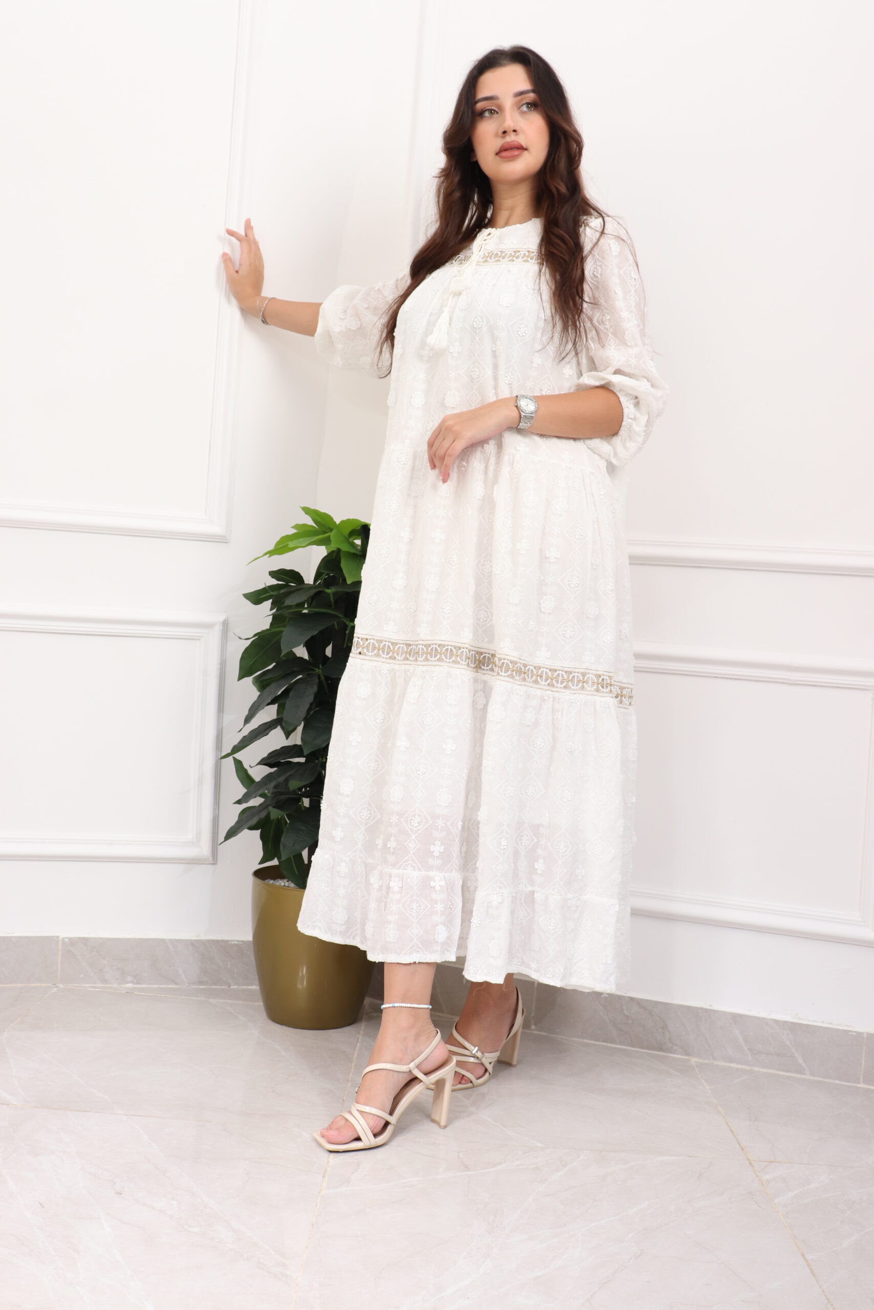 جلابيه ابيض بقماش مشجر من نفسه بكم مطاط
