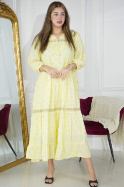 جلابيه اصفر بقماش مشجر من نفسه بكم مطاط