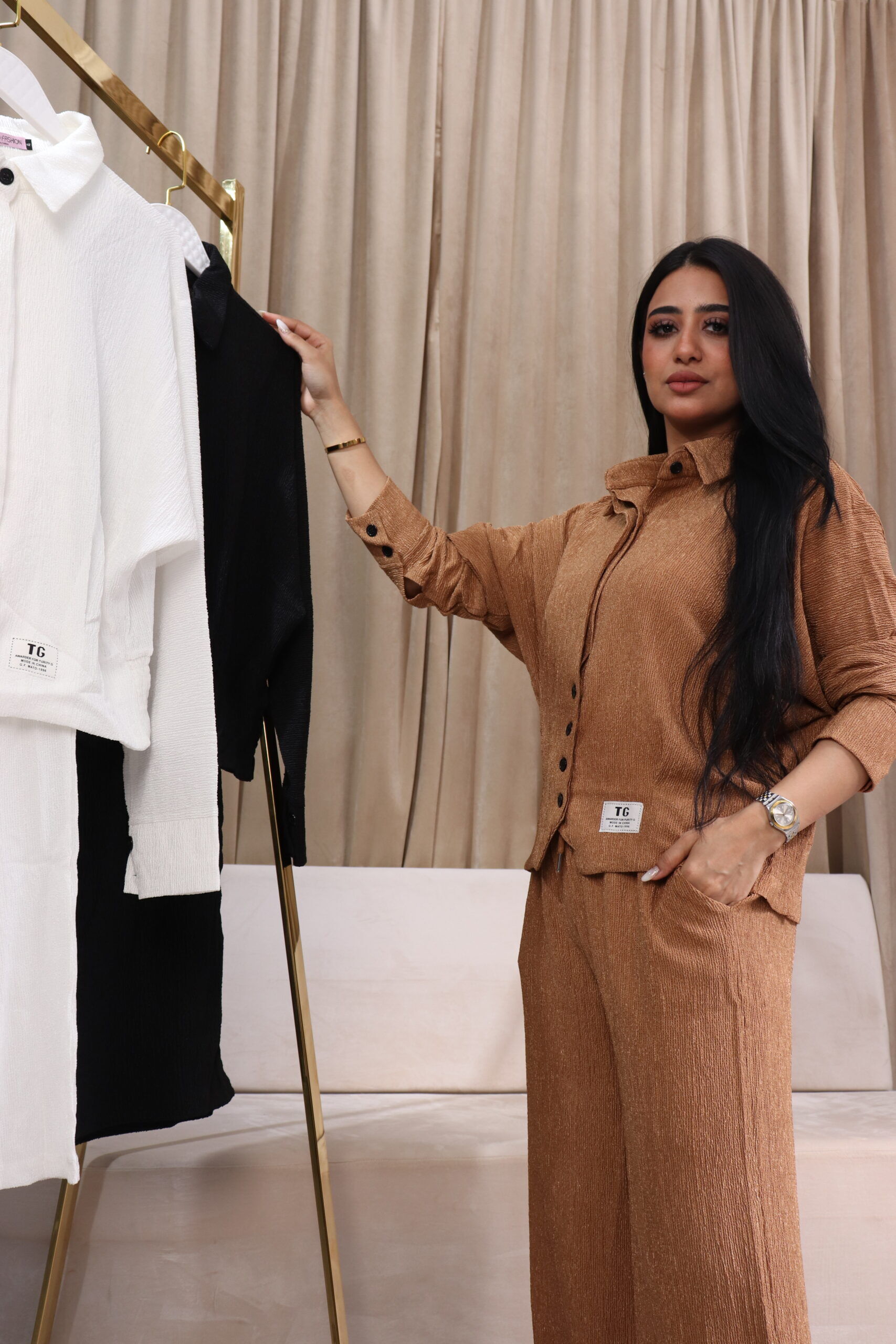 مصمم من بنطلون بلون لحمي القميص مفتوح ويغلق بأزره، اخترنا له خامة لينن لحمي من افضل الخامات العملية للبس اليومي.