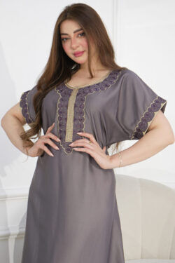 جلابية بقماش مخطط رمادي وأبيض ومطرزه من الأمام بالذهبي