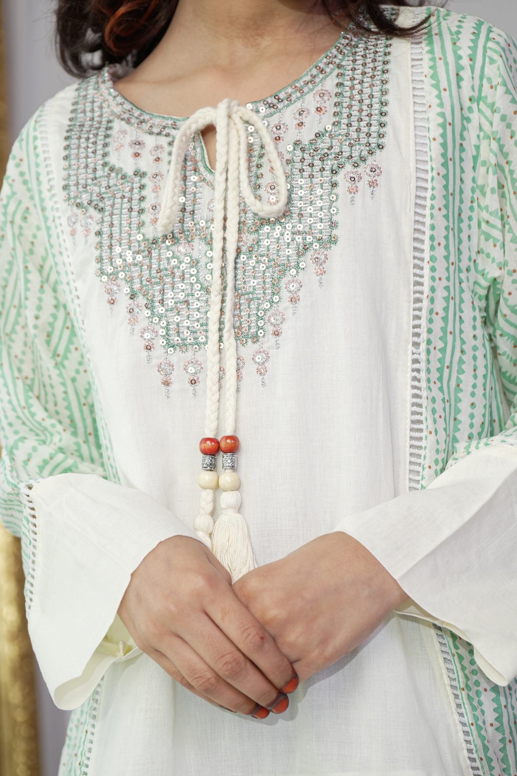 جلابيه بناتي باكمام و حلق مزينه بدقات خيوط ترتر بلونين
